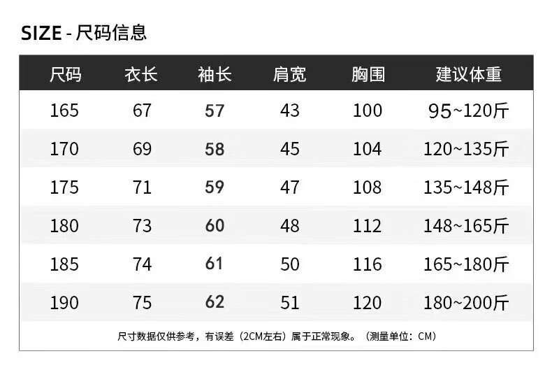 China (cm) 165 / 88-90 170 / 96-98 175 / 108-110 180 / 118-122 185 / 126-130