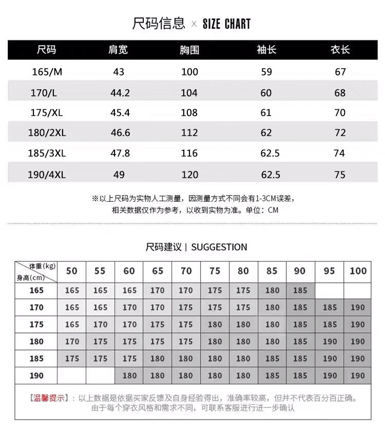 China (cm) 165 / 88-90 170 / 96-98 175 / 108-110 180 / 118-122 185 / 126-130