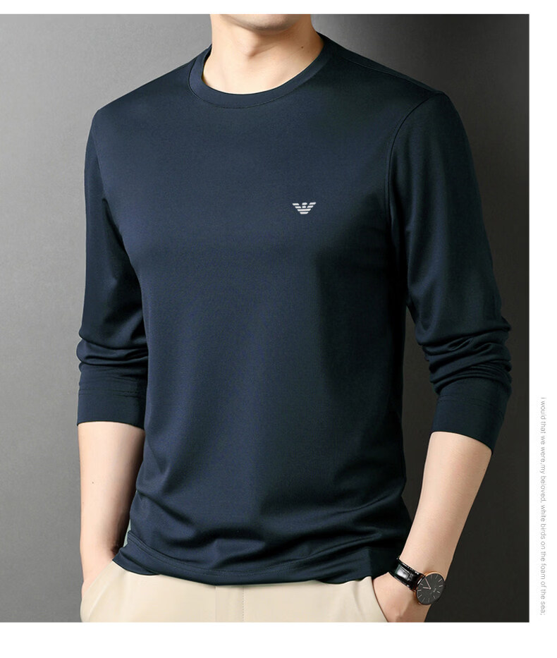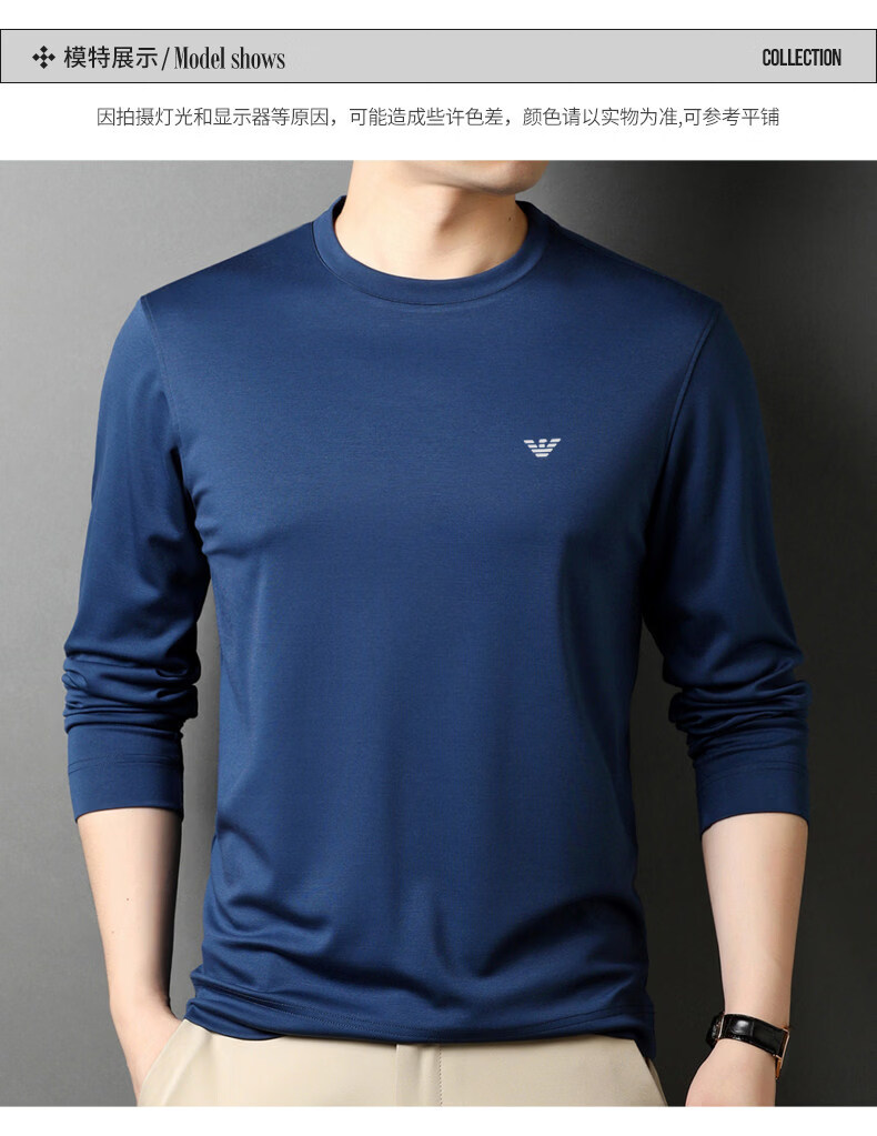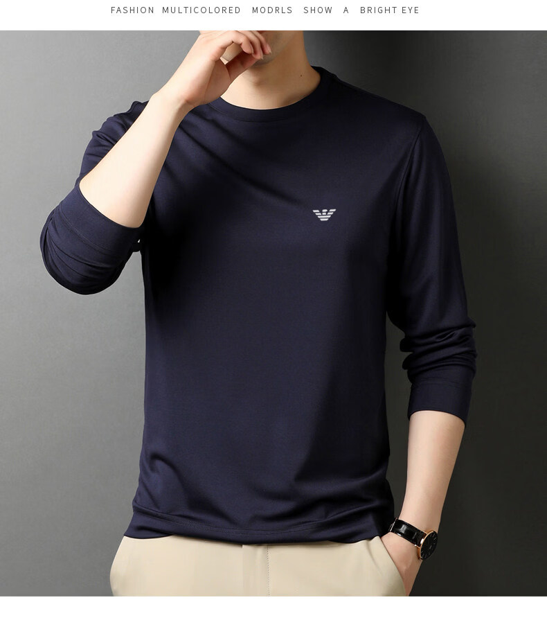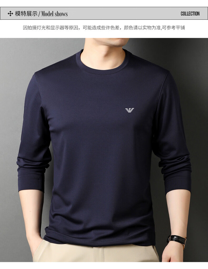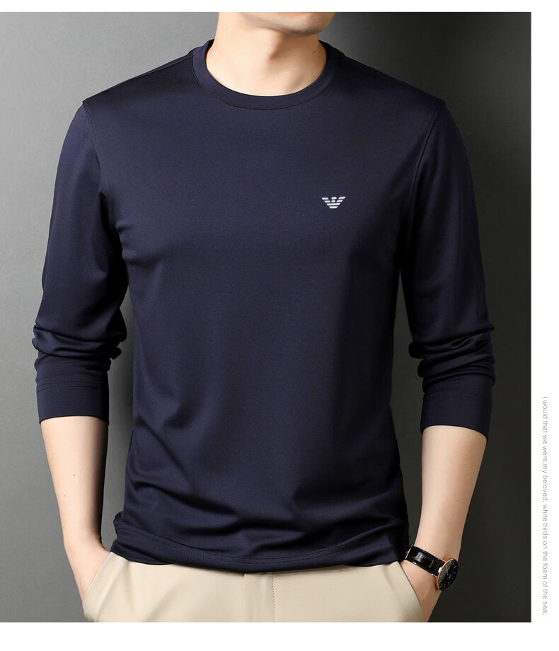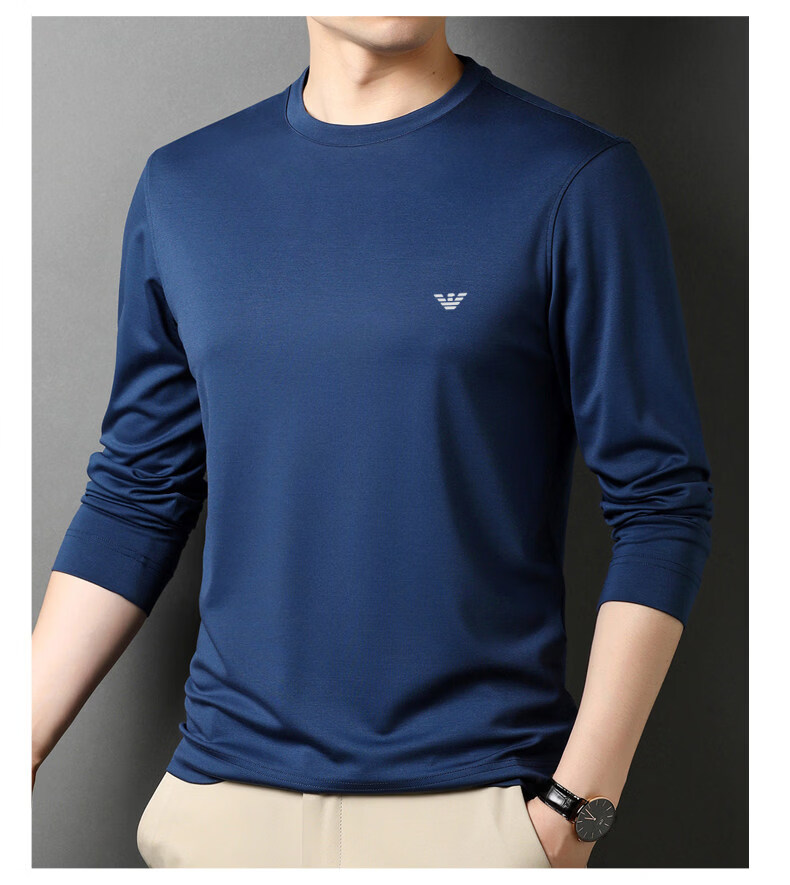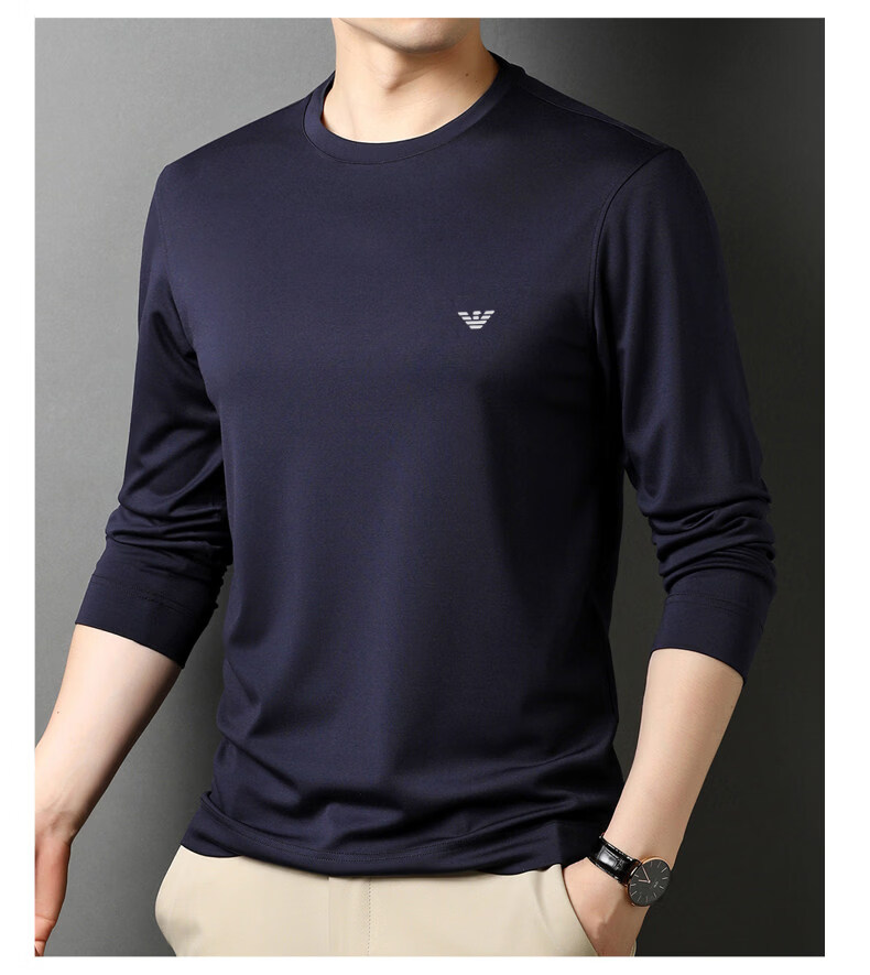 EA7 Armani solid color mulberry silk long-sleeved T-shirt men's round neck spring and autumn high-end bottoming shirt trendy dark blue M 165 recommended 95-120 Jin Jin equals 0.5 kg