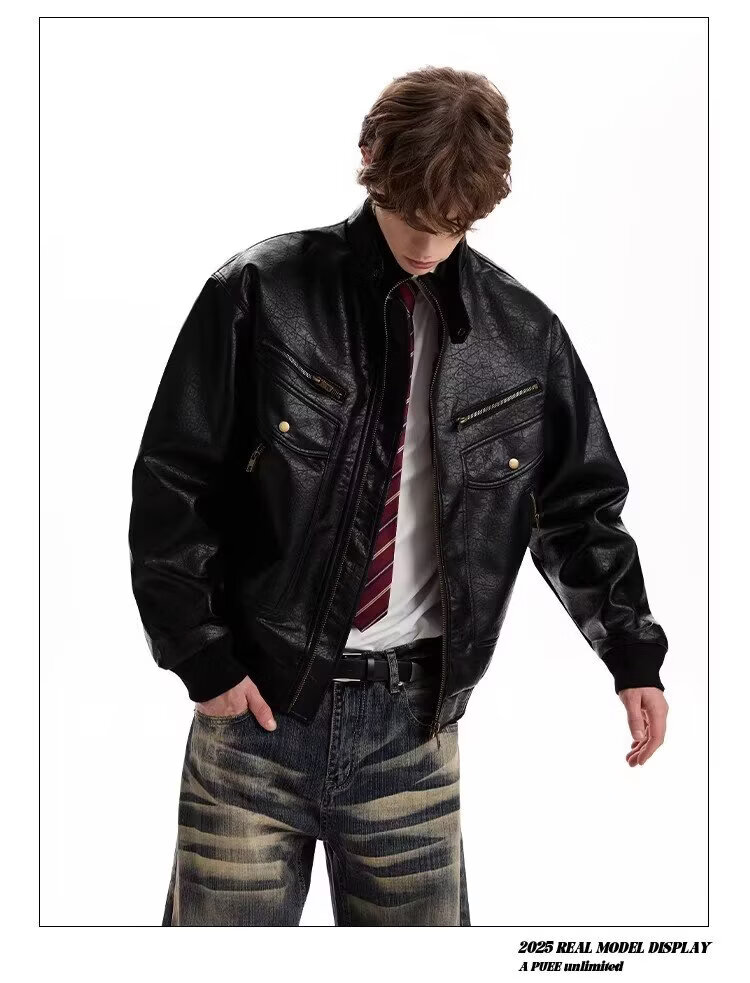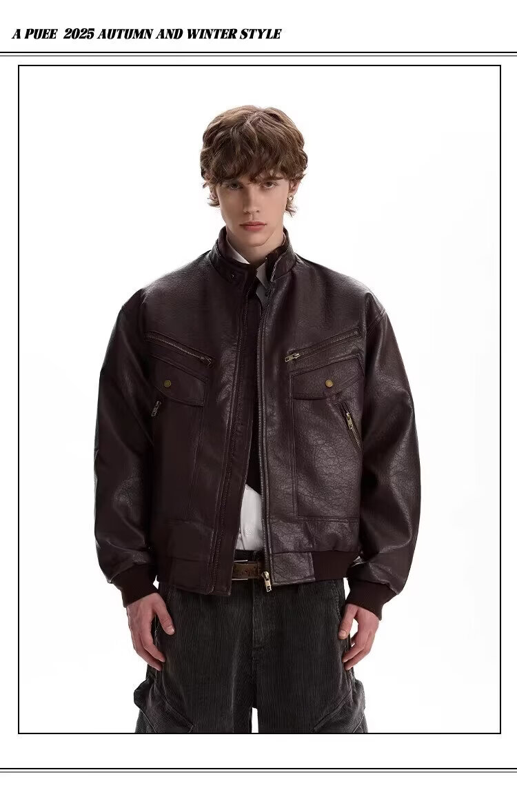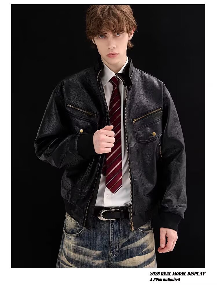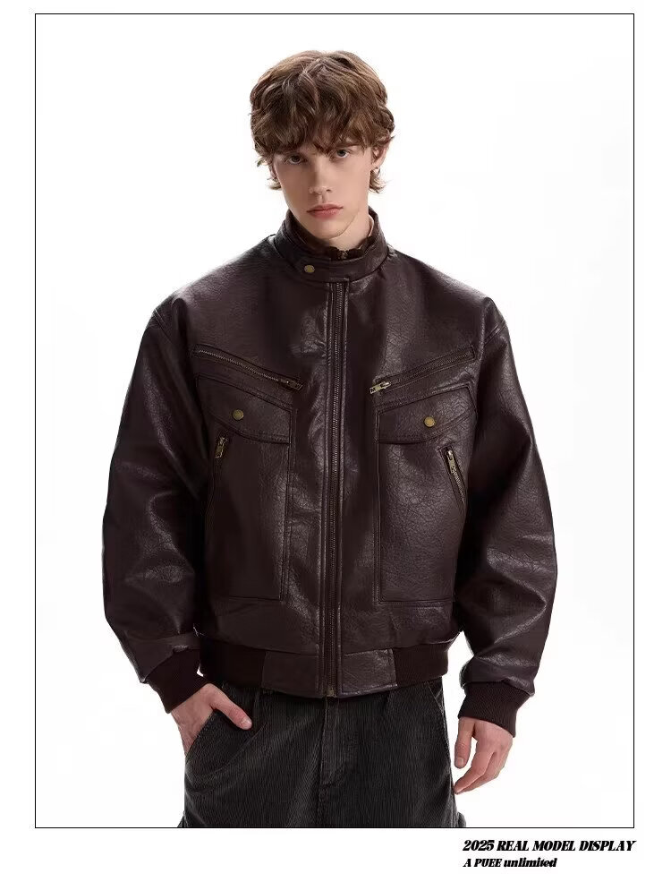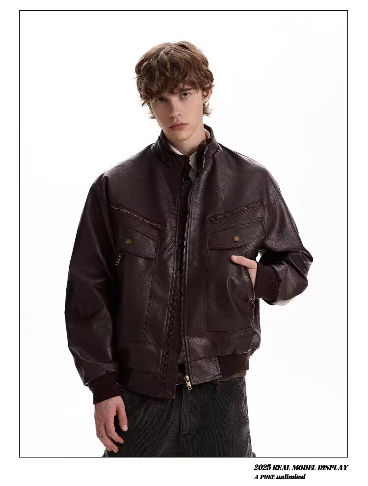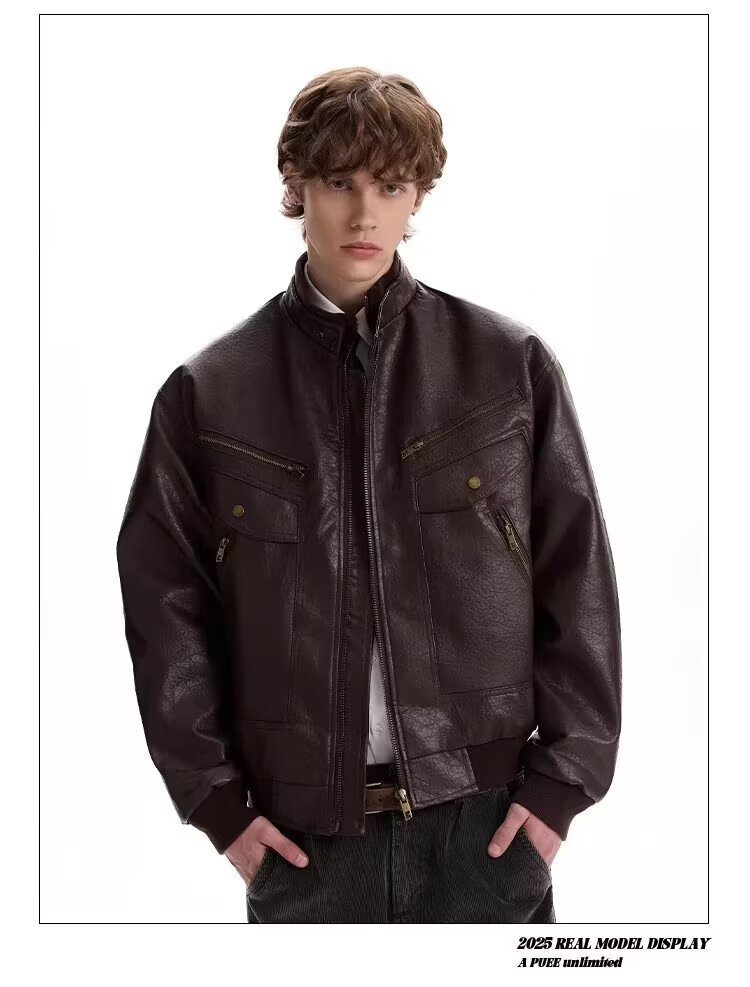 2026 American Retro Litchi Pattern PU Leather Jacket for Men and Women Spring and Autumn Boxy Profile Harrington Motorcycle Jacket Brown High Quality Large Litchi Leather L