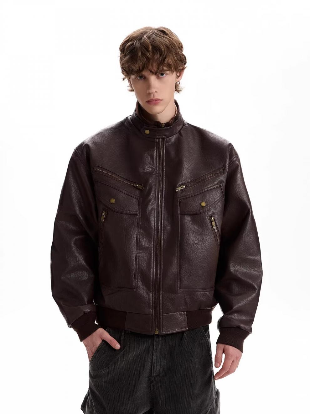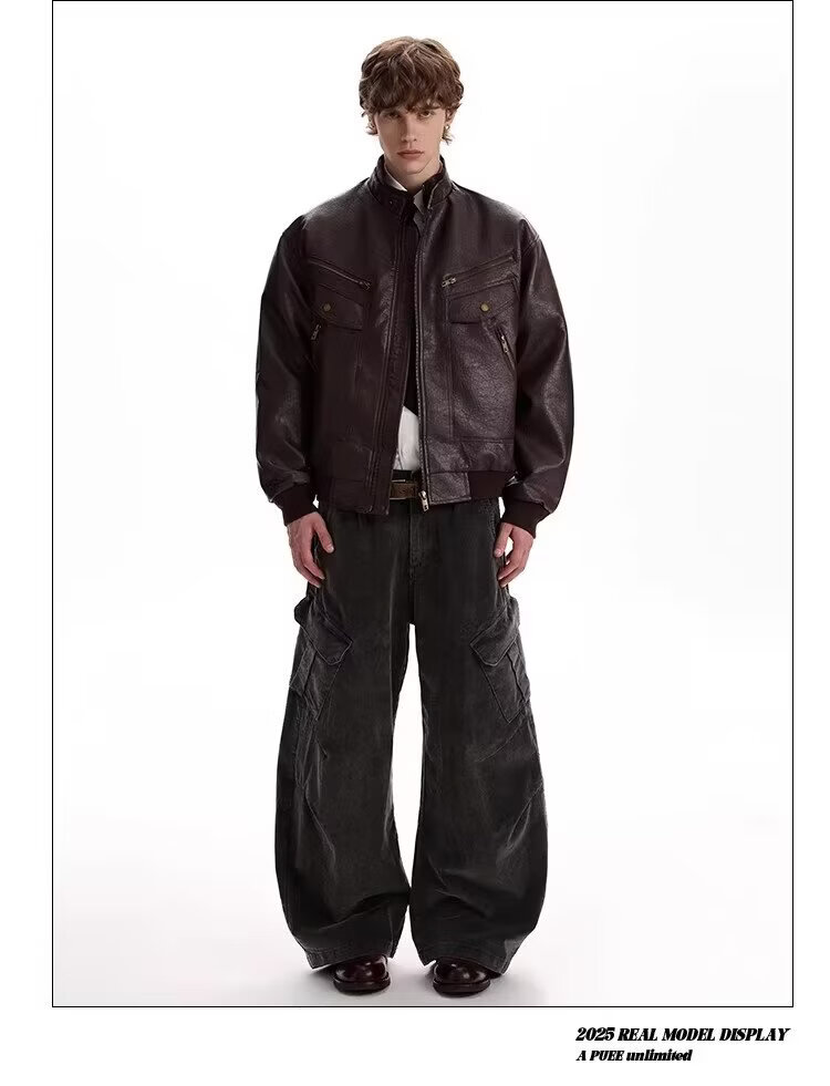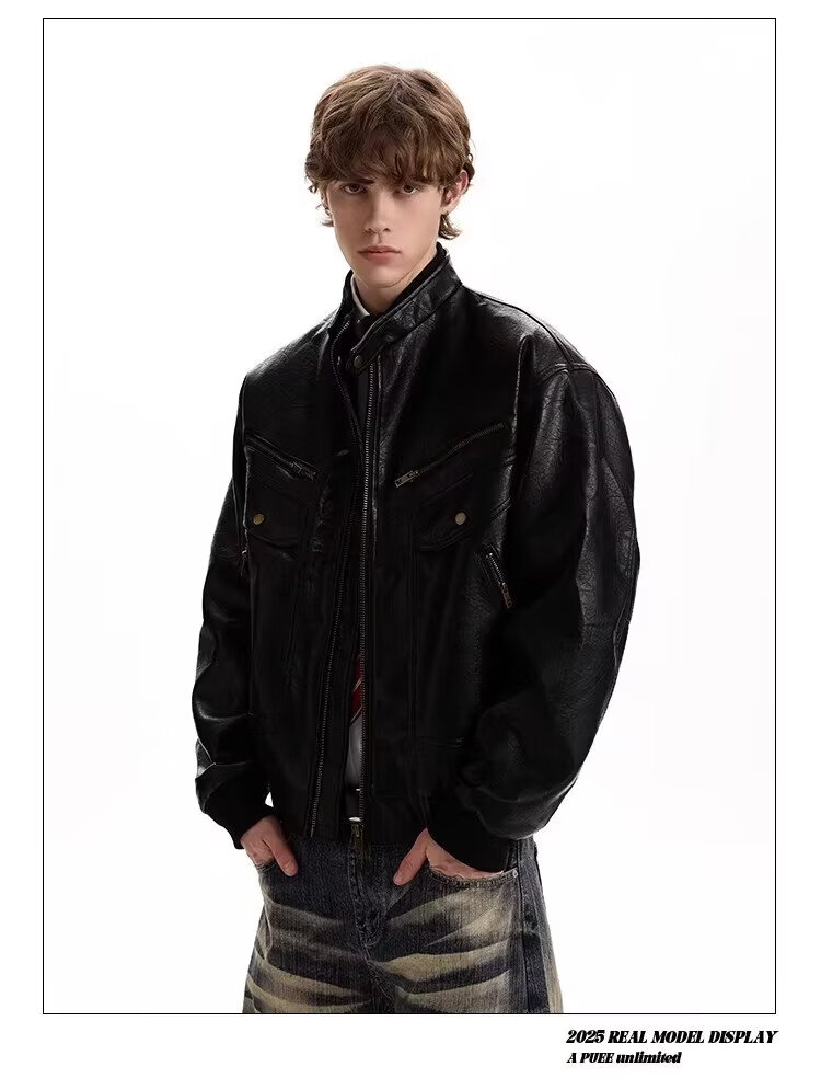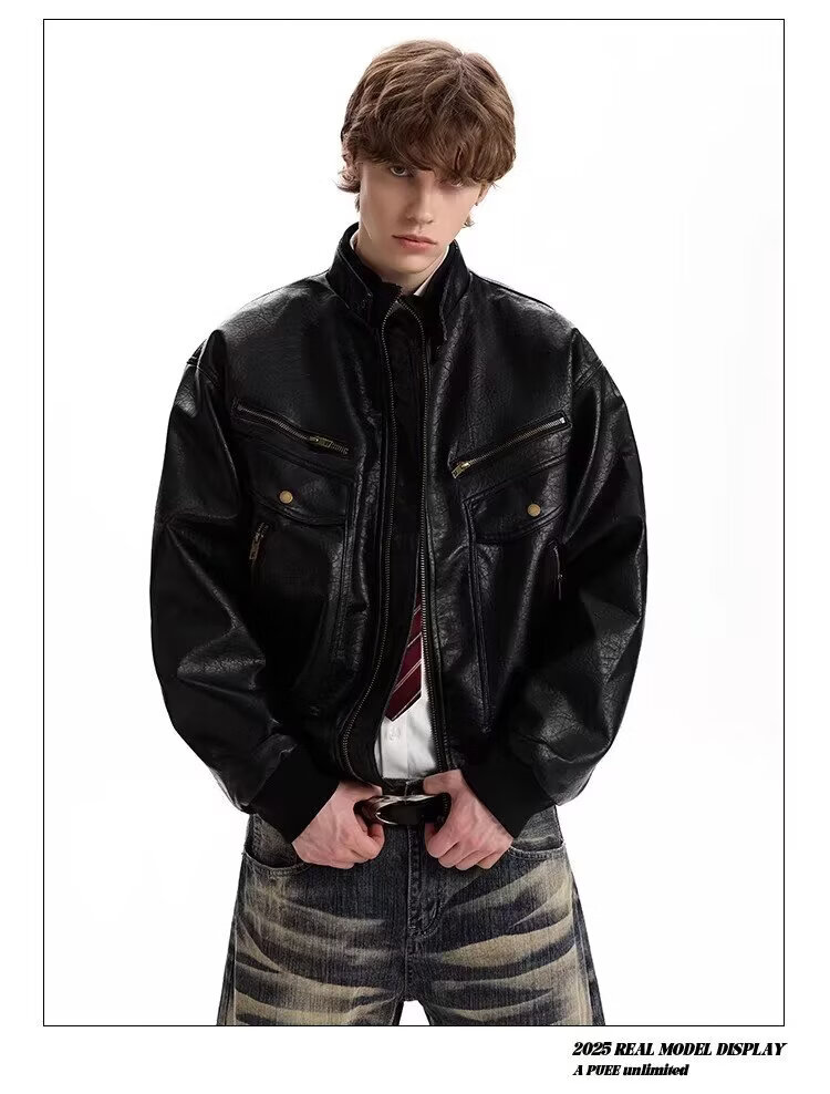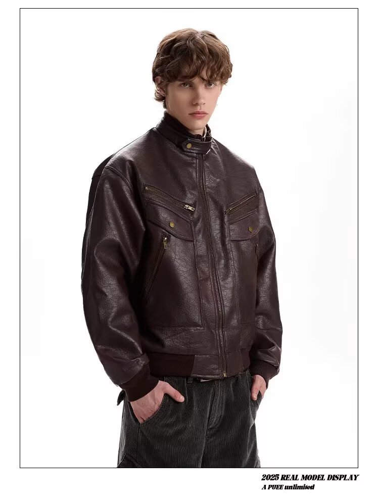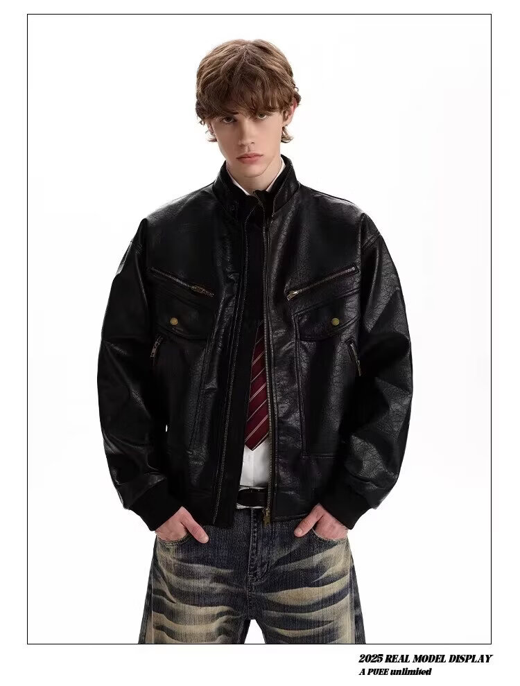 2026 American Retro Litchi Pattern PU Leather Jacket for Men and Women Spring and Autumn Boxy Profile Harrington Motorcycle Jacket Brown High Quality Large Litchi Leather L