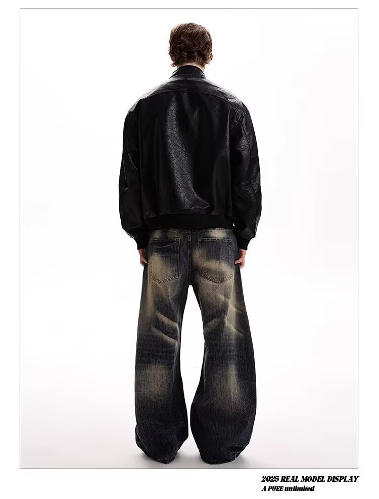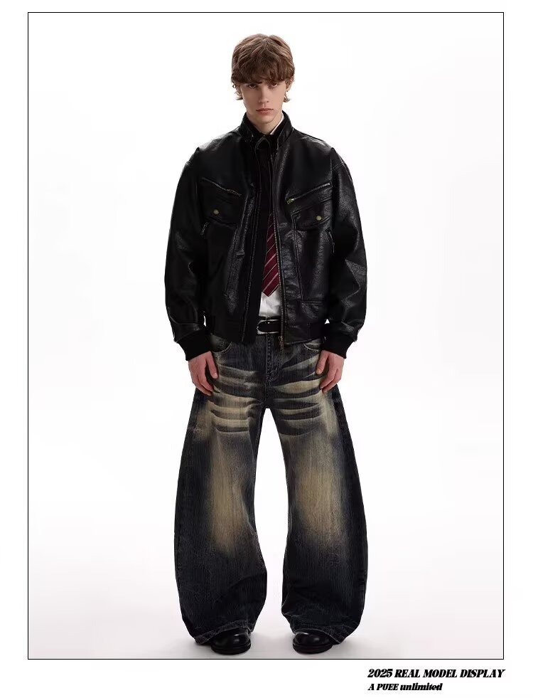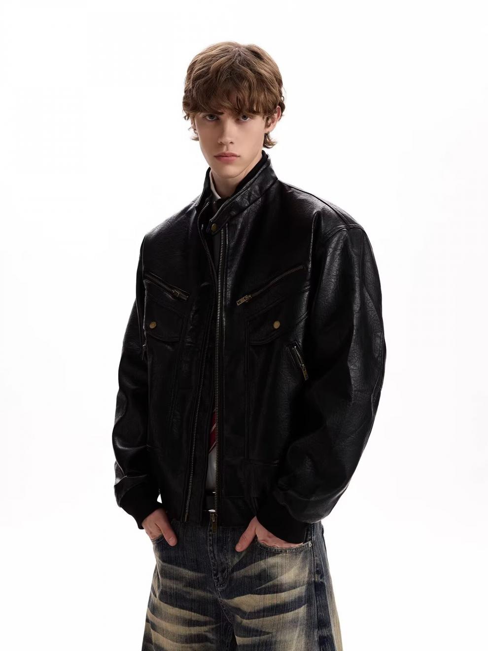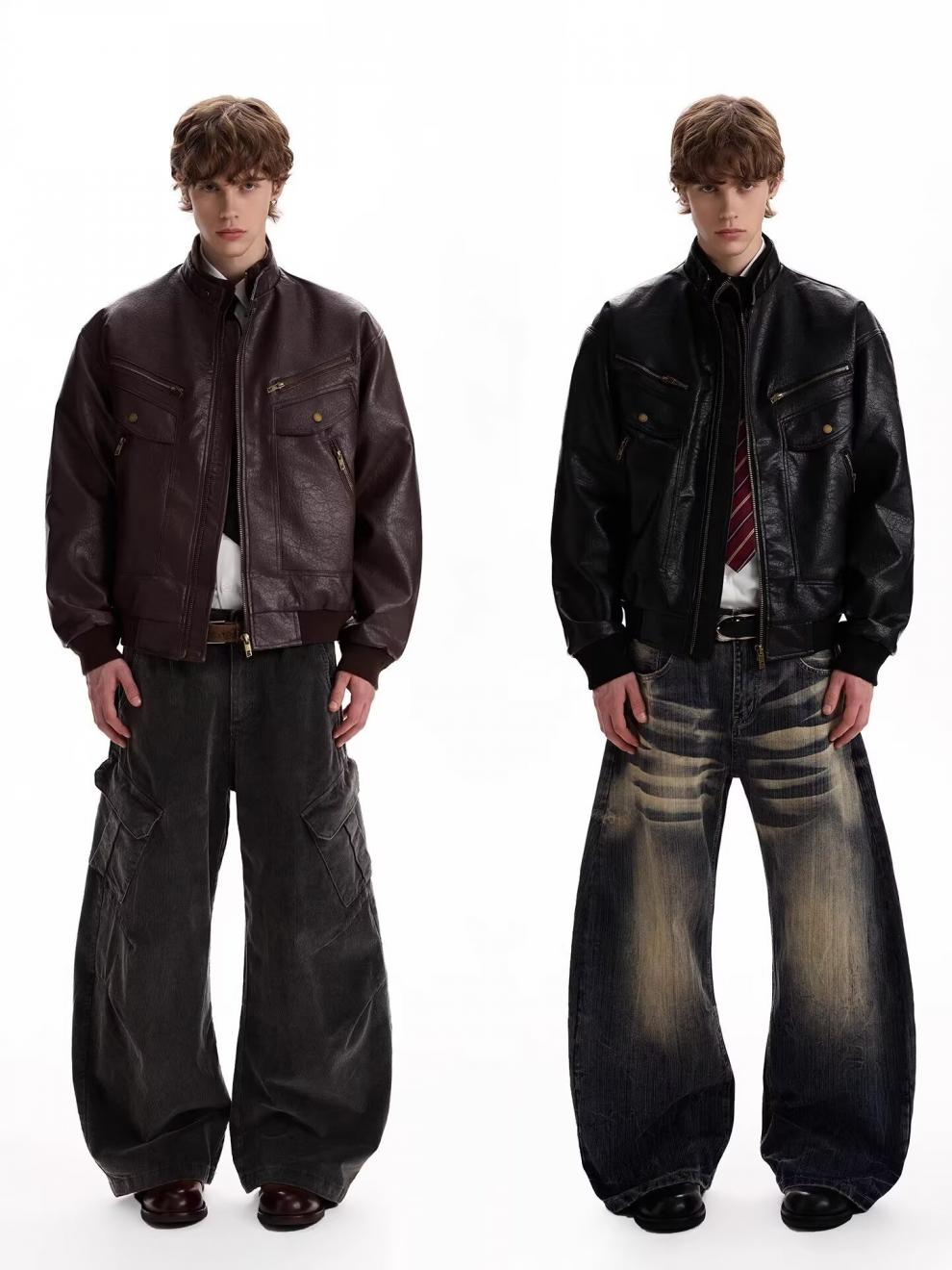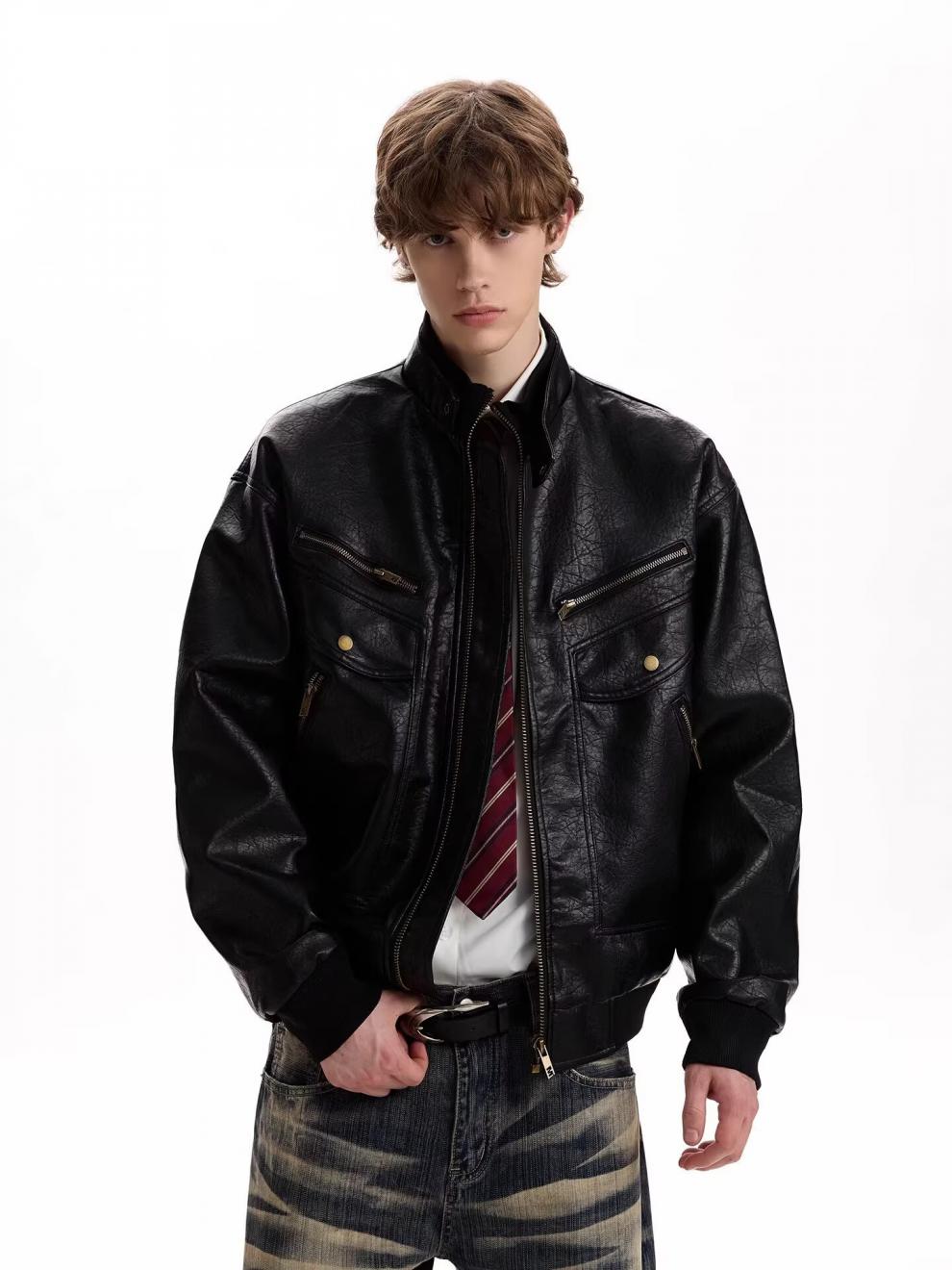 2026 American Retro Litchi Pattern PU Leather Jacket for Men and Women Spring and Autumn Boxy Profile Harrington Motorcycle Jacket Brown High Quality Large Litchi Leather L