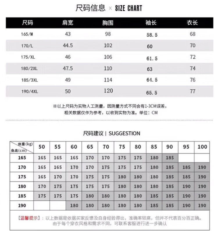 China (cm) 165 / 88-90 170 / 96-98 175 / 108-110 180 / 118-122 185 / 126-130