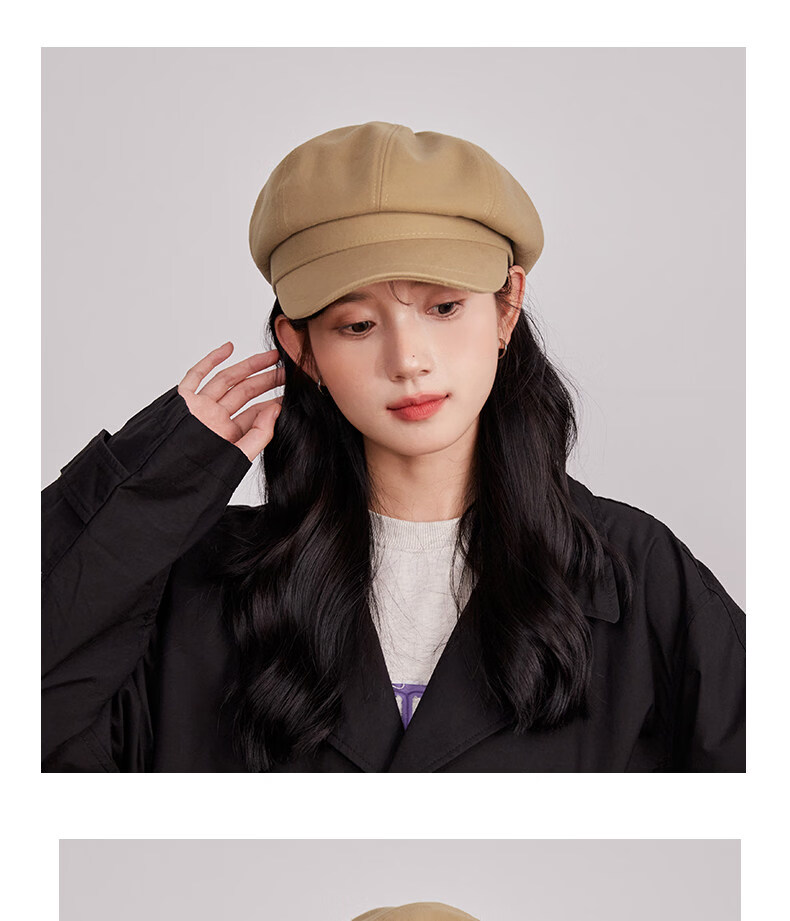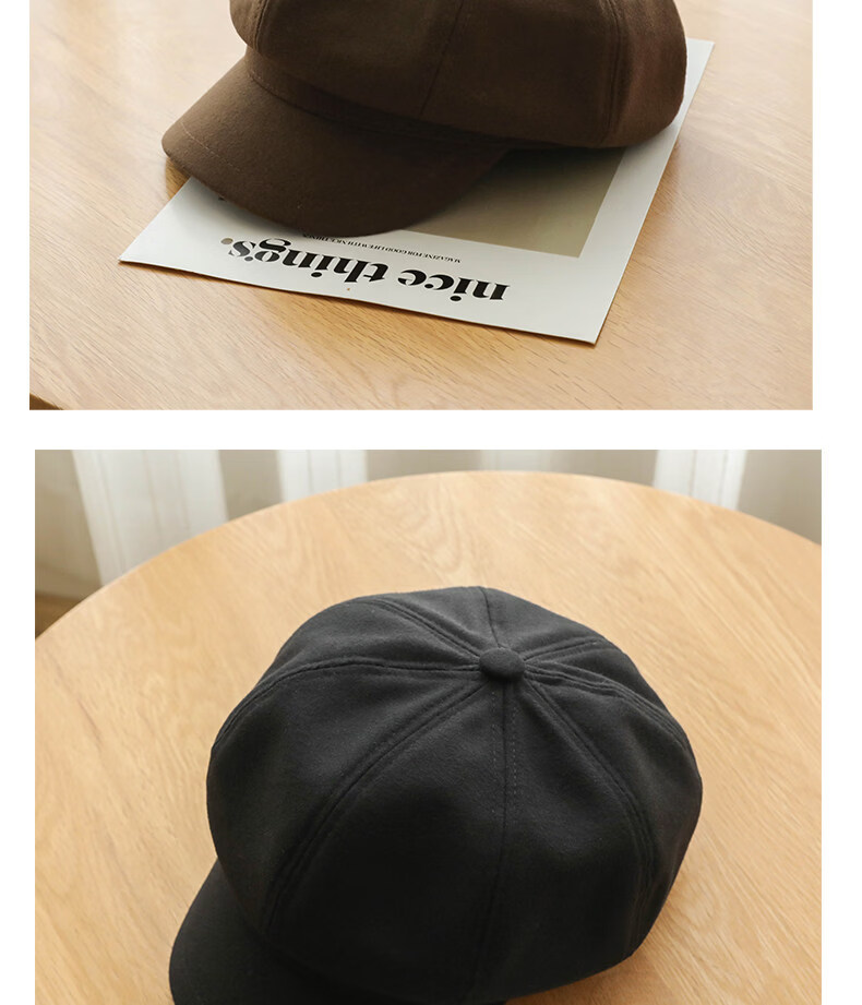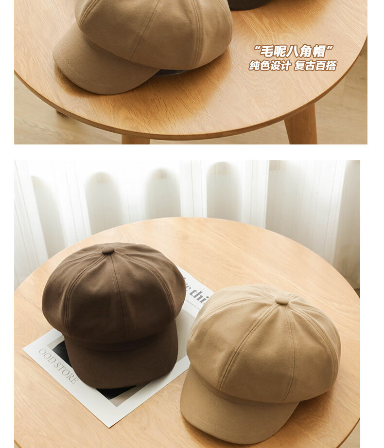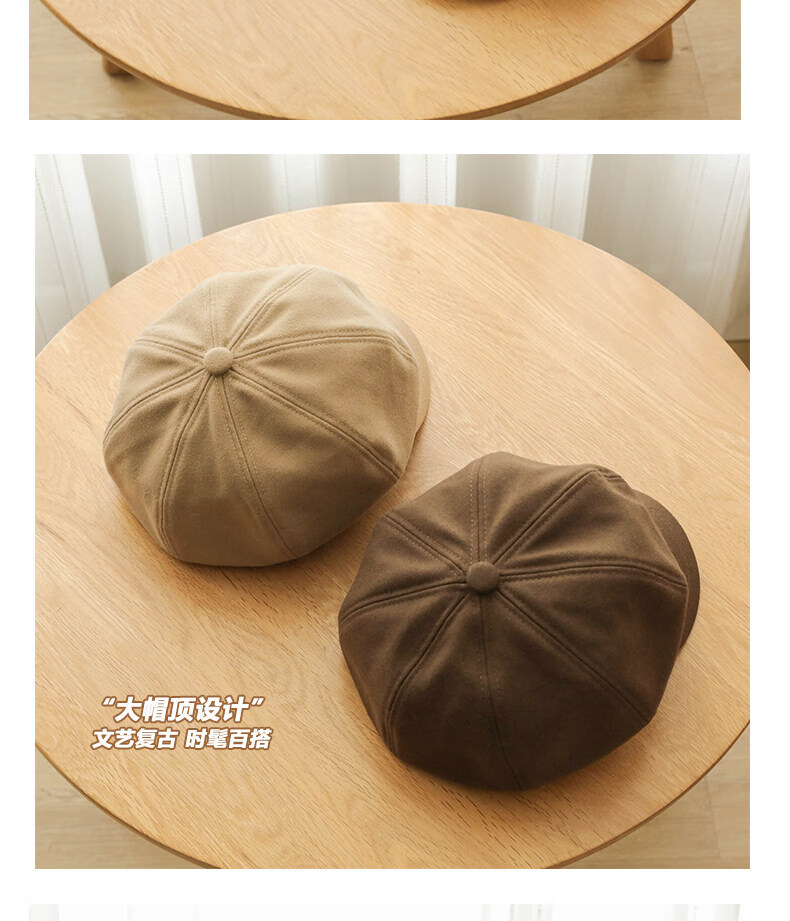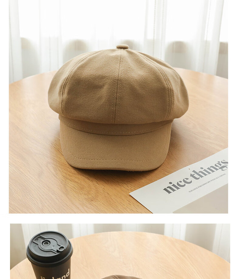 Xiaohongshu’s popular Korean style solid color woolen octagonal hat for women spring short brim beret literary retro brown apricot M one size fits all (55-59c) adjustable