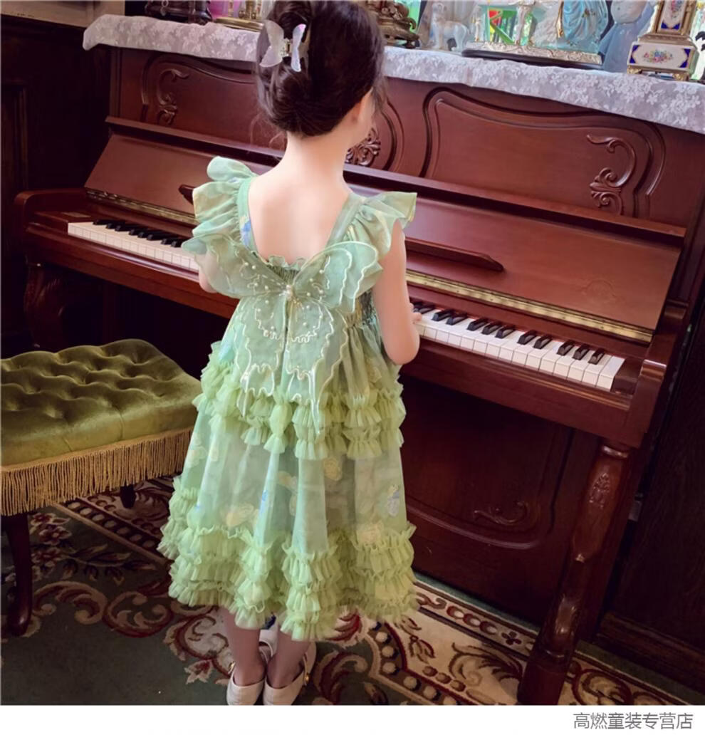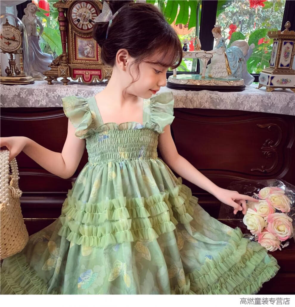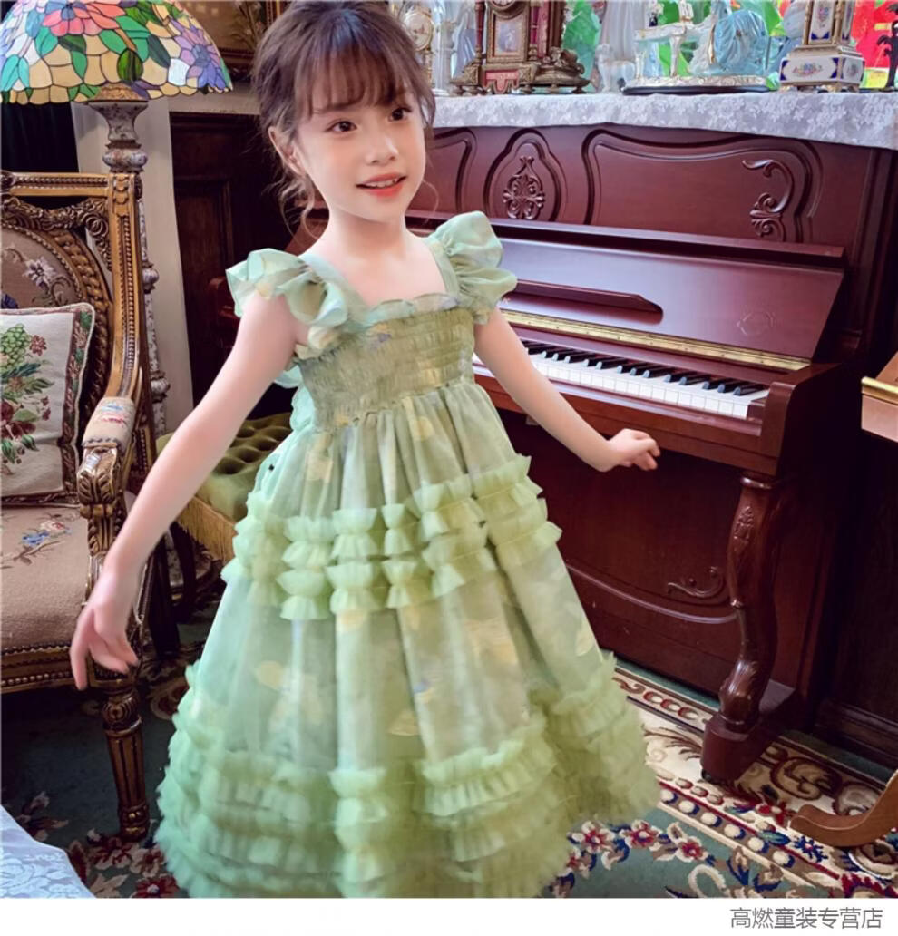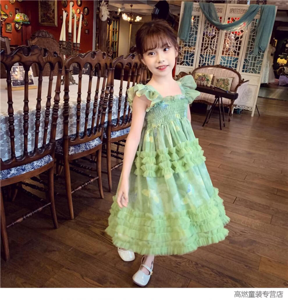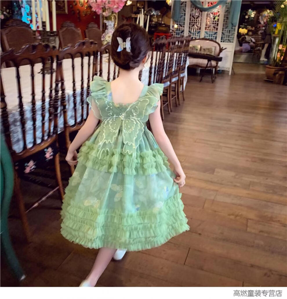 G.duck Girls Dress Summer 2026 New Children's Internet Celebrity Bow Suspender Skirt Girls Puffy Mesh Princess Skirt Green 120 cm
