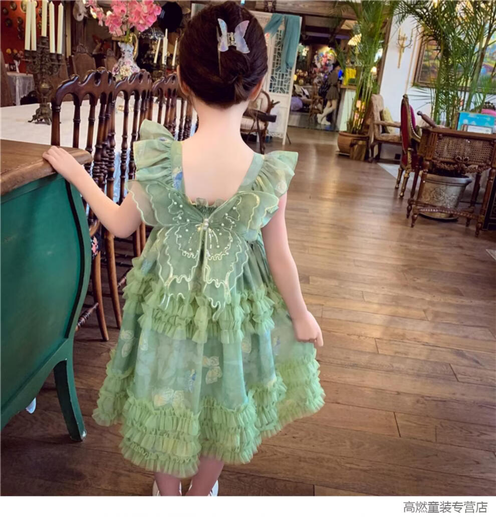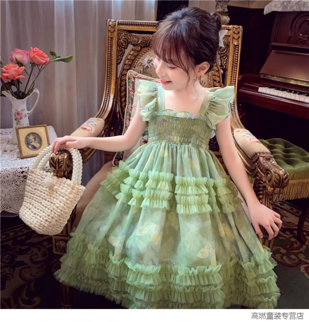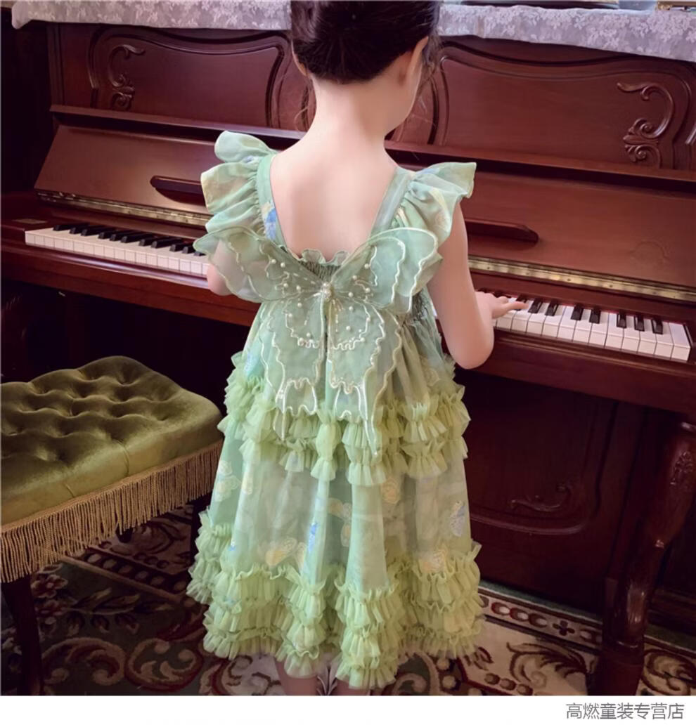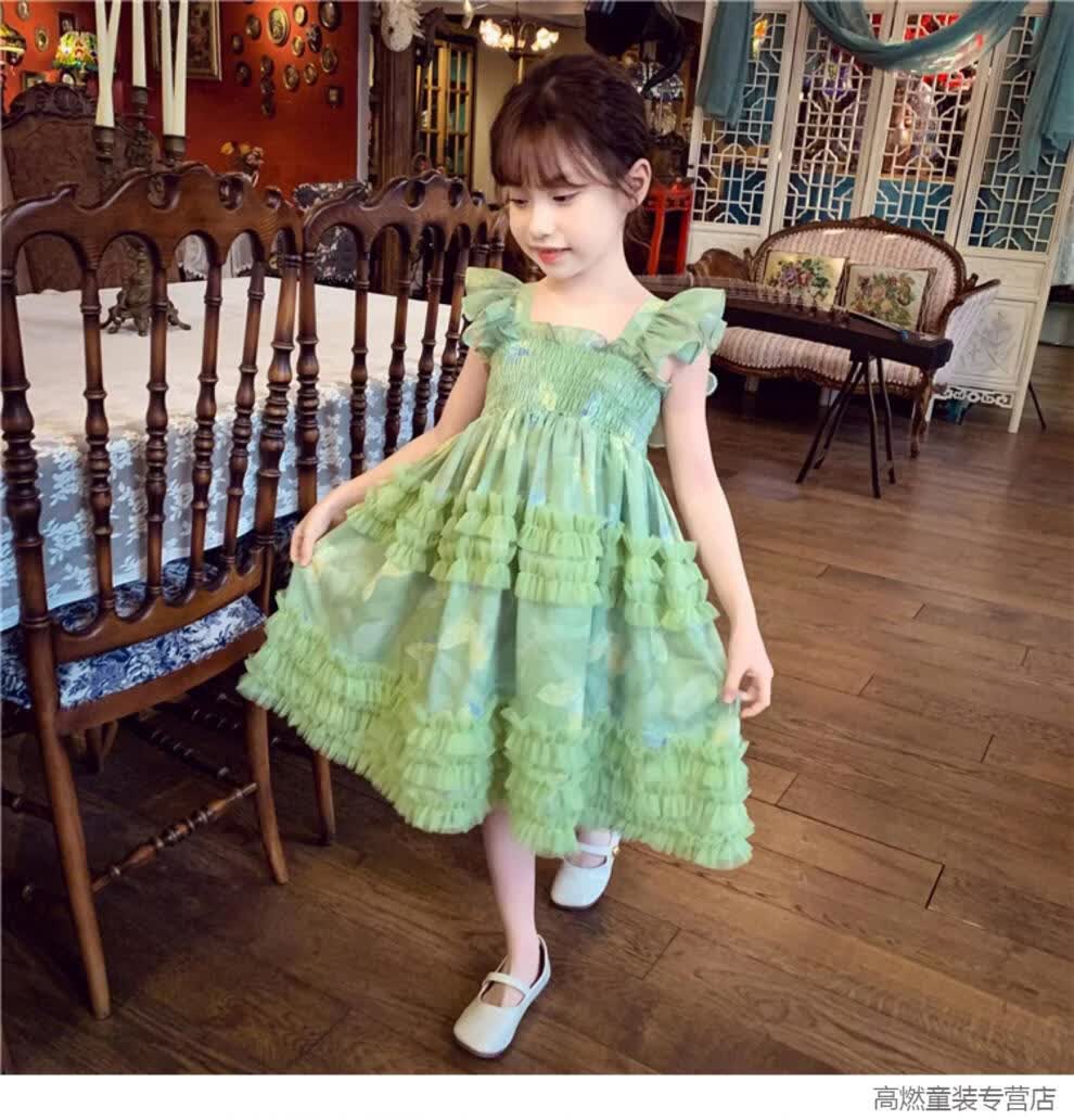 G.duck Girls Dress Summer 2026 New Children's Internet Celebrity Bow Suspender Skirt Girls Puffy Mesh Princess Skirt Green 120 cm