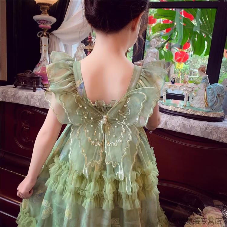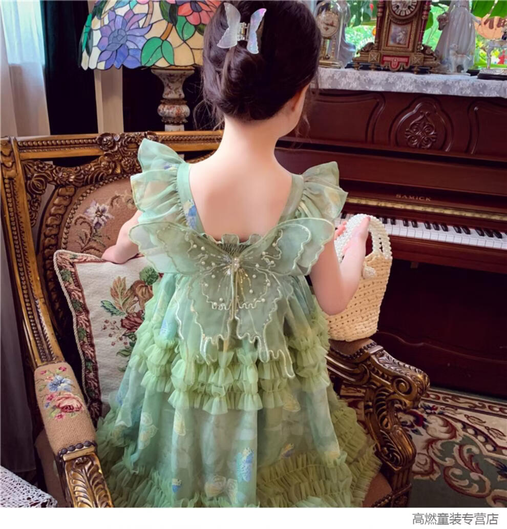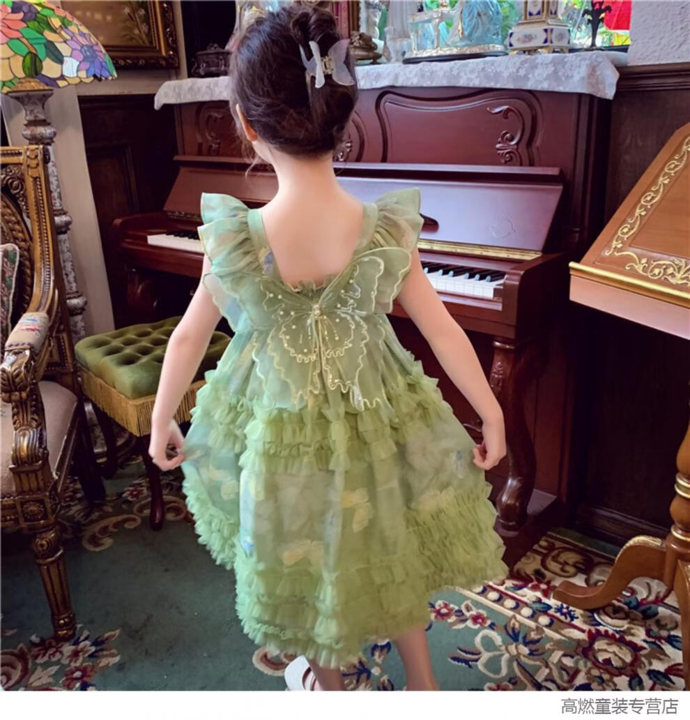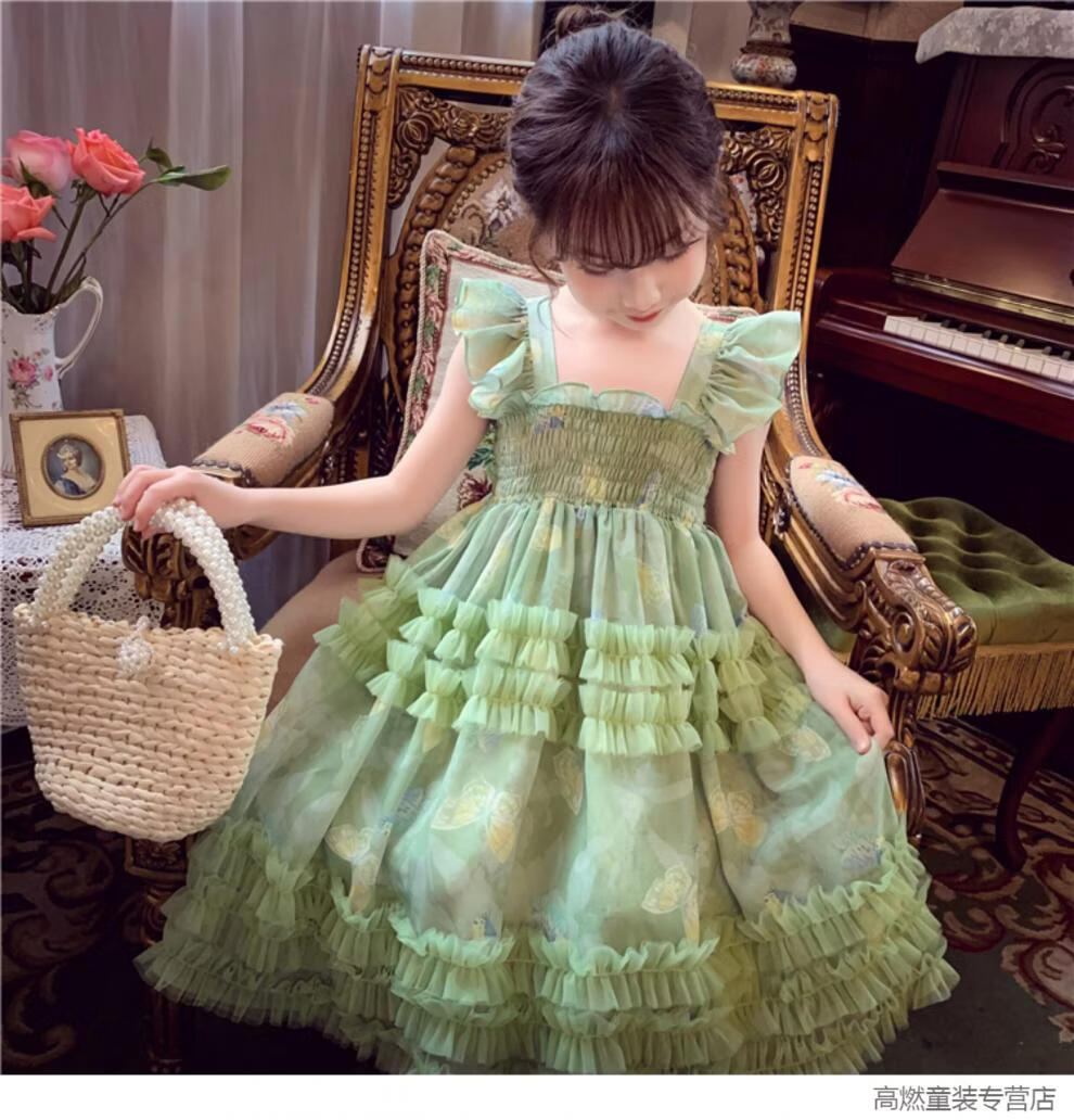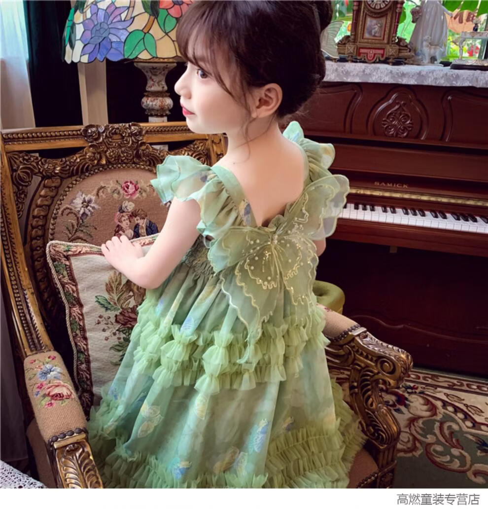 G.duck Girls Dress Summer 2026 New Children's Internet Celebrity Bow Suspender Skirt Girls Puffy Mesh Princess Skirt Green 120 cm