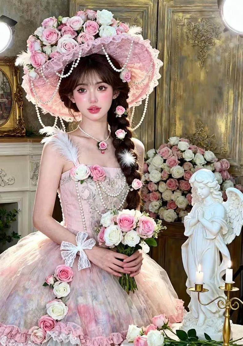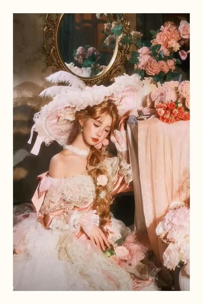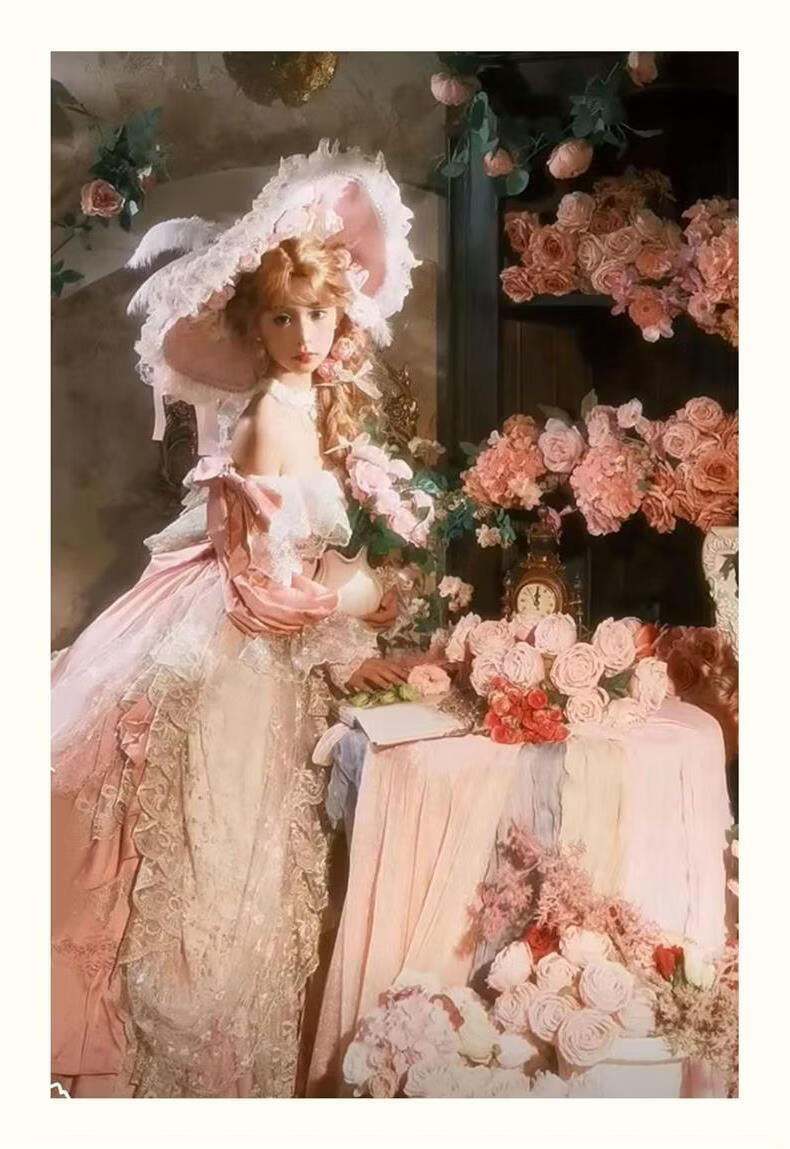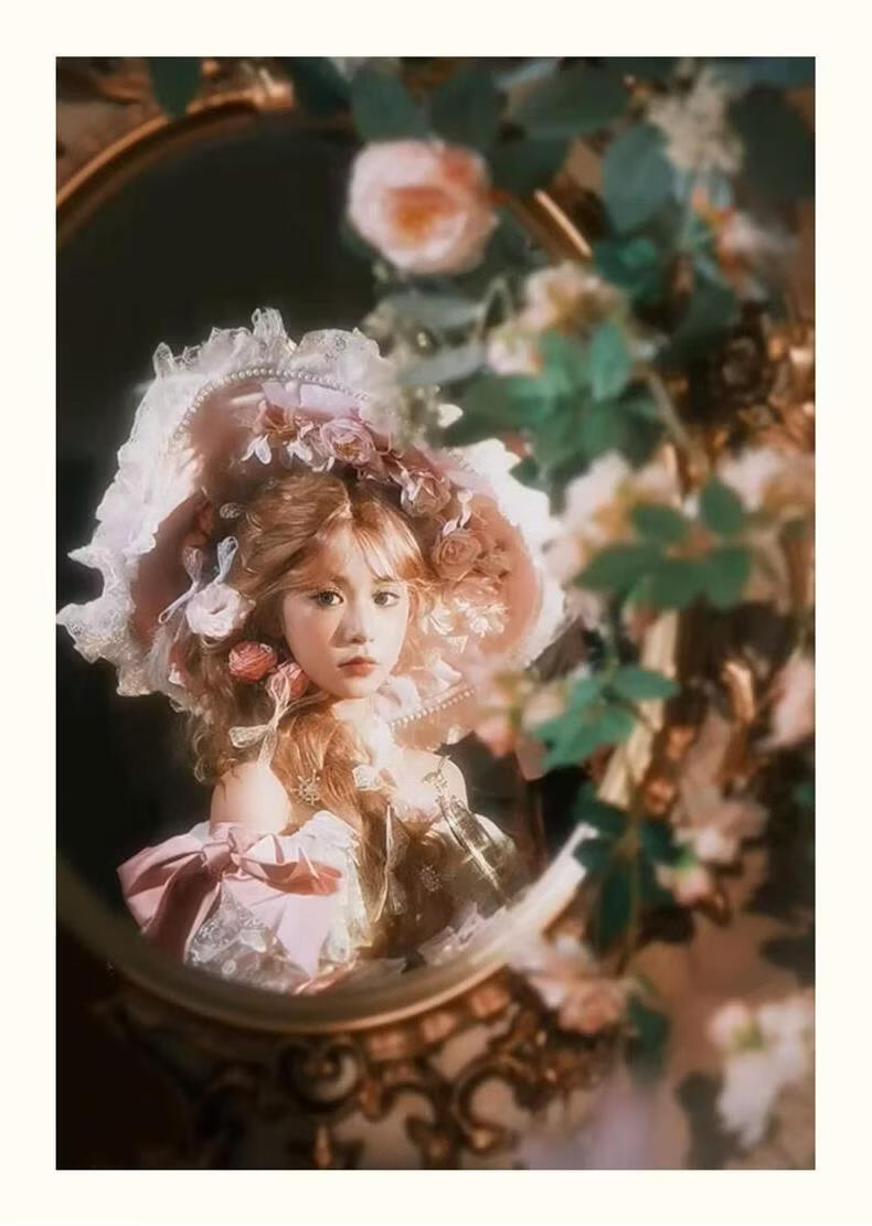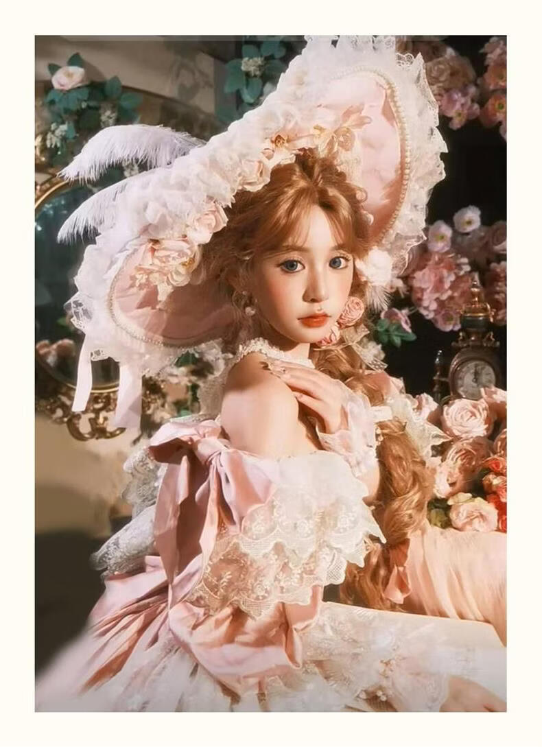 Beast Spring Pink Original Bonnet bnt Tea Party Elegant Heavy Industry Lolita Small Things Lace Rose Big Brim Hat Feather Flowers) Lace Pink Big Brim Hat M (56-58cm)