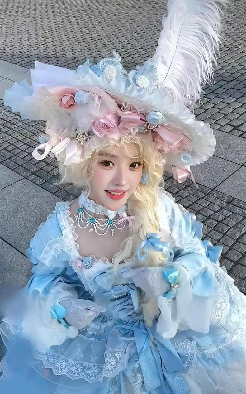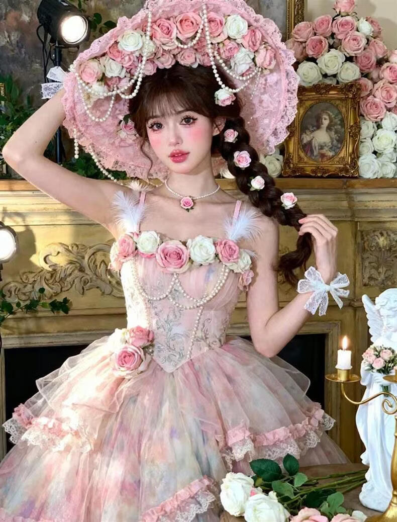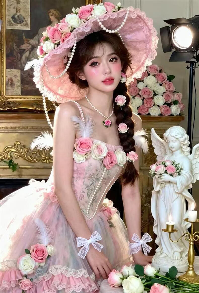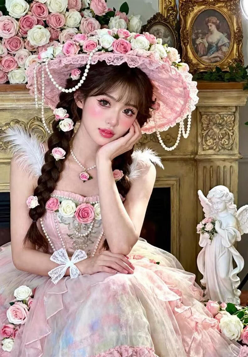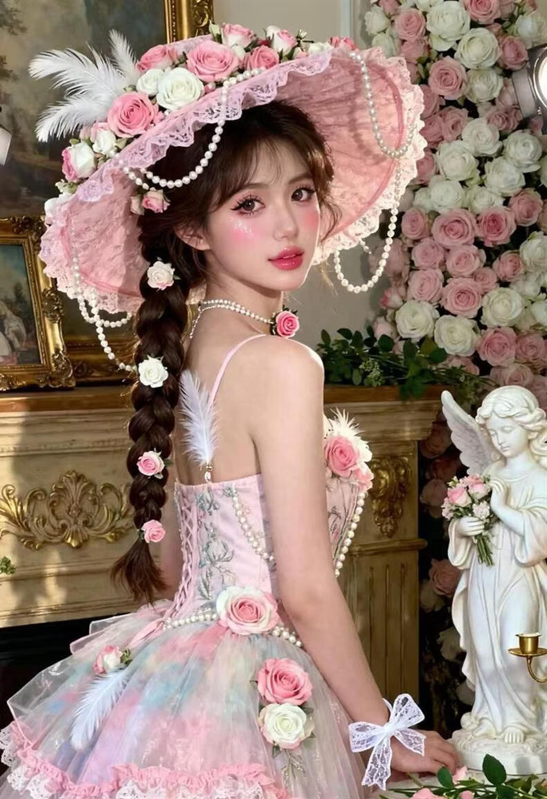 Beast Spring Pink Original Bonnet bnt Tea Party Elegant Heavy Industry Lolita Small Things Lace Rose Big Brim Hat Feather Flowers) Lace Pink Big Brim Hat M (56-58cm)