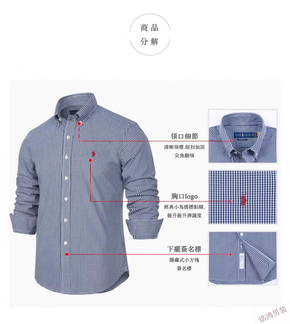 RL Ralph Lauren 2026 new business casual plaid long-sleeved shirt pure cotton men's shirt Sapphire XS 100-120Jin Jin equals 0.5 kg