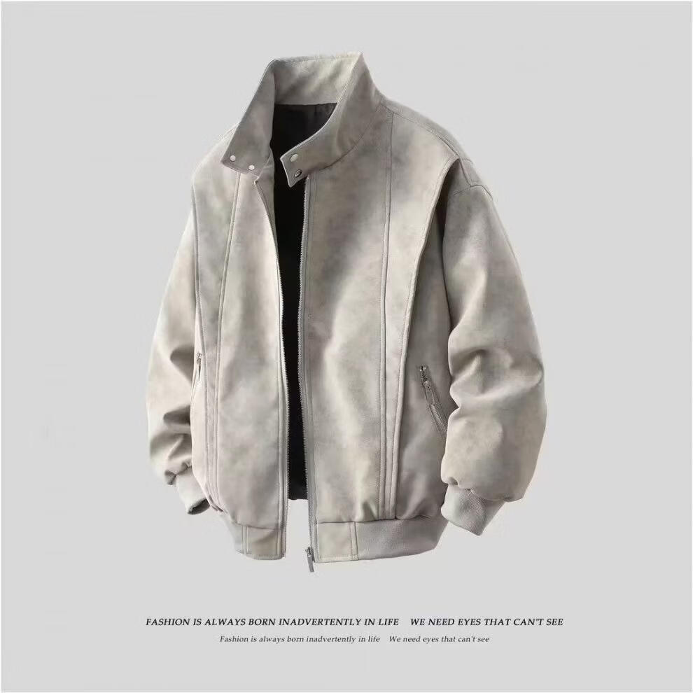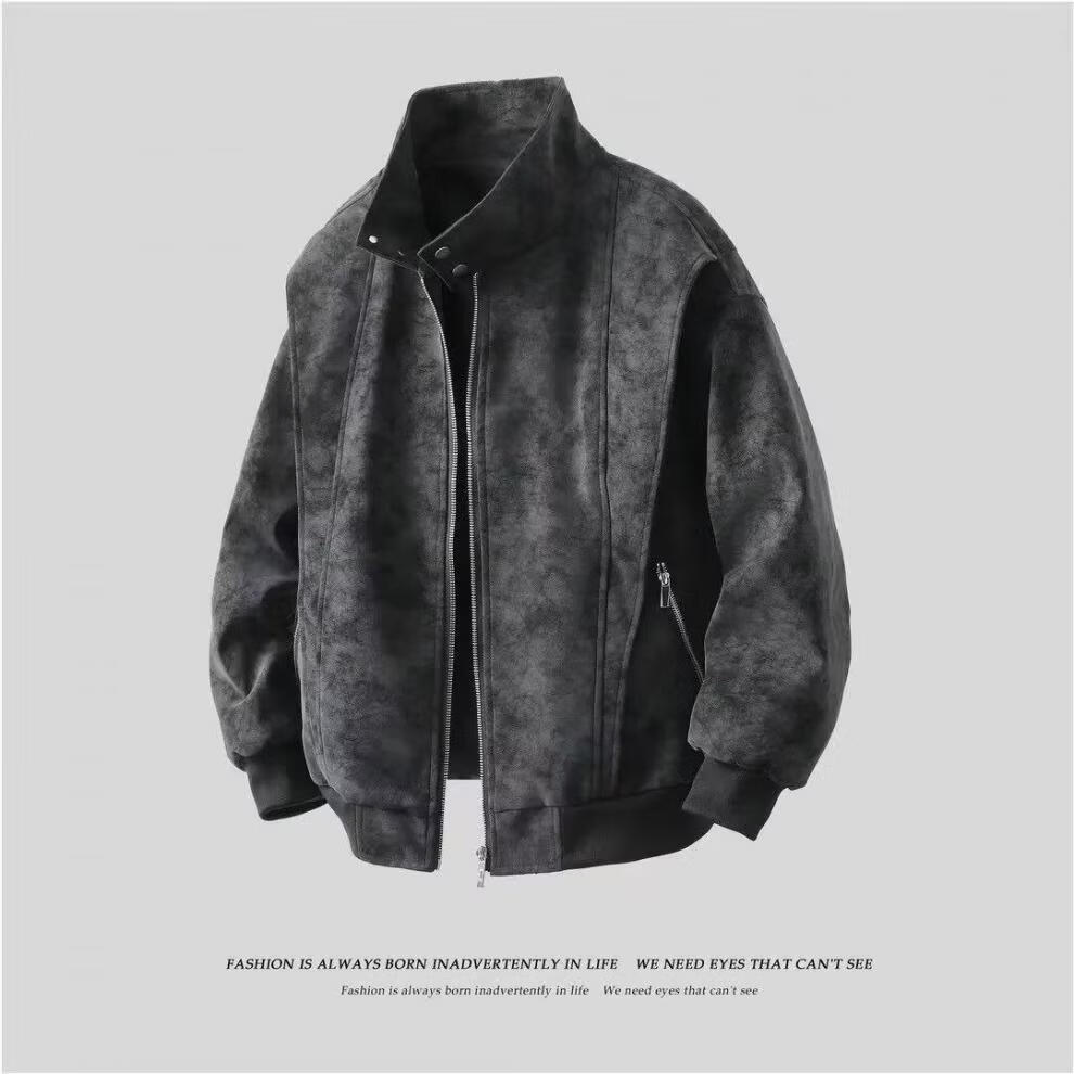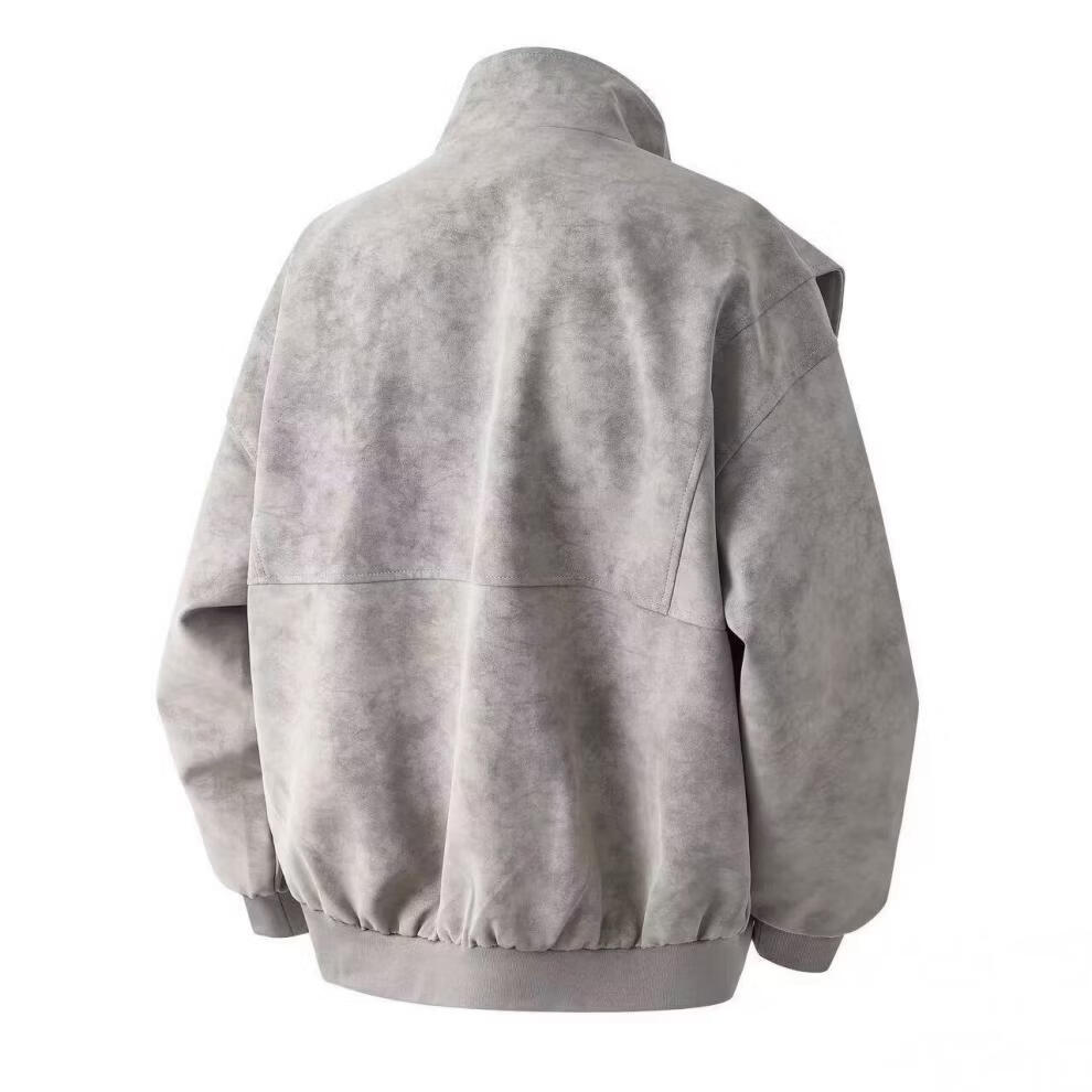 American retro leather jacket for men 2026 new tie-dye jacket spring loose stand-up collar handsome motorcycle jacket for men light gray M