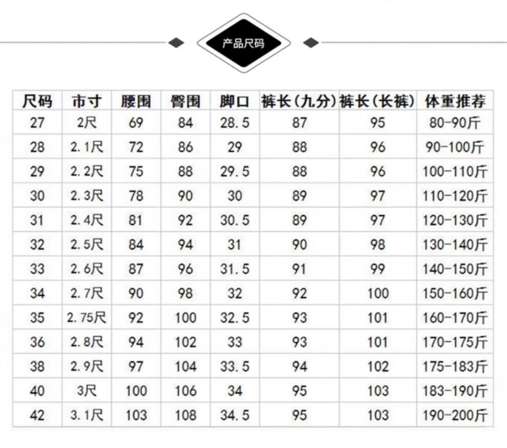 Outseam (cm) 99 cm 101.5 cm 104 cm 106.5 cm 109 cm