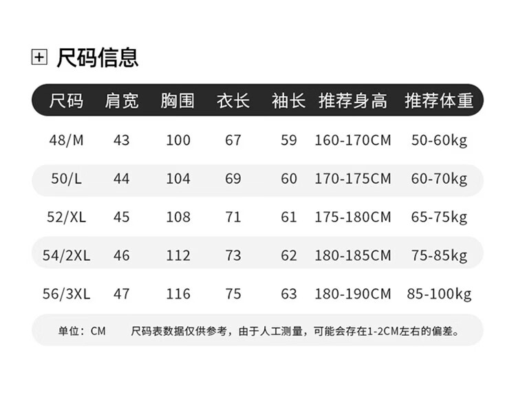 China (cm) 165 / 88-90 170 / 96-98 175 / 108-110 180 / 118-122 185 / 126-130