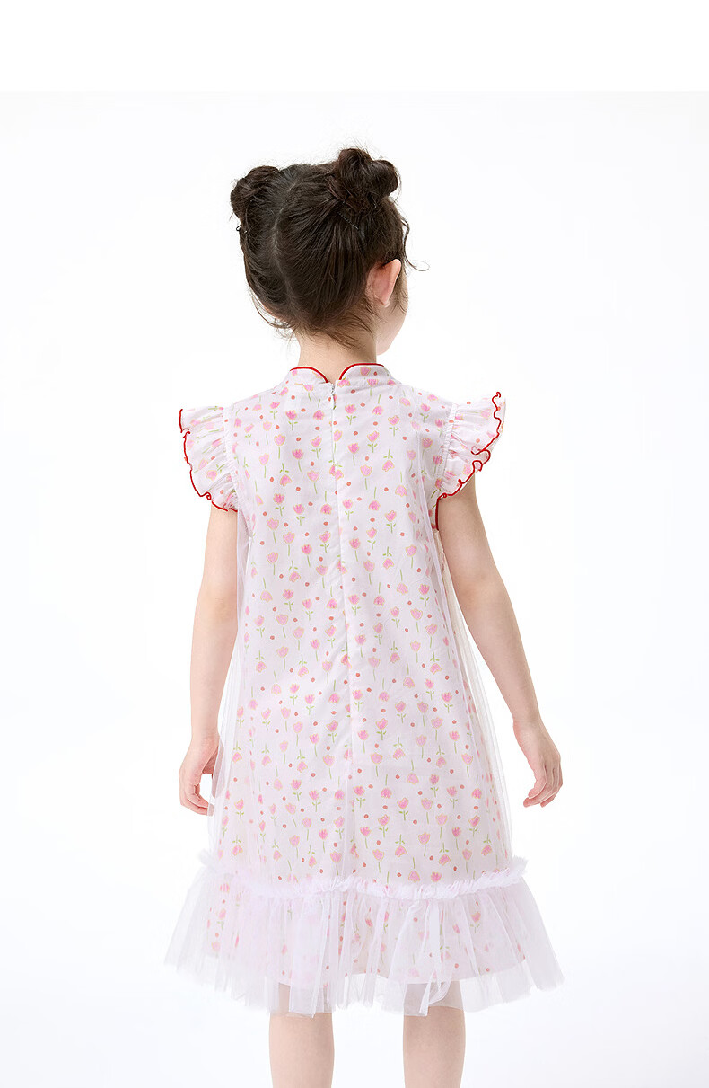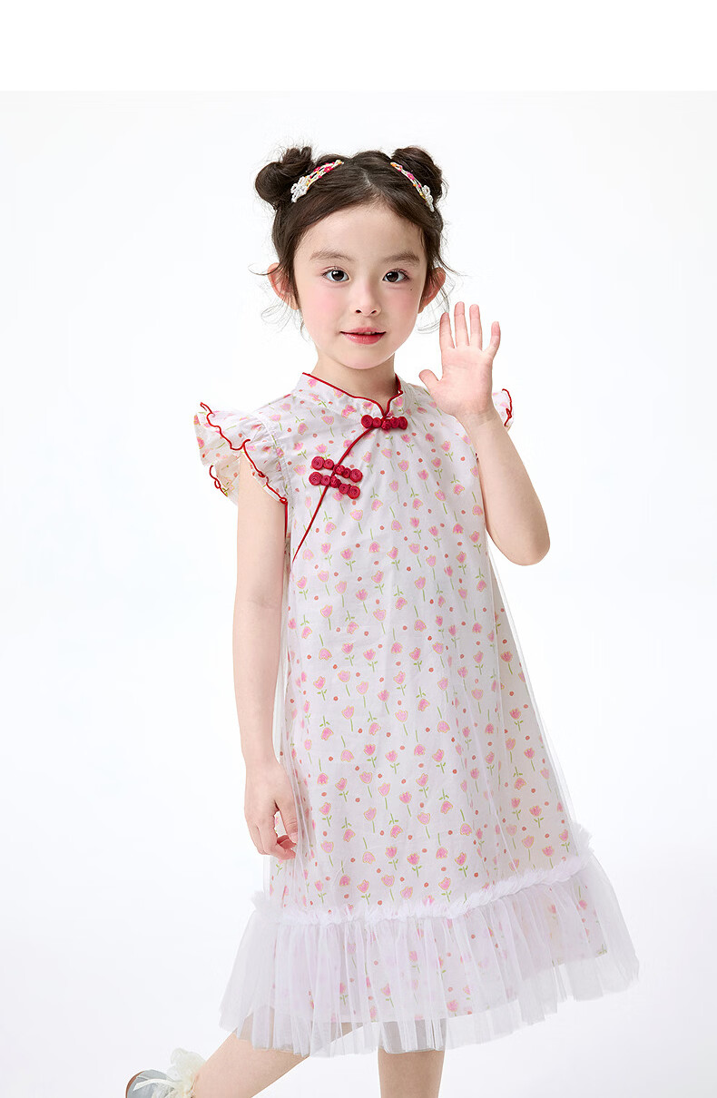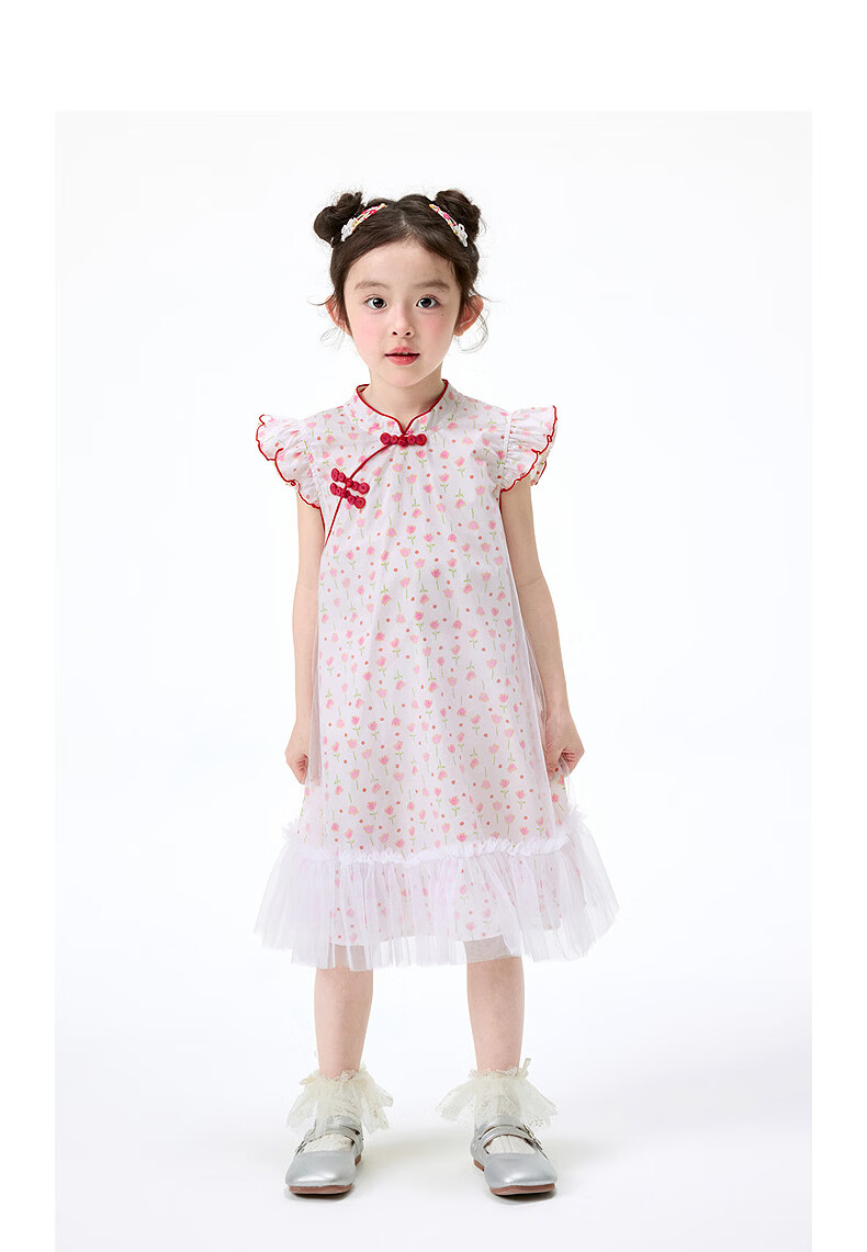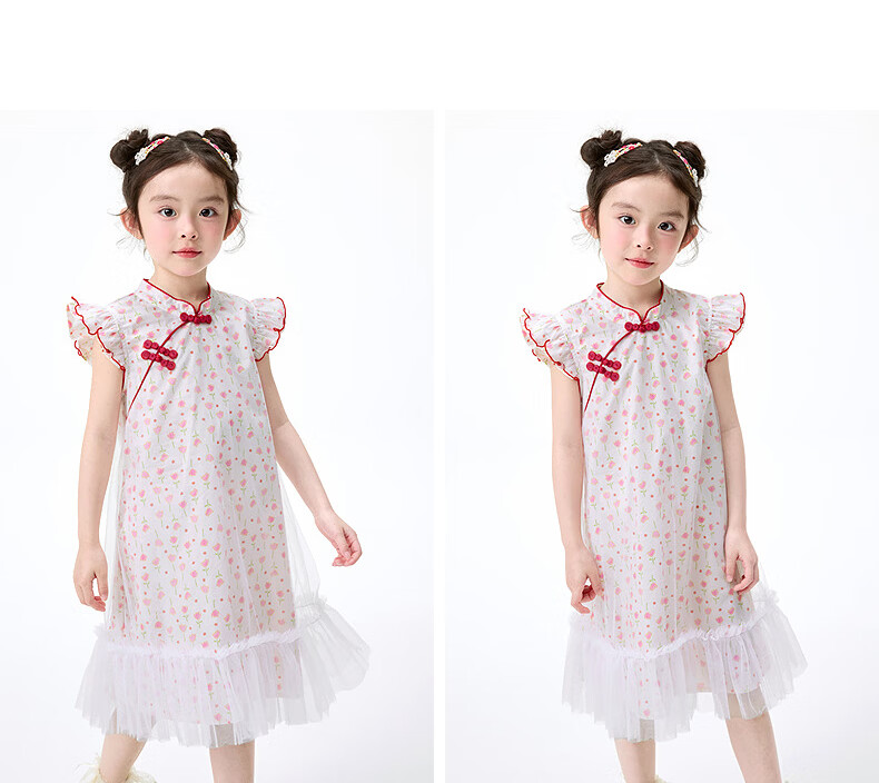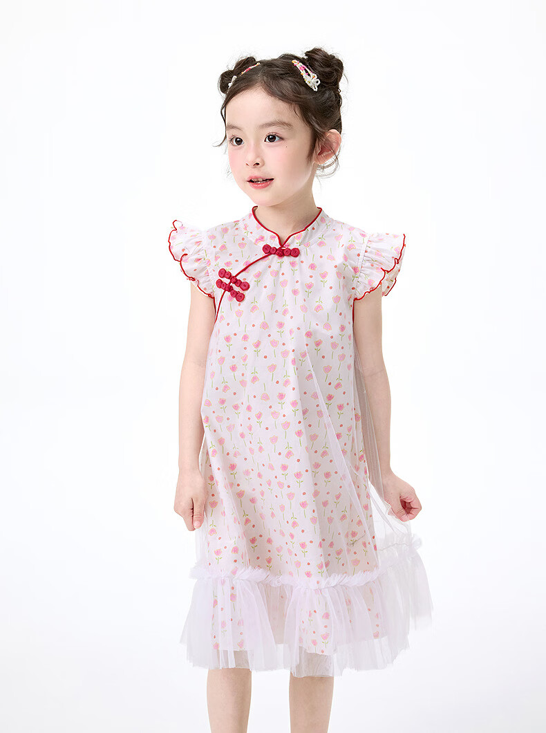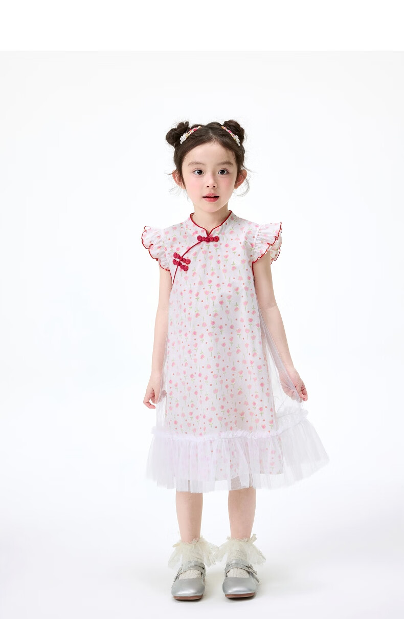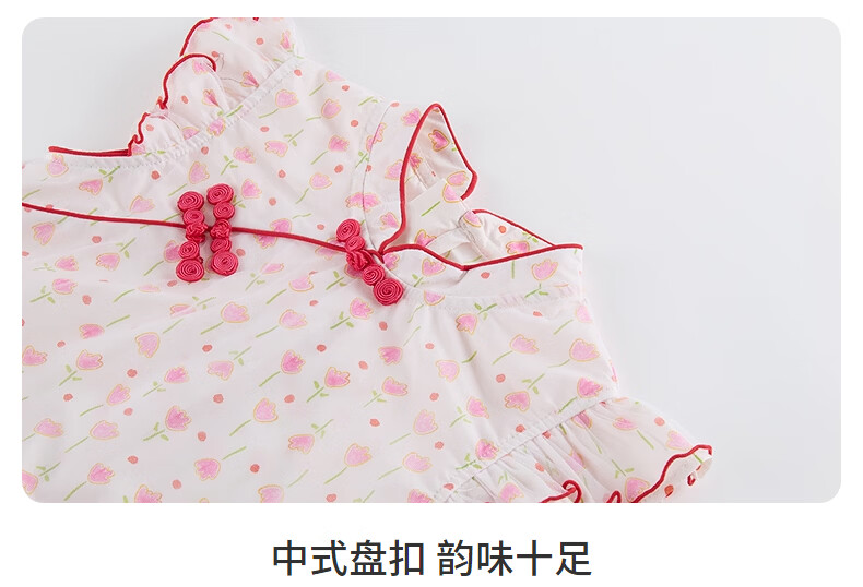 Xiaoyinman baby Chinese style cheongsam skirt 26 summer new style small and medium-sized children's flying sleeve mesh sweet princess skirt buckle Hanfu skirt pink 105