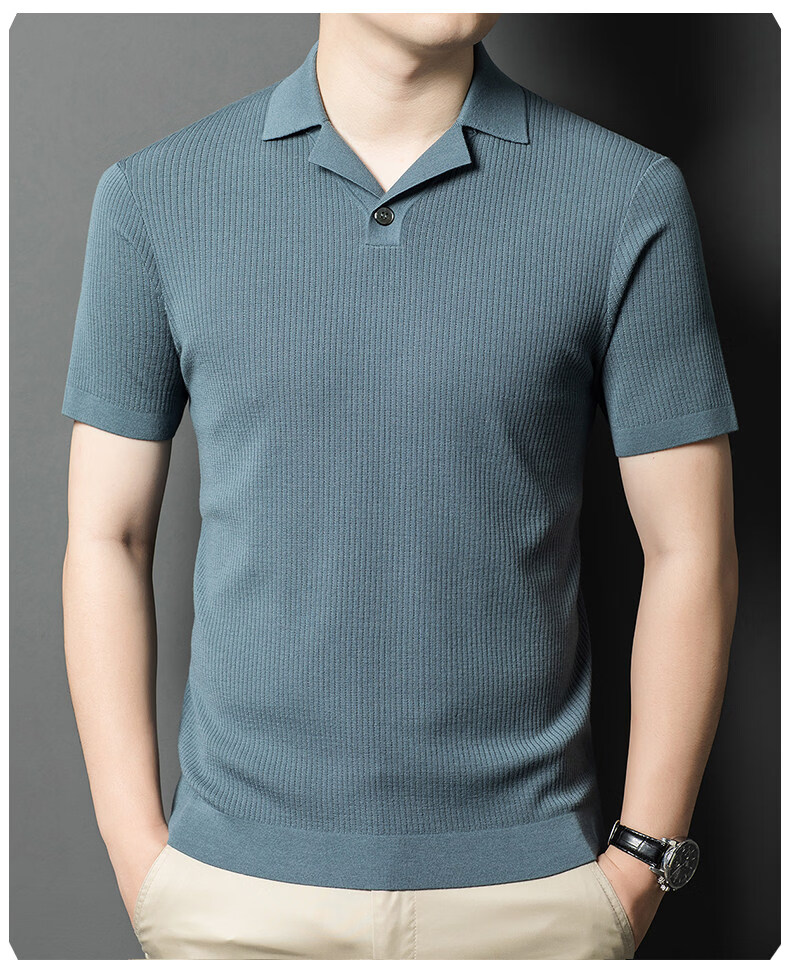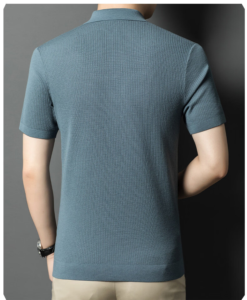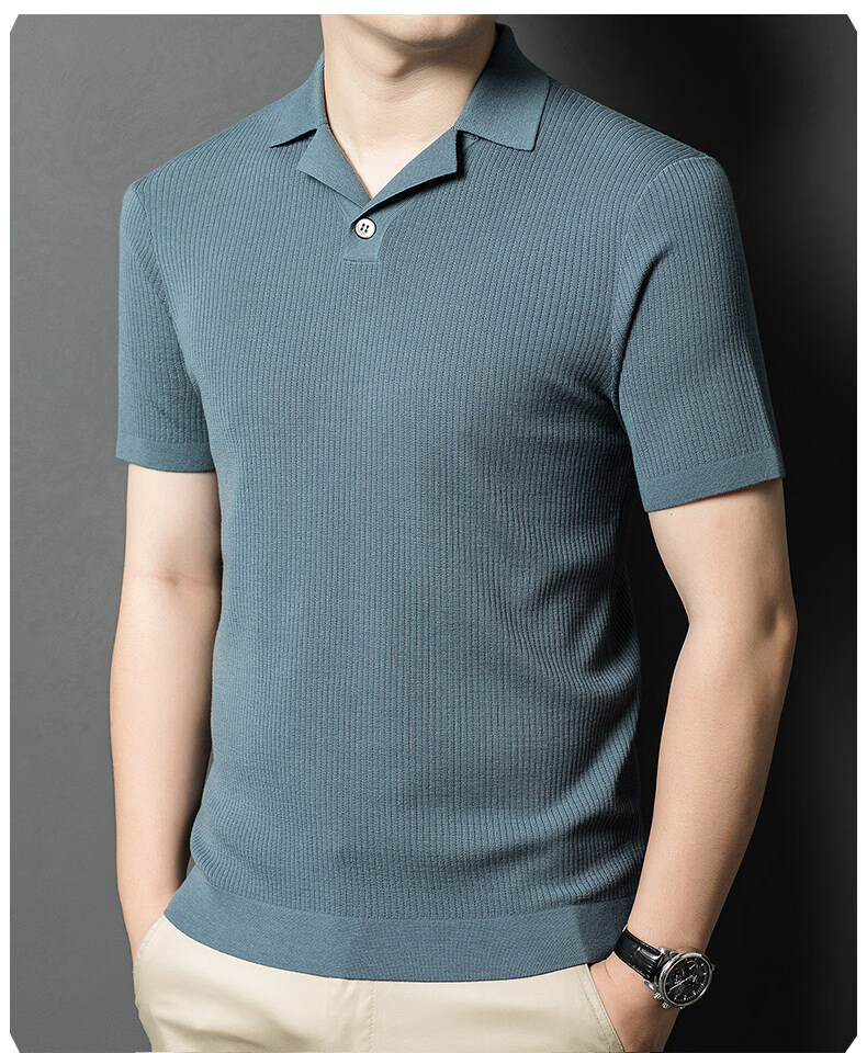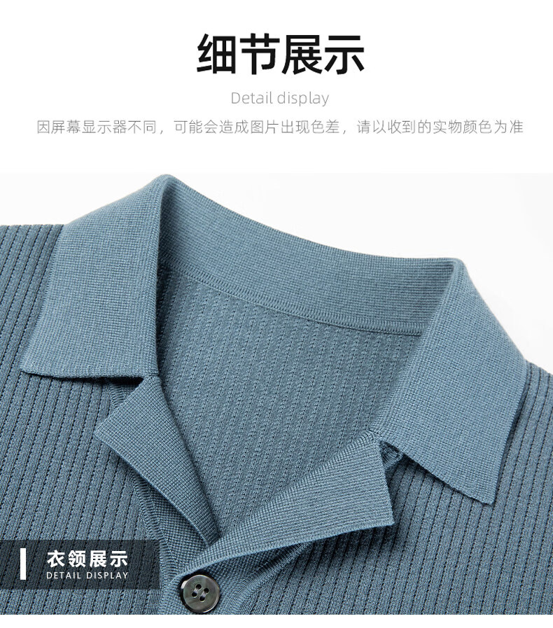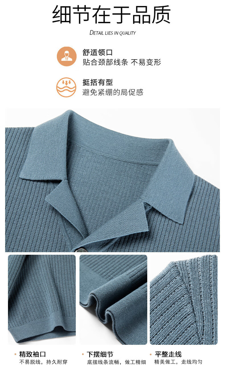 丨Lilang丨 Machine washable 100 count medium thick high density worsted short-sleeved cardigan men's lapel half-sleeved sweater medium gray blue M 165