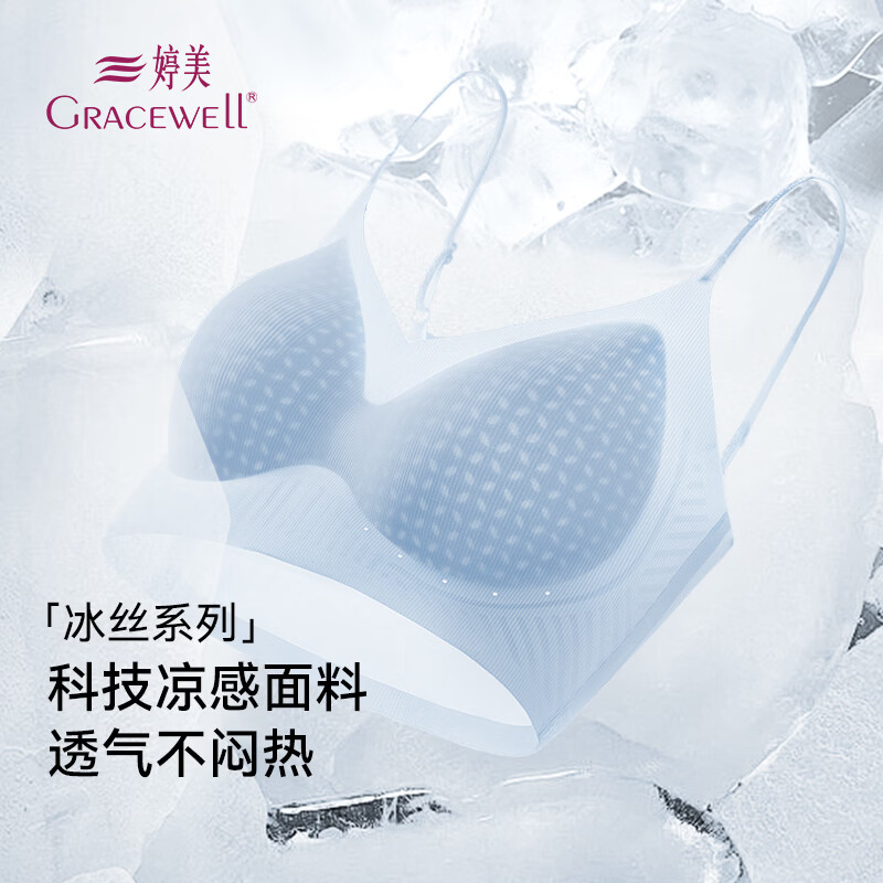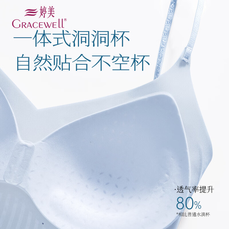 婷美无痕内衣女小熊聚拢承托细肩带无钢圈夏季新款运动薄款文胸罩 浅蓝色/浅紫 L