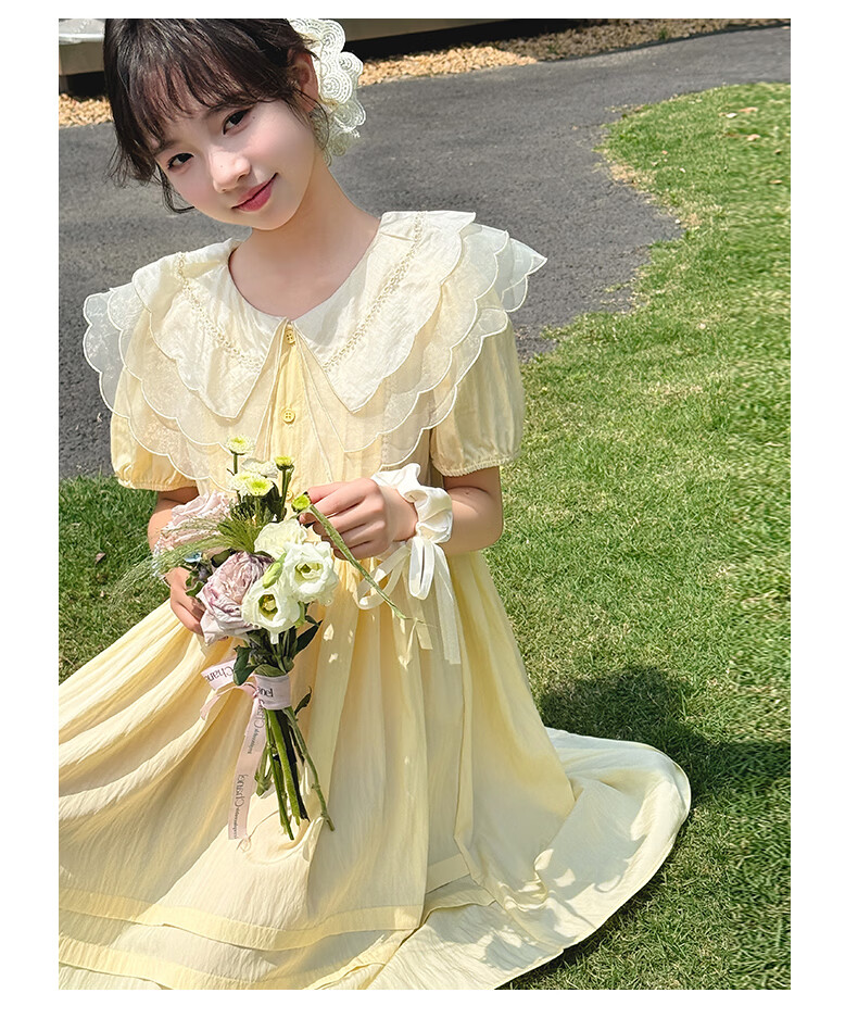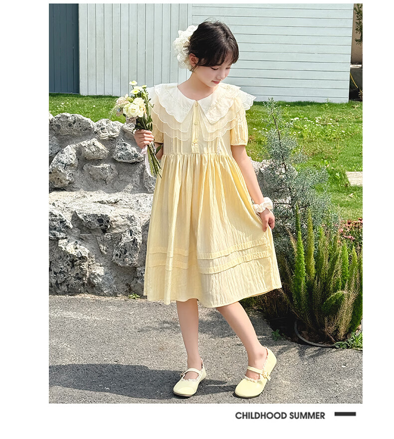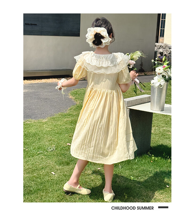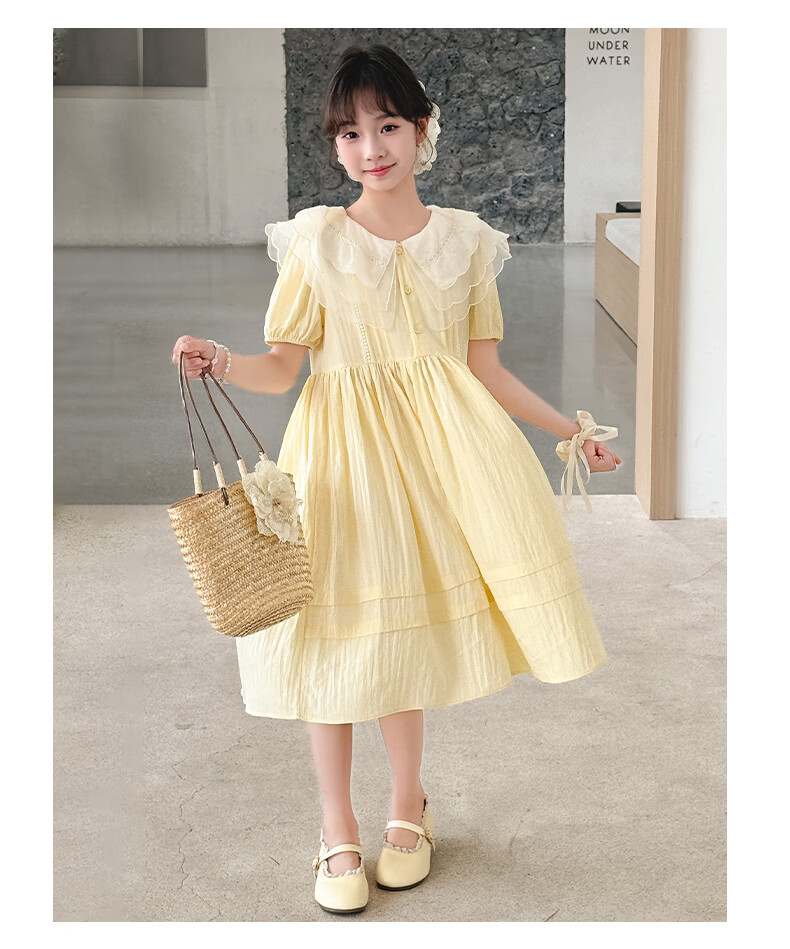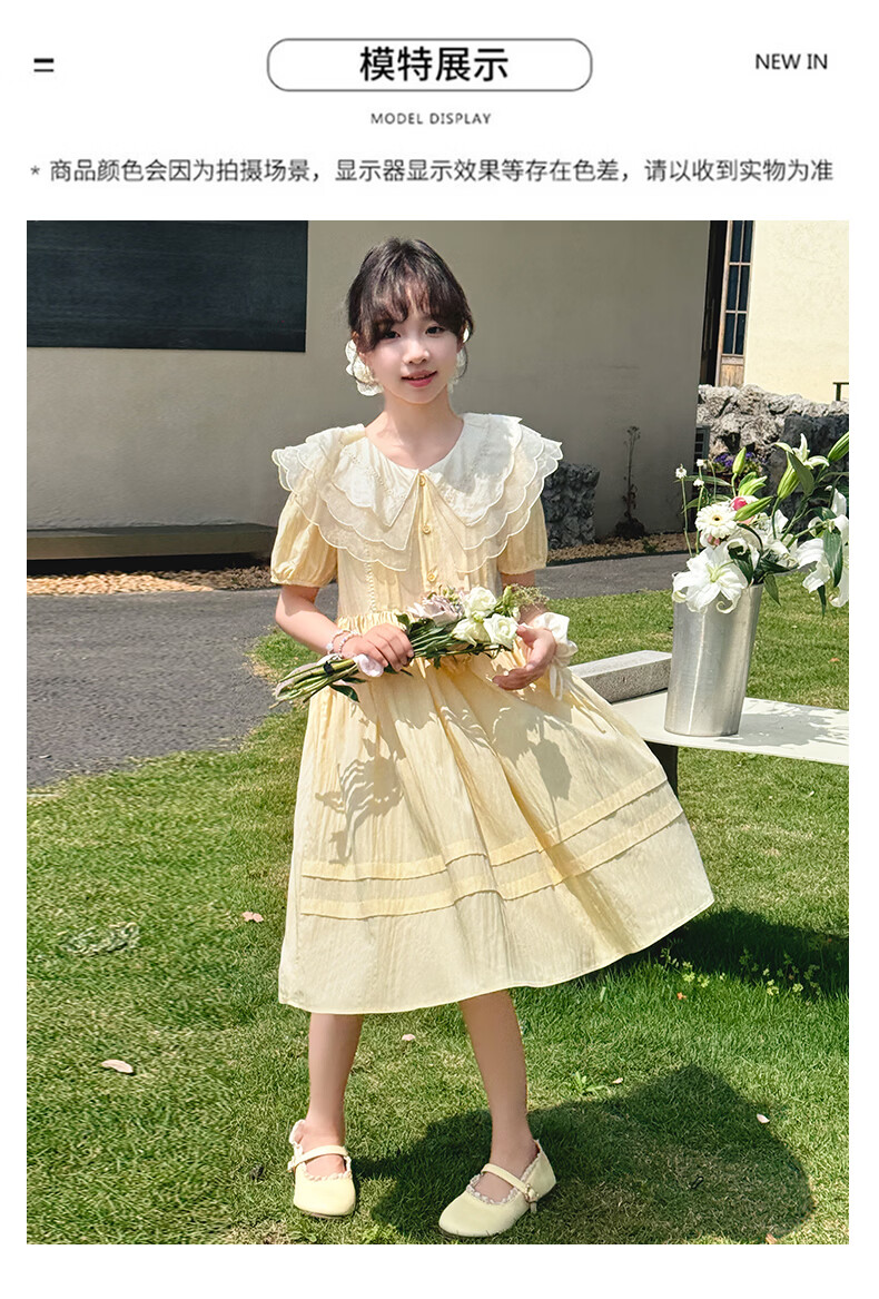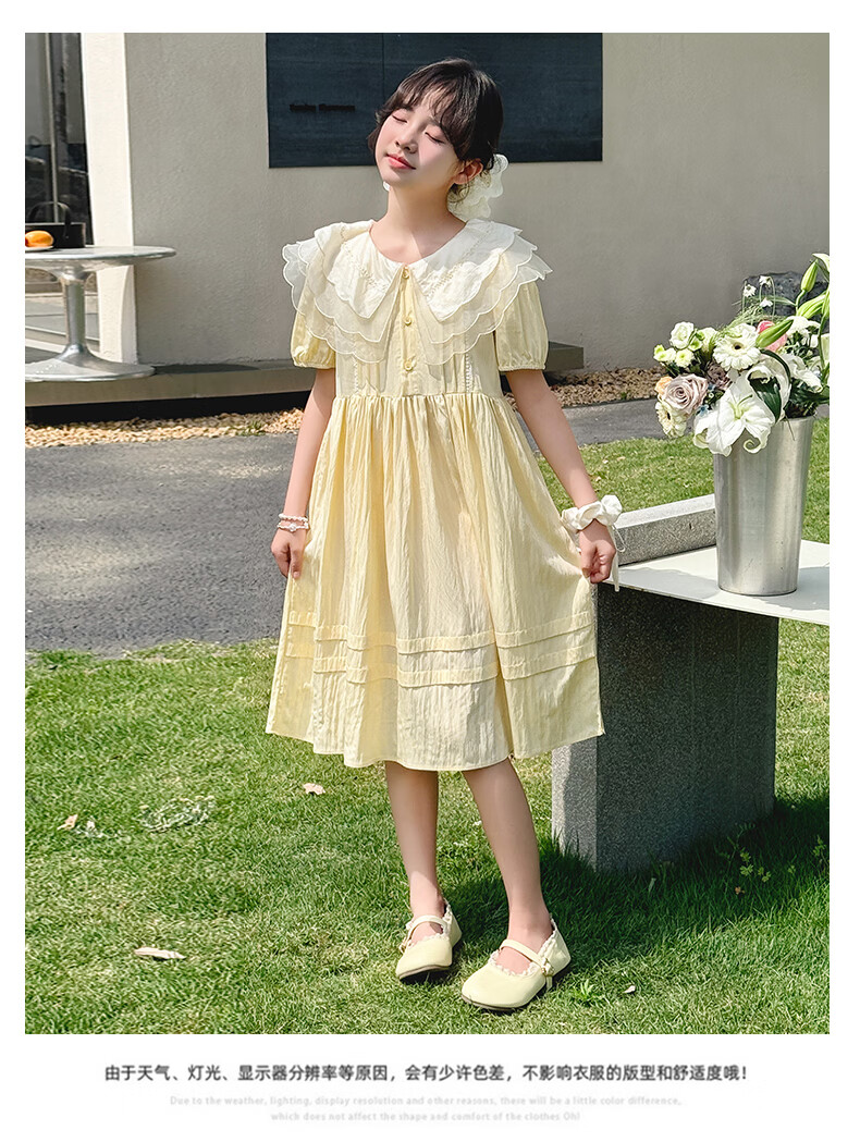 Kaimi Bear Girls' Dress 2026 New Children's Summer Dress for Girls and Large Children Western Style Summer Girls Short-Sleeved Princess Dress Light Yellow Size 120 Recommended Height About 115cm