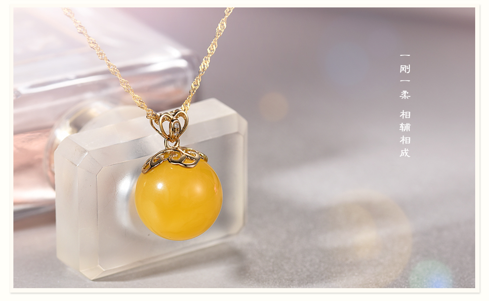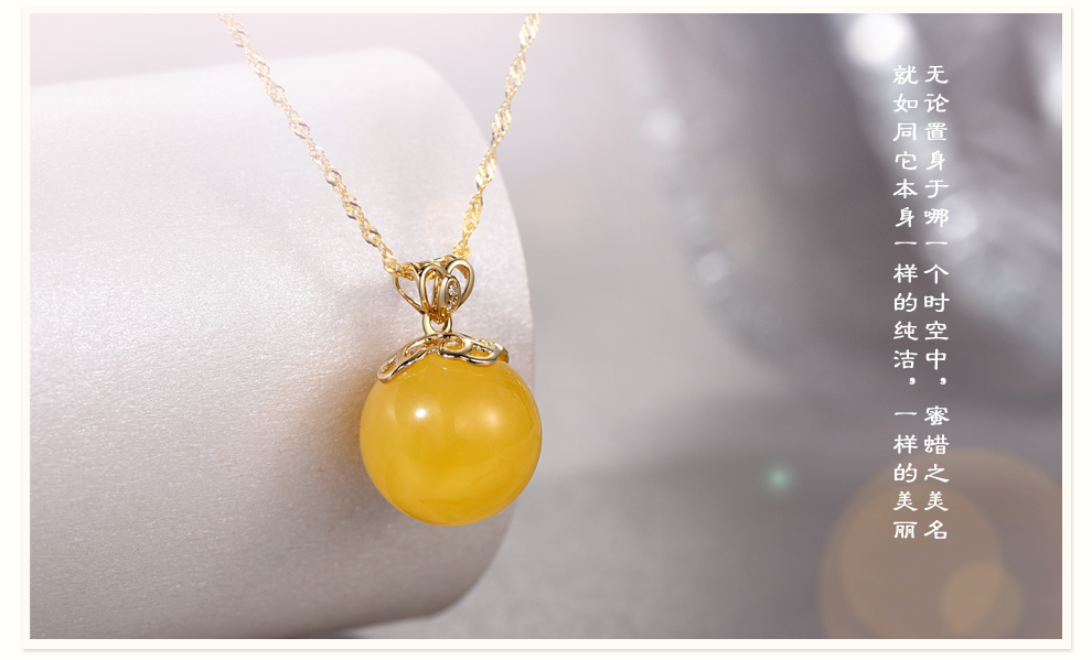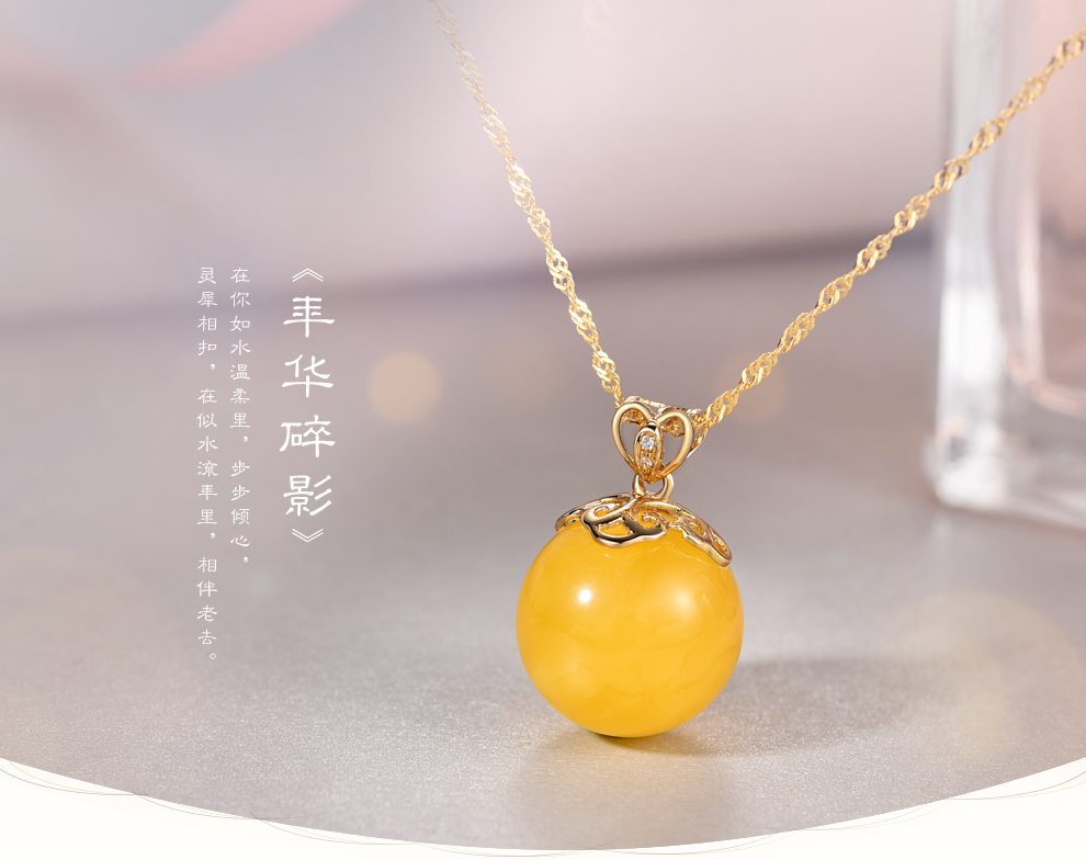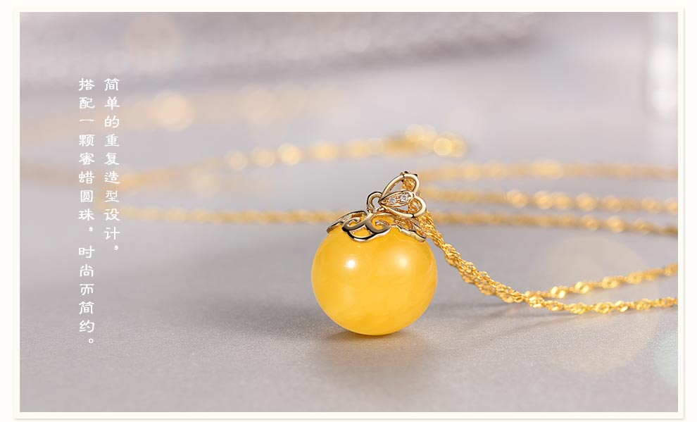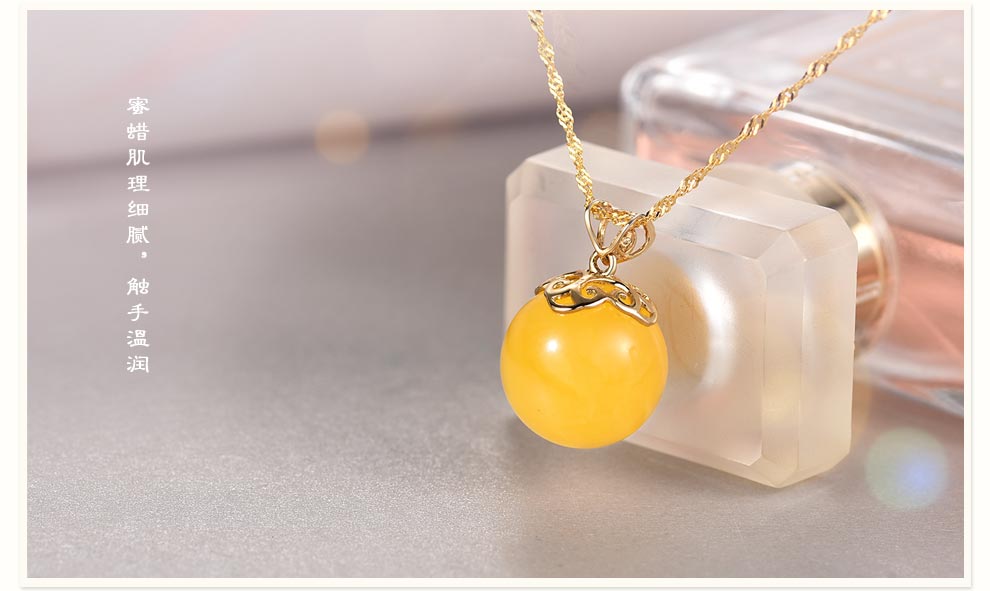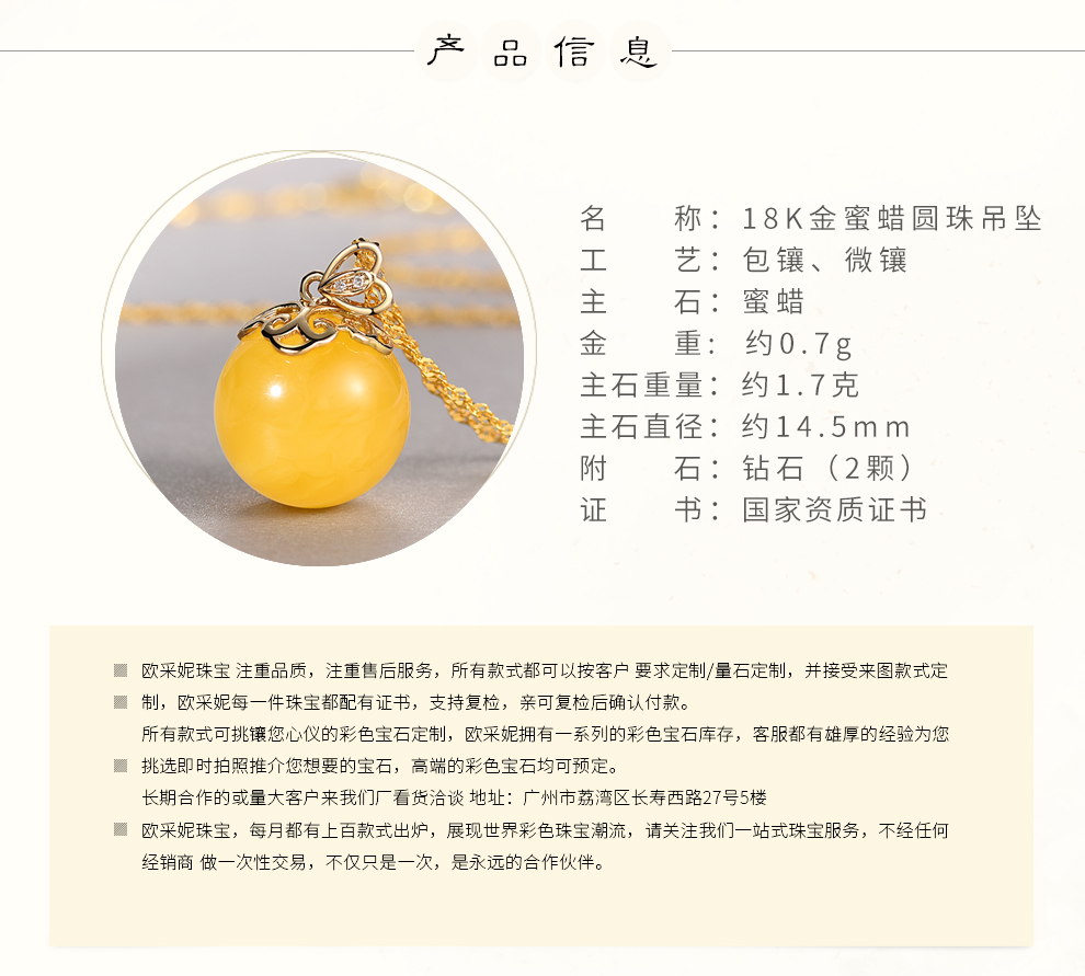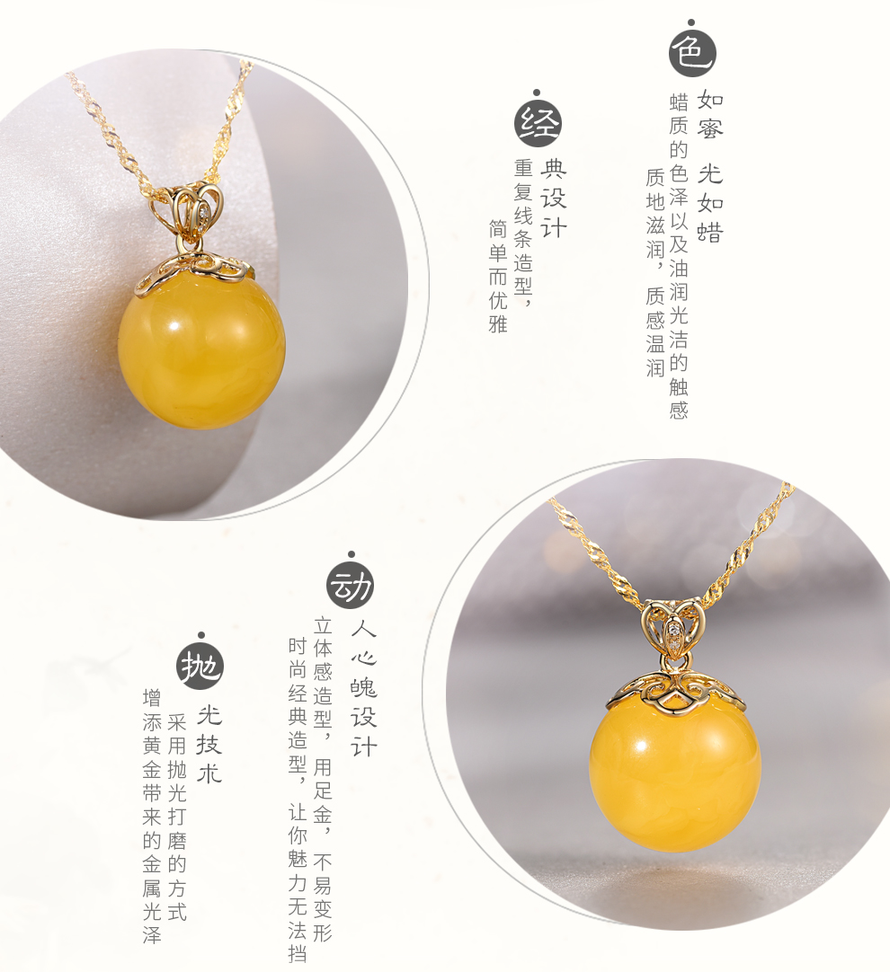 Ouchini beeswax pendant natural round beads amber 18K gold with diamond inlaid women's pendant (customized 7-10 working days)