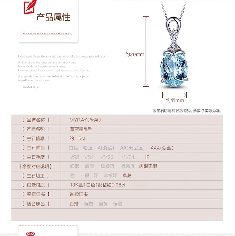 Millais Jewelry 4.5 carat aquamarine pendant 18K gold set with diamond necklace natural gemstone birthday gift for girls without chain. The chain can be customized additionally.