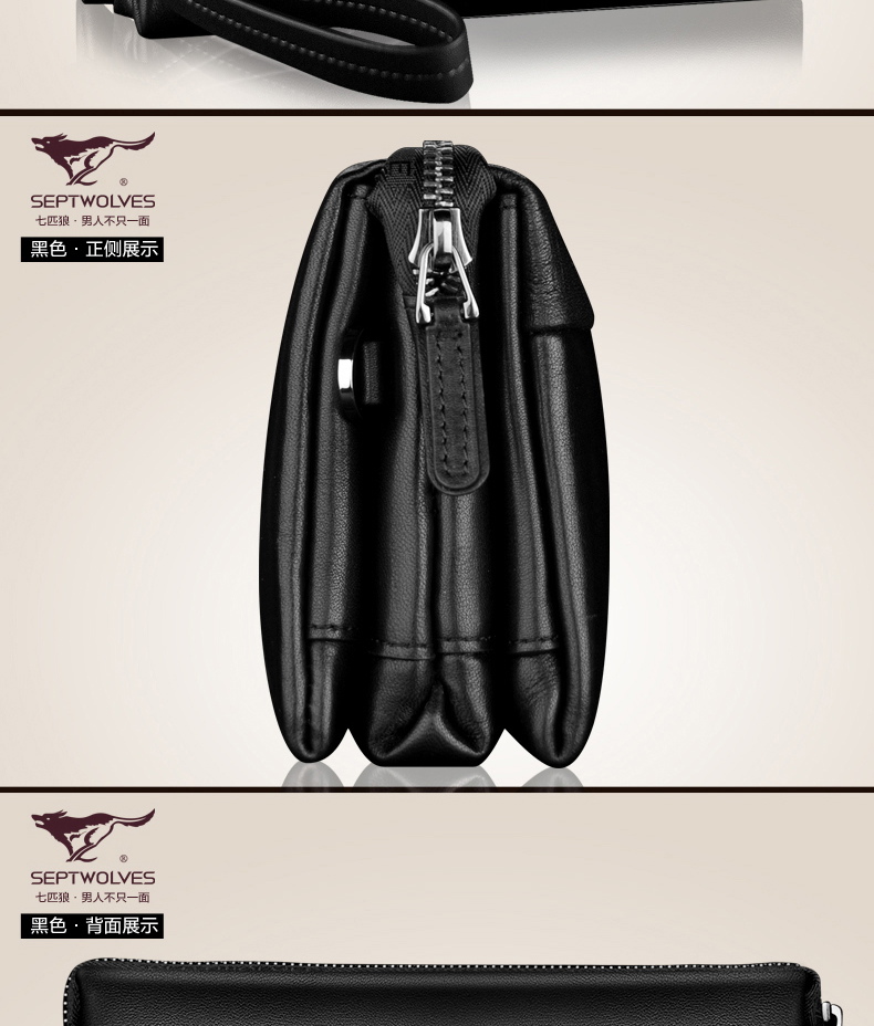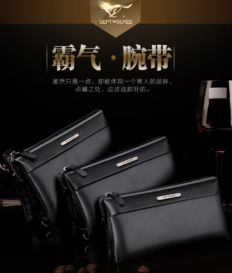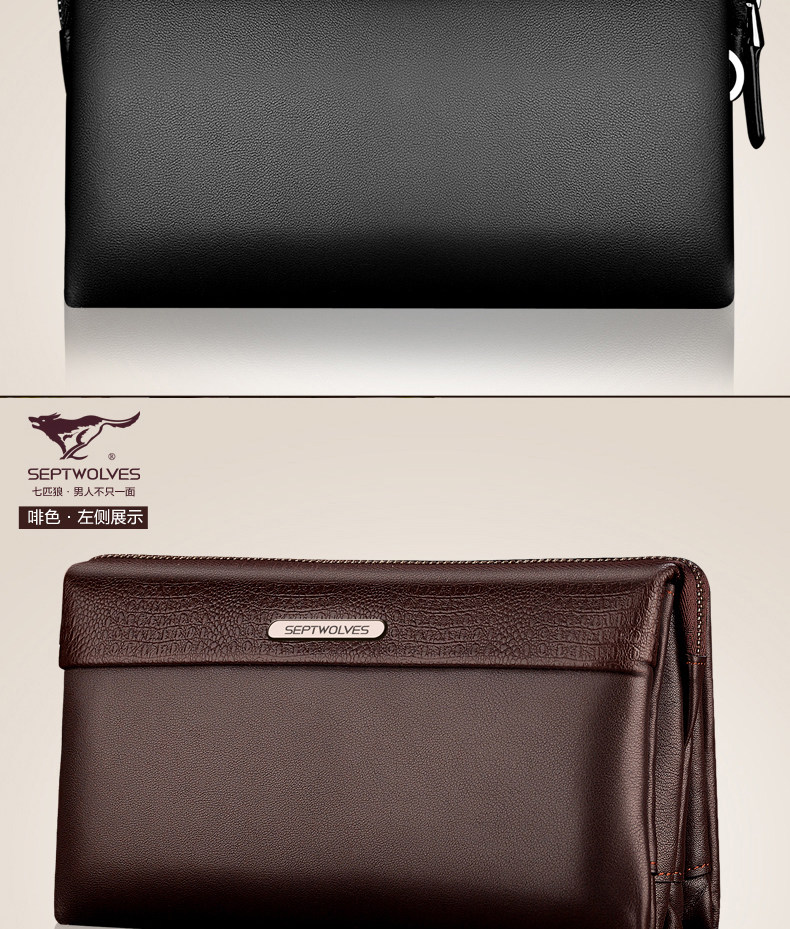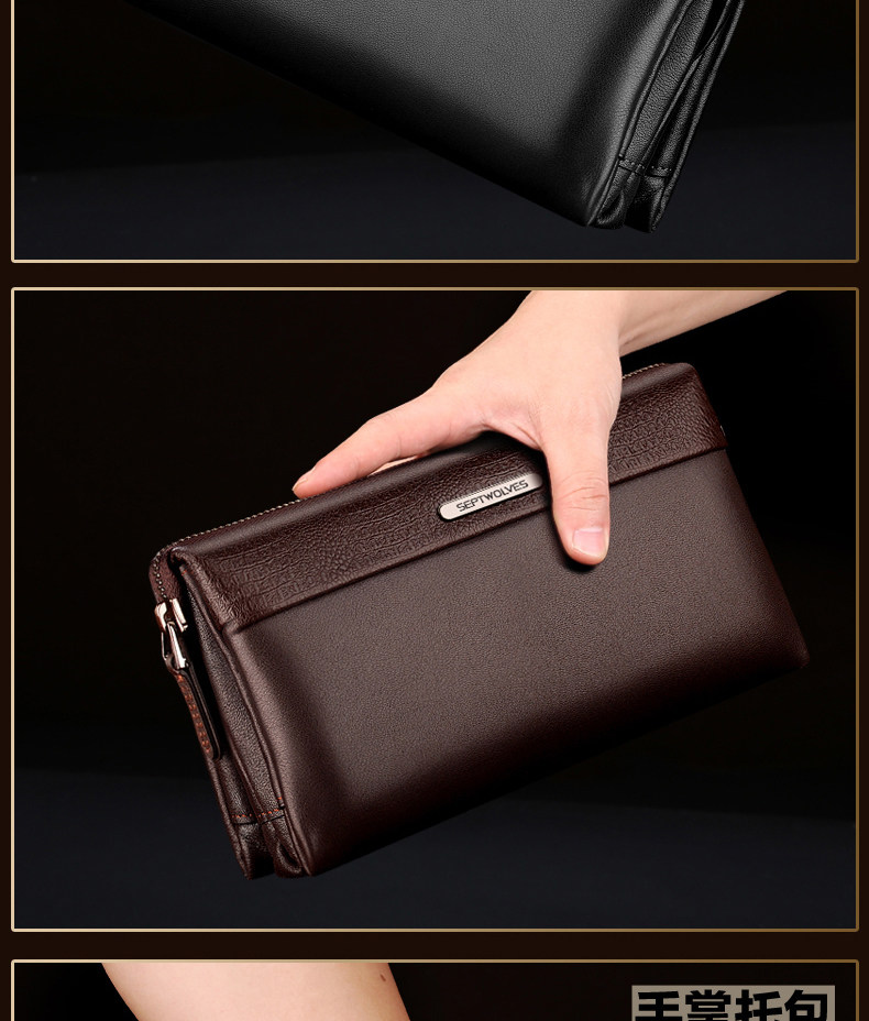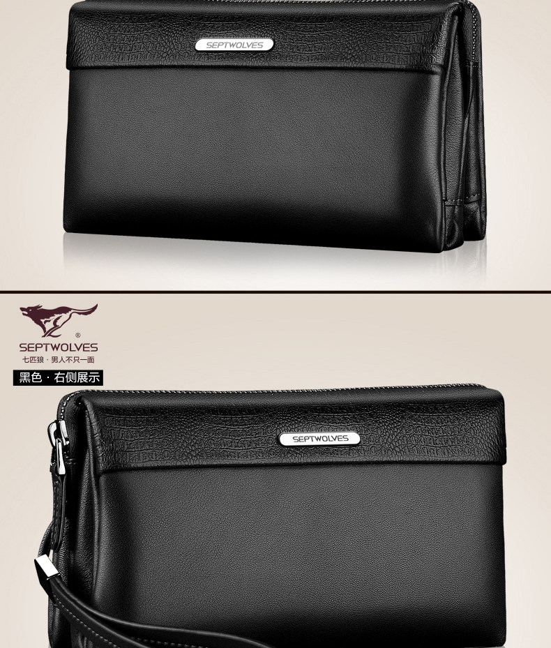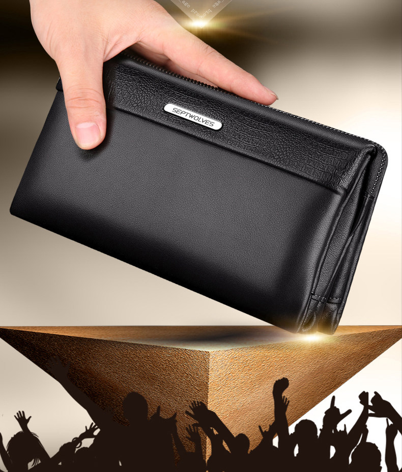 Septwolves men's handbag genuine leather large capacity first layer cowhide multifunctional clutch bag business casual clutch bag black medium size 23*14*5.5