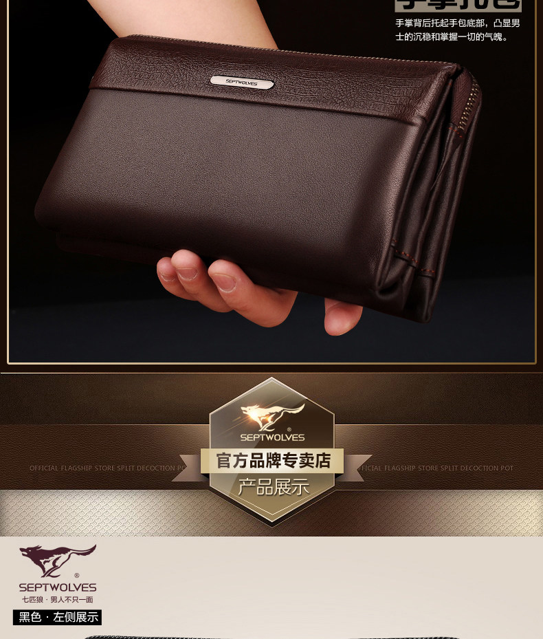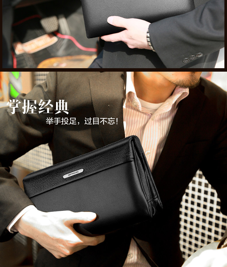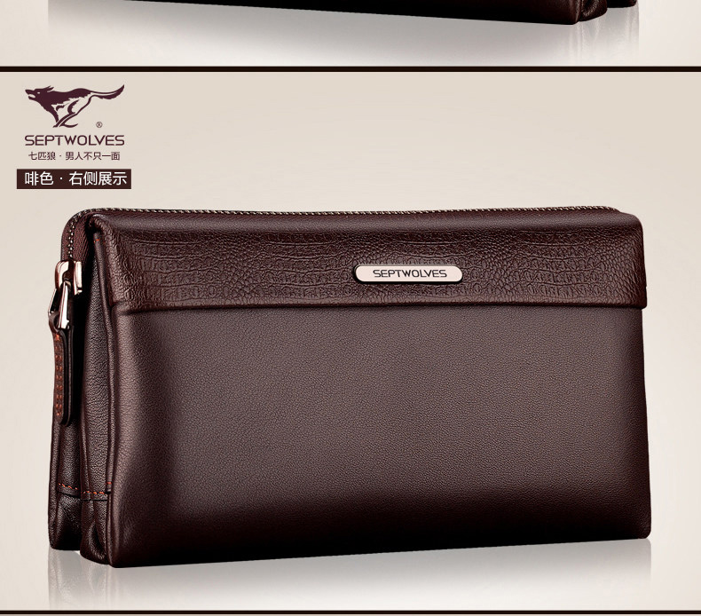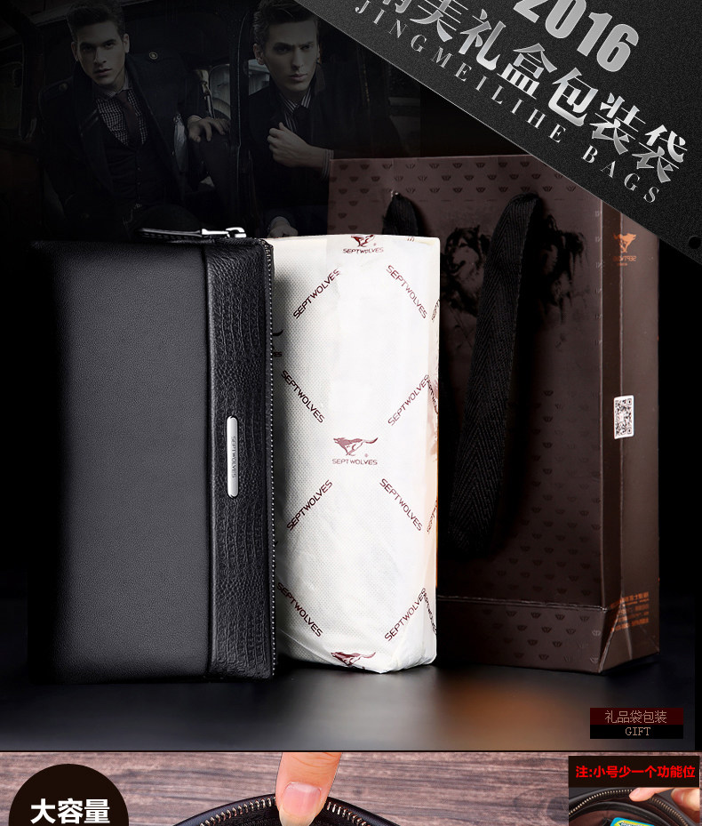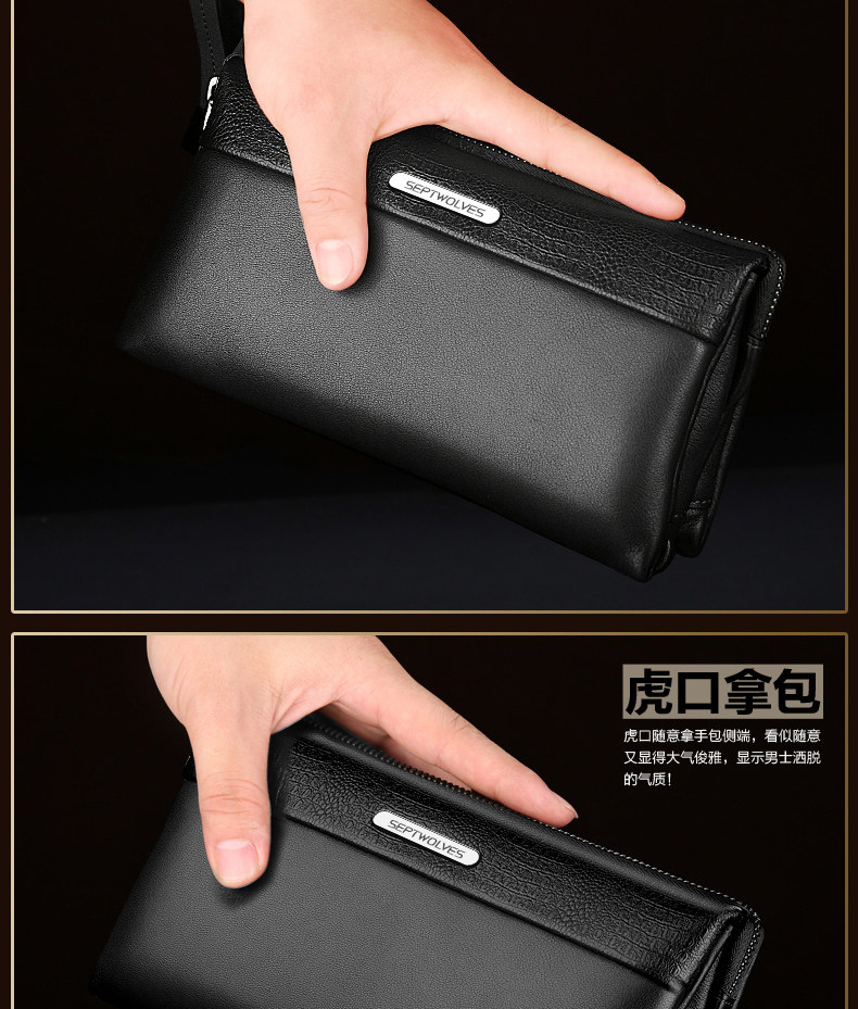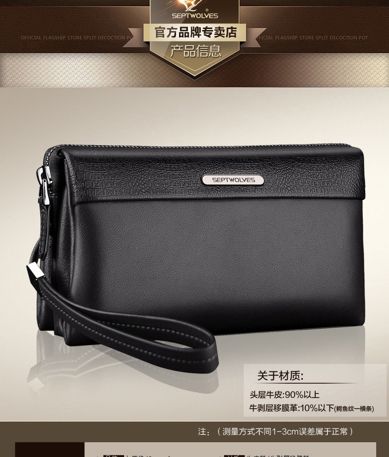 Septwolves men's handbag genuine leather large capacity first layer cowhide multifunctional clutch bag business casual clutch bag black medium size 23*14*5.5