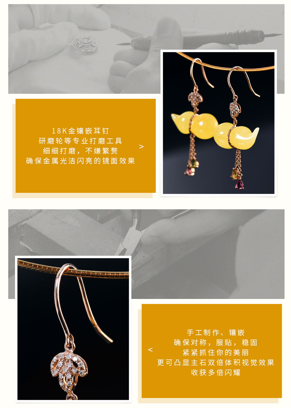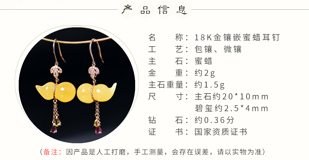 Ouchini beeswax earrings, natural chicken fat, yellow gourd, amber, 18K gold with diamonds, women's model (ready for shipment)