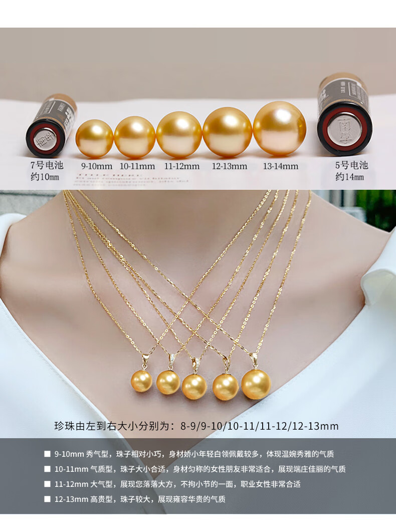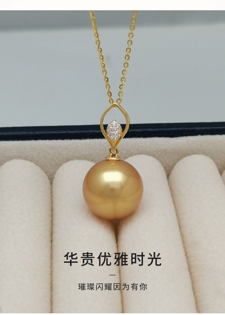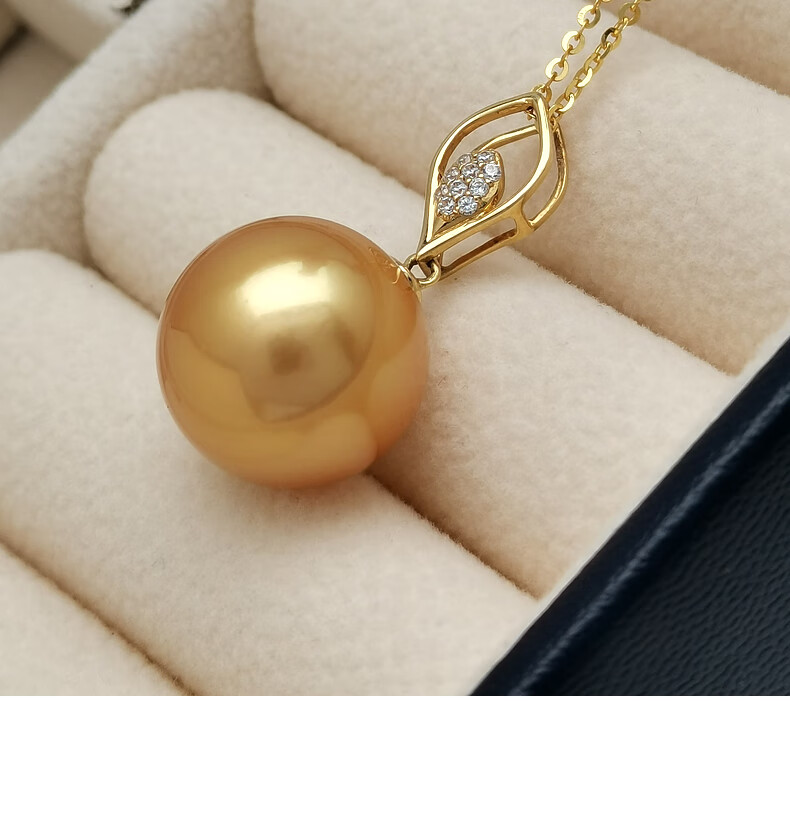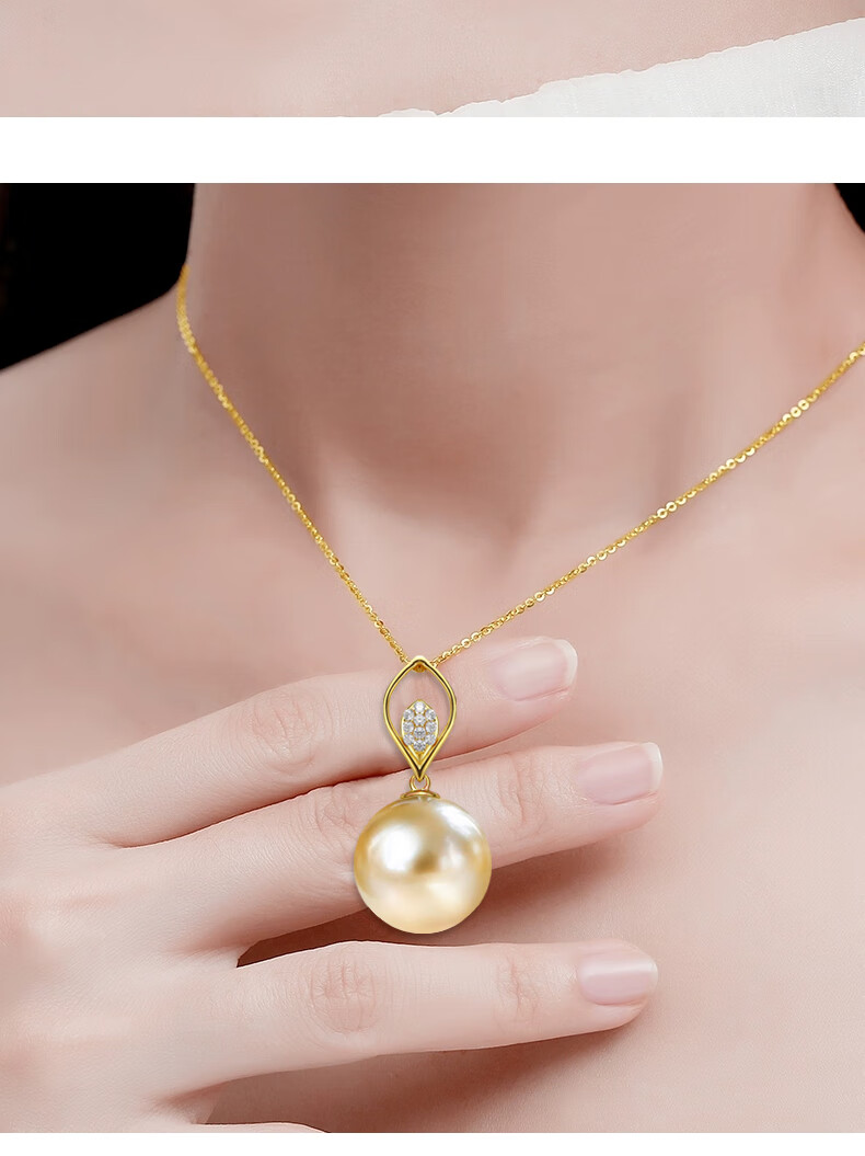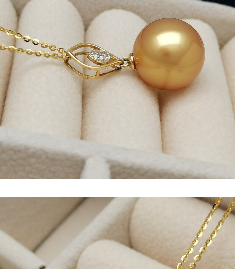 Haitong South Sea gold bead pendant 18K gold holder gold leaf seawater pearl necklace single round golden clavicle chain for women 12-13mm almost flawless