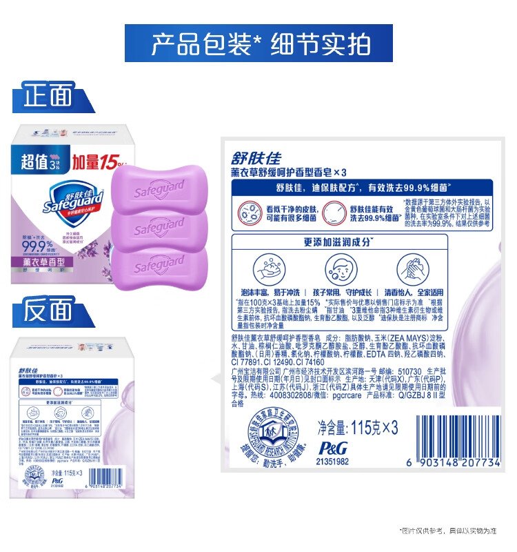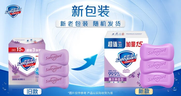 Safeguard soap, lavender 3 bar soap, 99.9% sterilization, bath and shower soap, new and old packaging, random
