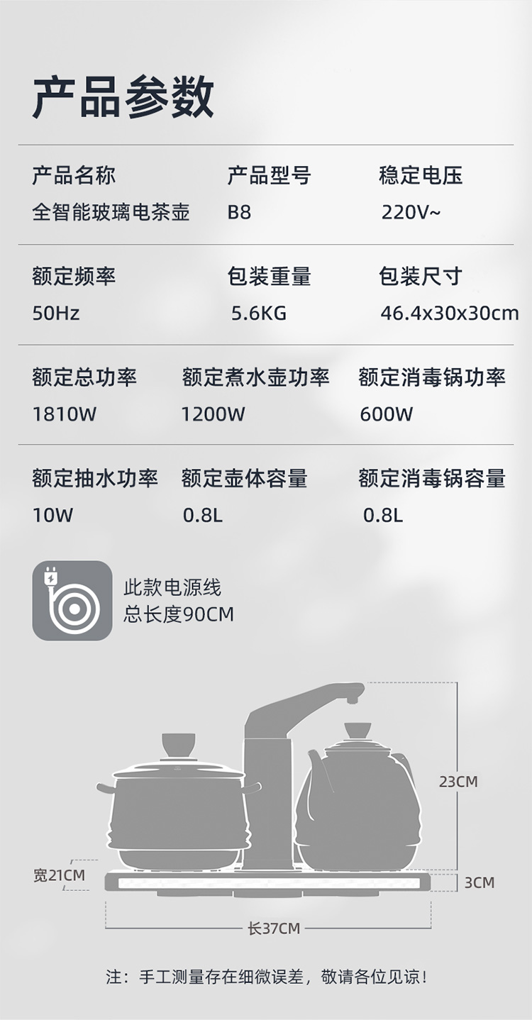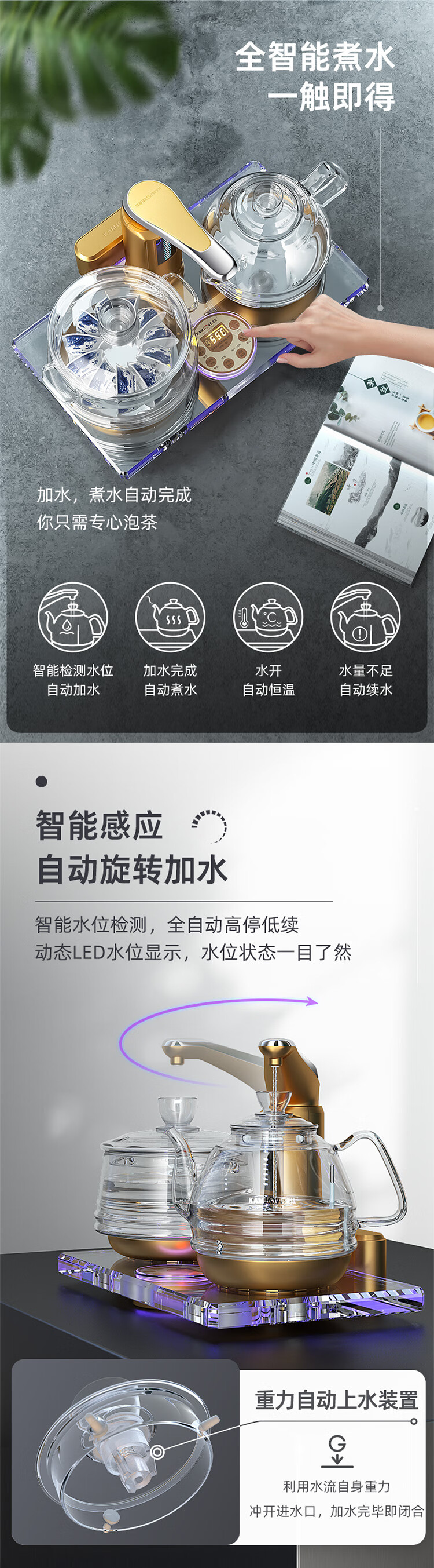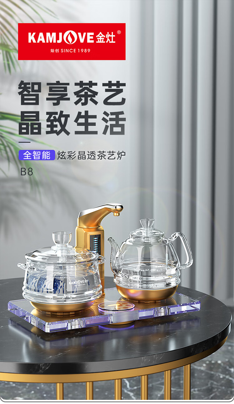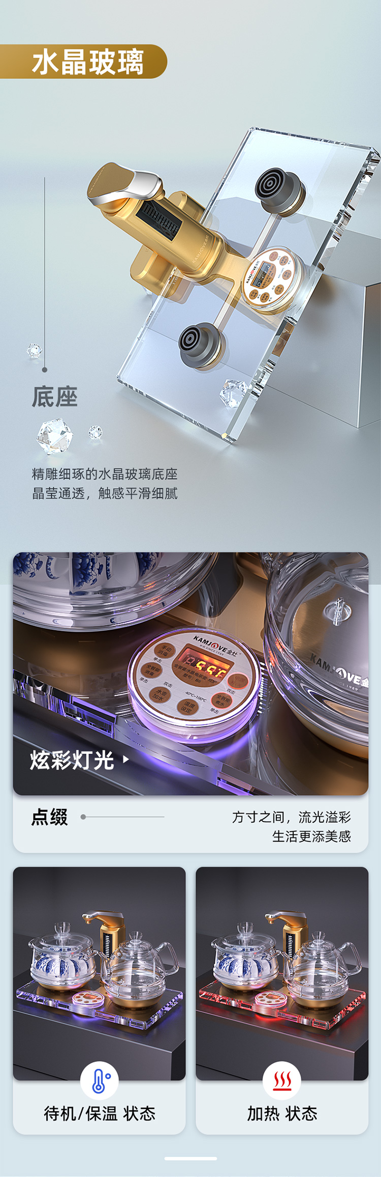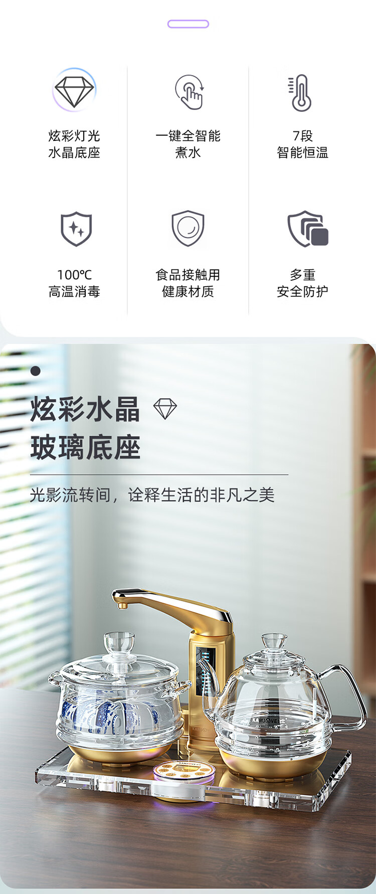 KAMJOVE fully automatic water filling electric kettle, high borosilicate glass electric tea kettle, tea table kettle, crystal glass base, B8 automatic rotating water filling