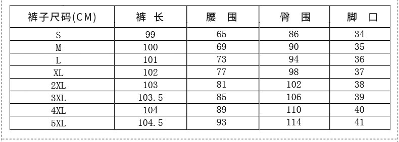 Outseam (cm) 99 cm 101.5 cm 104 cm 106.5 cm 109 cm