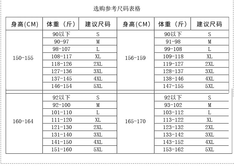 China (cm) 160-165/84-86 165-170 / 88-90 167-172 / 92-96 168-173 / 98-102 170-176 / 106-110