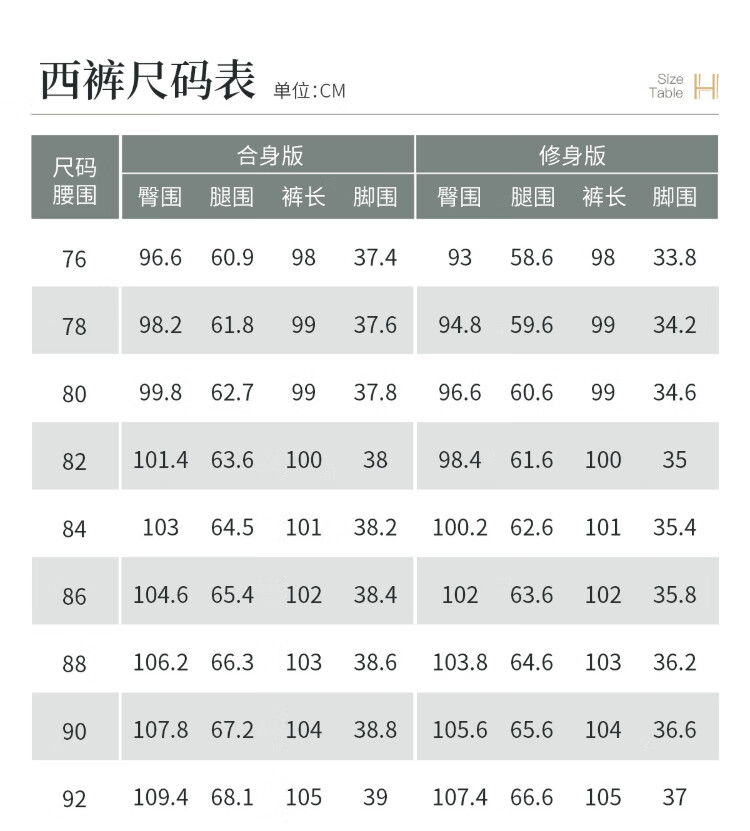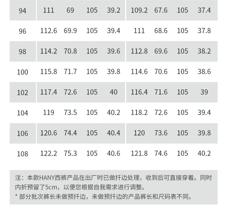 Outseam (cm) 99 cm 101.5 cm 104 cm 106.5 cm 109 cm