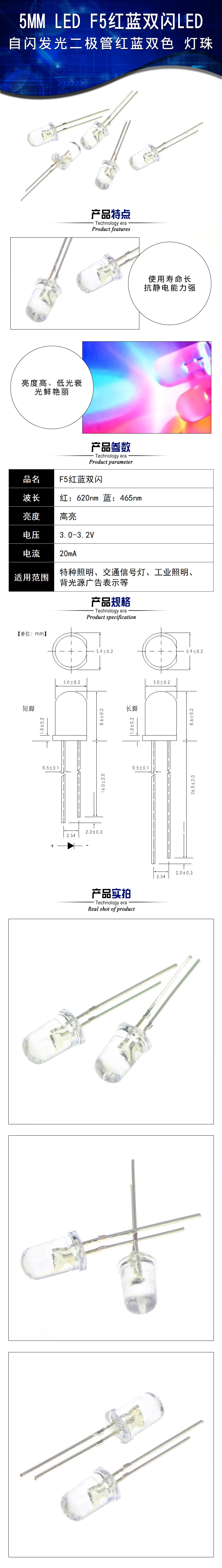 TaoTimeClub LED light-emitting diode 5MM round head red and blue double flash mutual flash lamp beads (10 pieces)