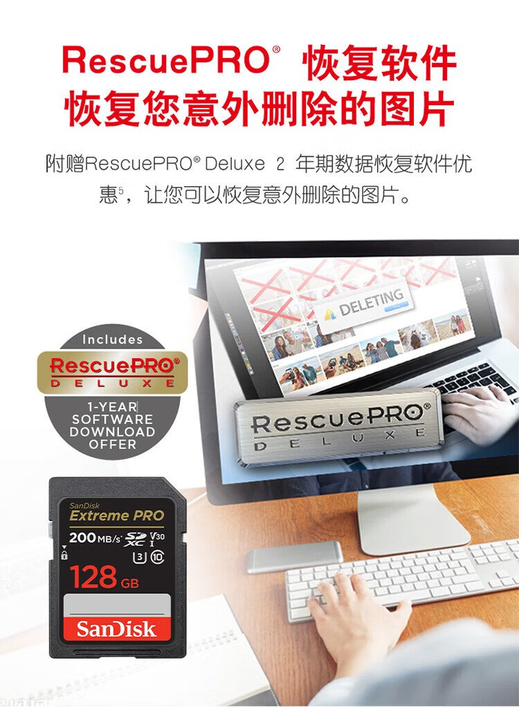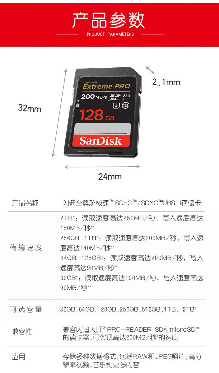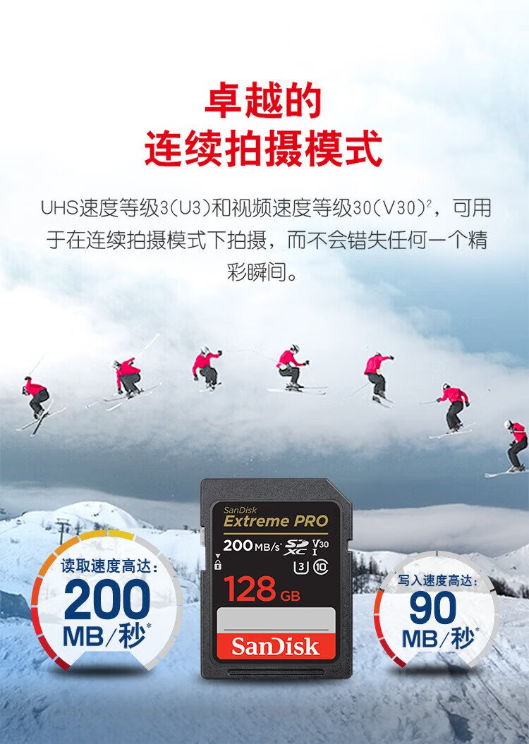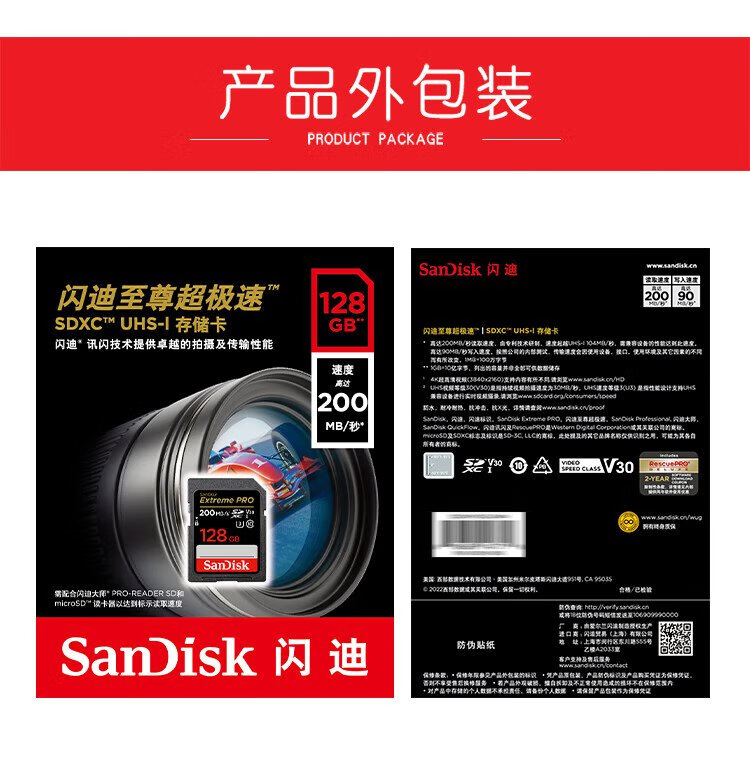 SanDisk 128GB SD memory card 4K V30 U3 C10 camera memory card reading speed 200MB/s writing speed 90MB/s mirrorless/SLR camera memory card