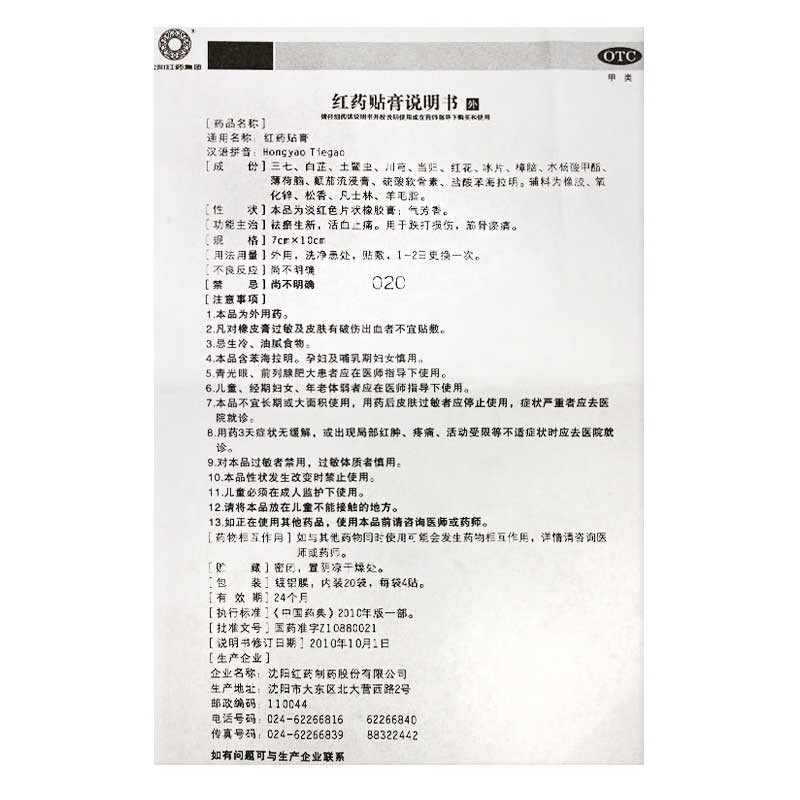 Shenyang Hongyao Hongyao Patch 4 patches OTC removes blood stasis, promotes blood circulation, relieves bruises, bruises, muscle and bone stasis and pain, 10 bags
