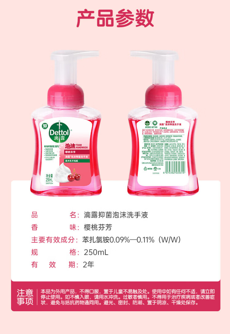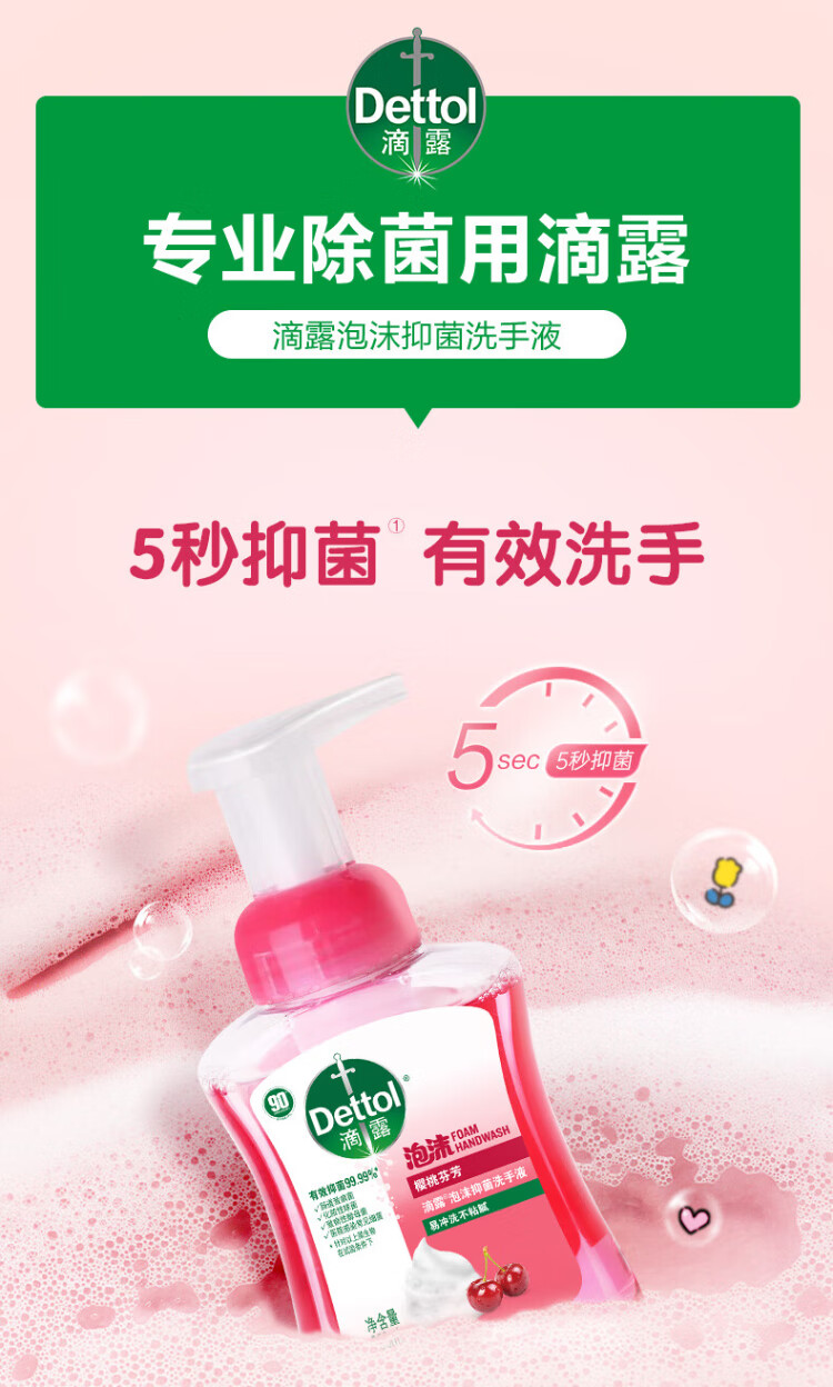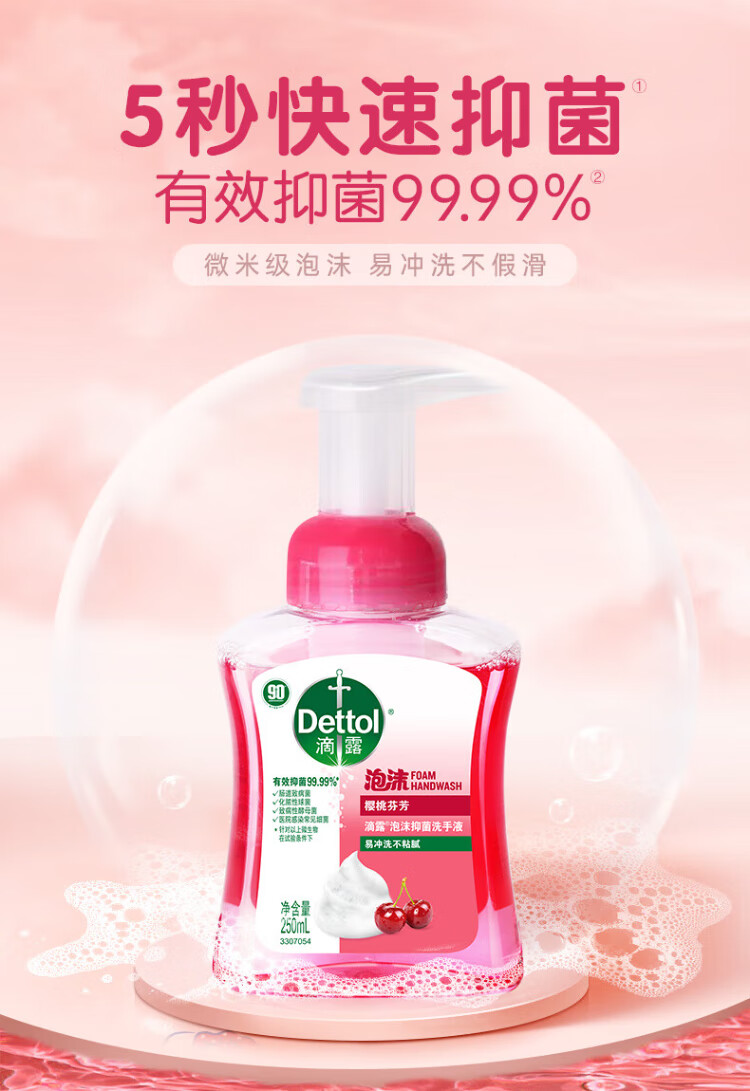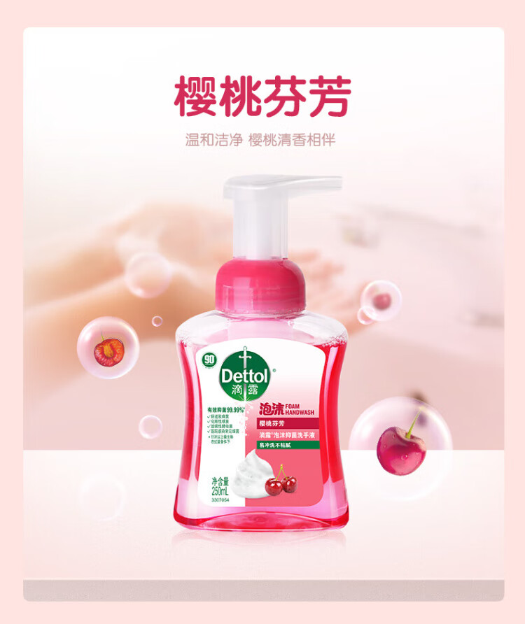 Dettol Foaming Hand Sanitizer Cherry Fragrance 250ml Children's Hand Sanitizer with Rich Bubbles and 5 Seconds Antibacterial Household Use