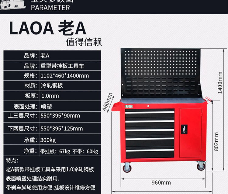 LAOA (LAOA) heavy duty tool cabinet with hanging plate mobile auto repair tool cart workshop tool cabinet tool cart five layers with hanging plate green LA115202