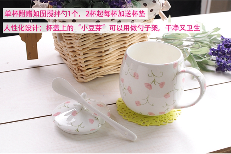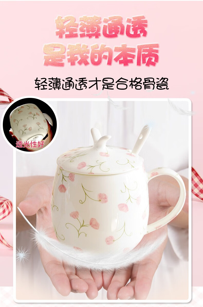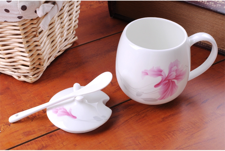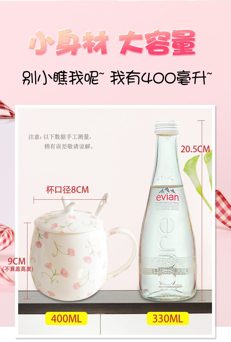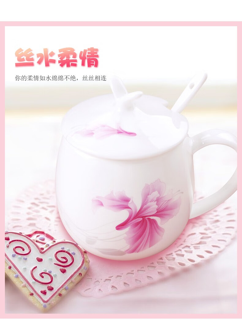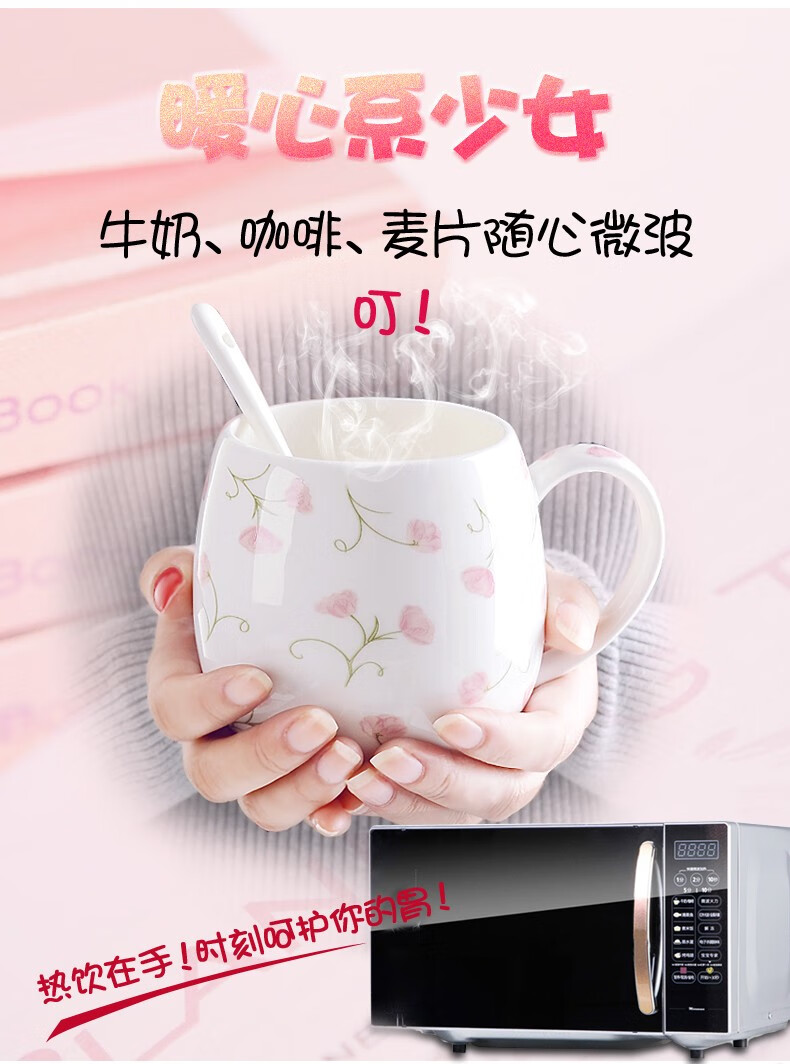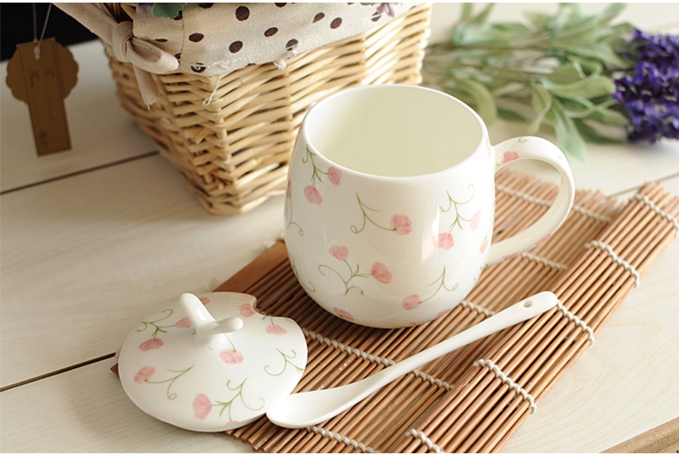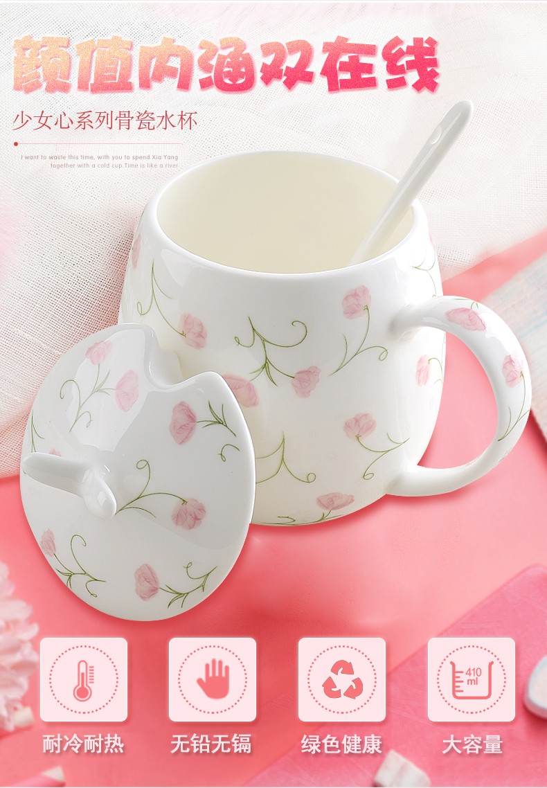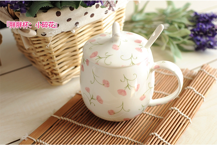 Houhai Cup Ceramic Cup Women's Mug with Lid and Spoon Household Drinking Cup Bone China Breakfast Cup Coffee Cup Girly Heart Fat Cup - Small Floral 400ML Microwaveable