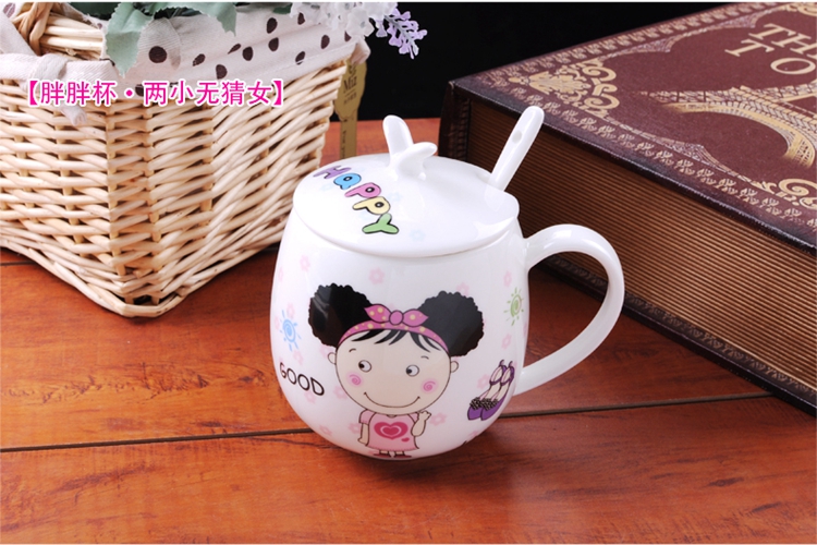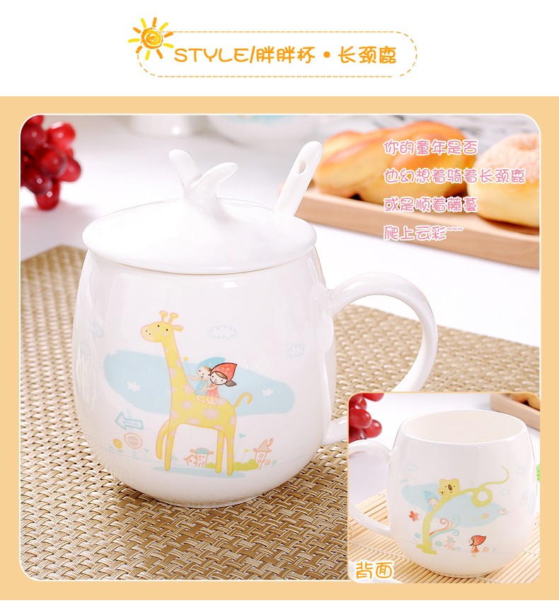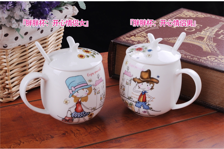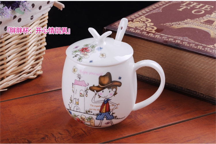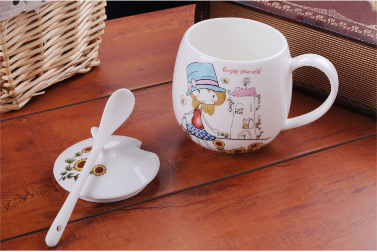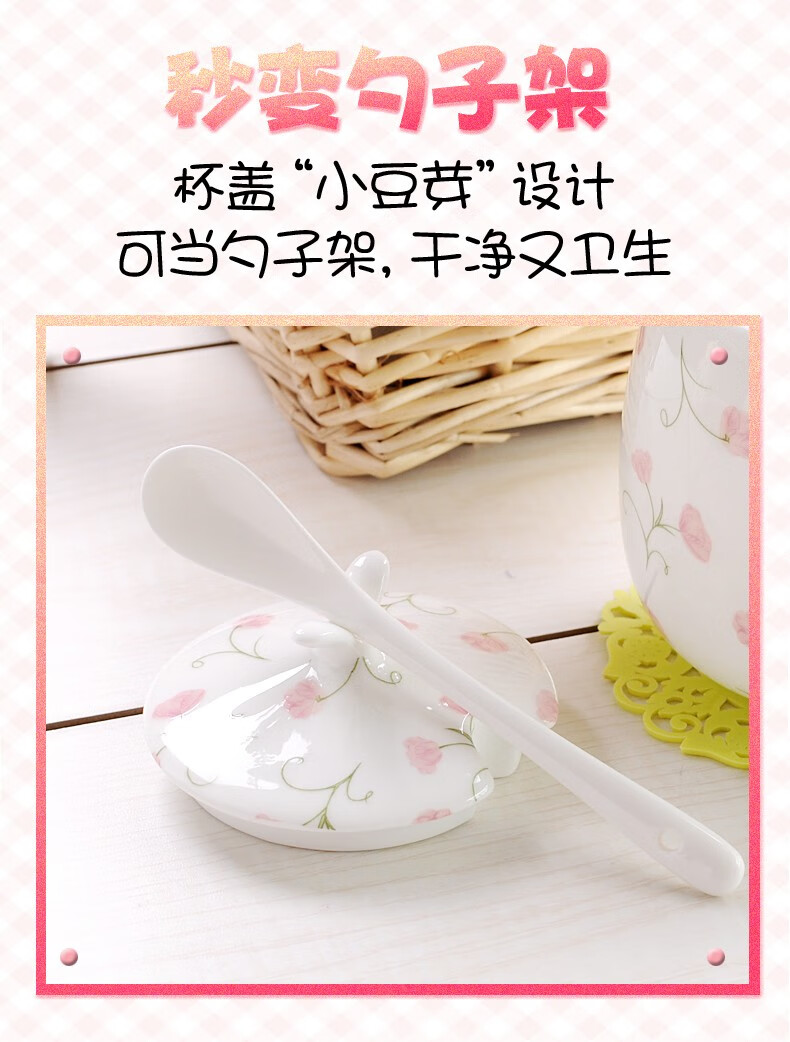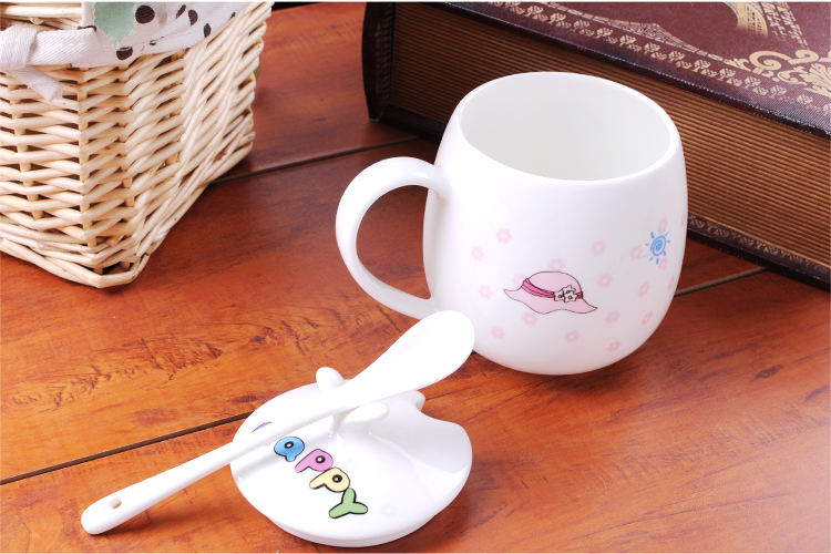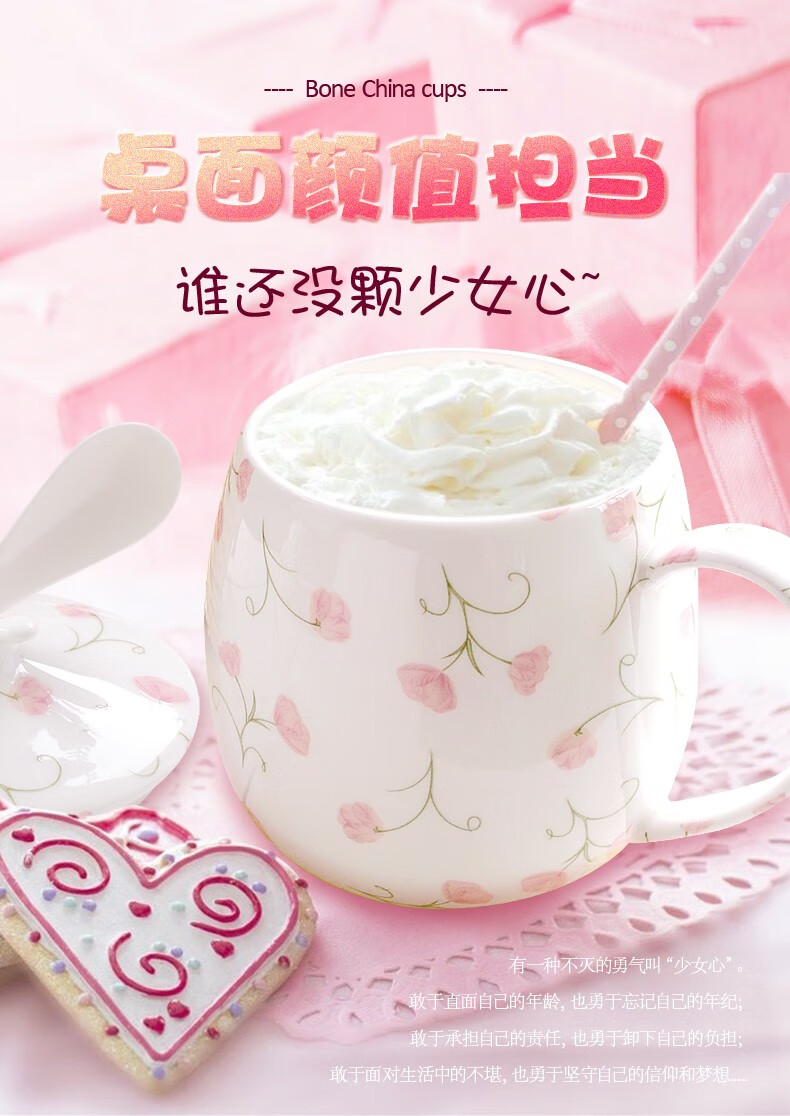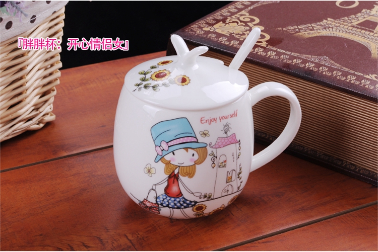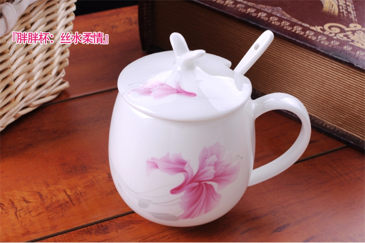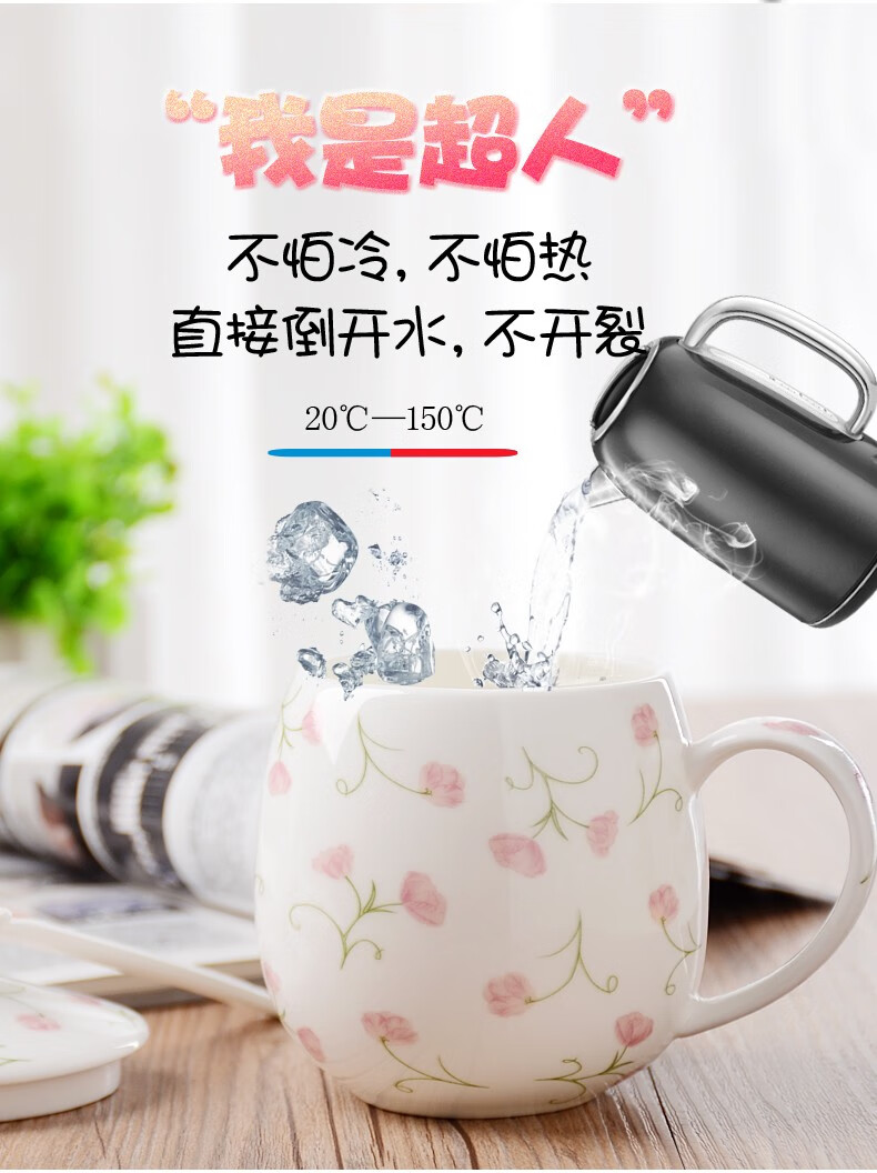 Houhai Cup Ceramic Cup Women's Mug with Lid and Spoon Household Drinking Cup Bone China Breakfast Cup Coffee Cup Girly Heart Fat Cup - Small Floral 400ML Microwaveable