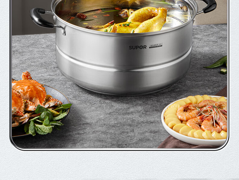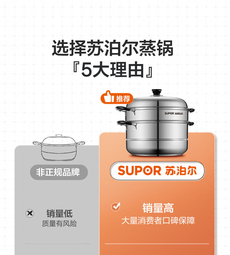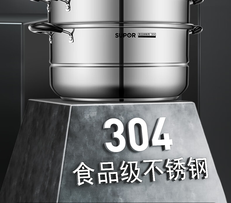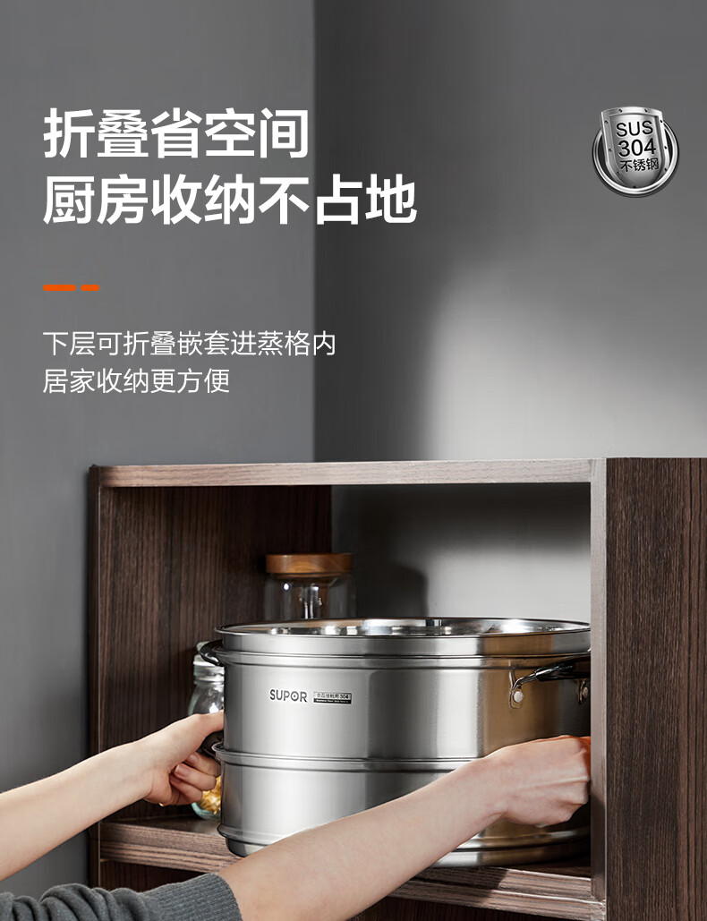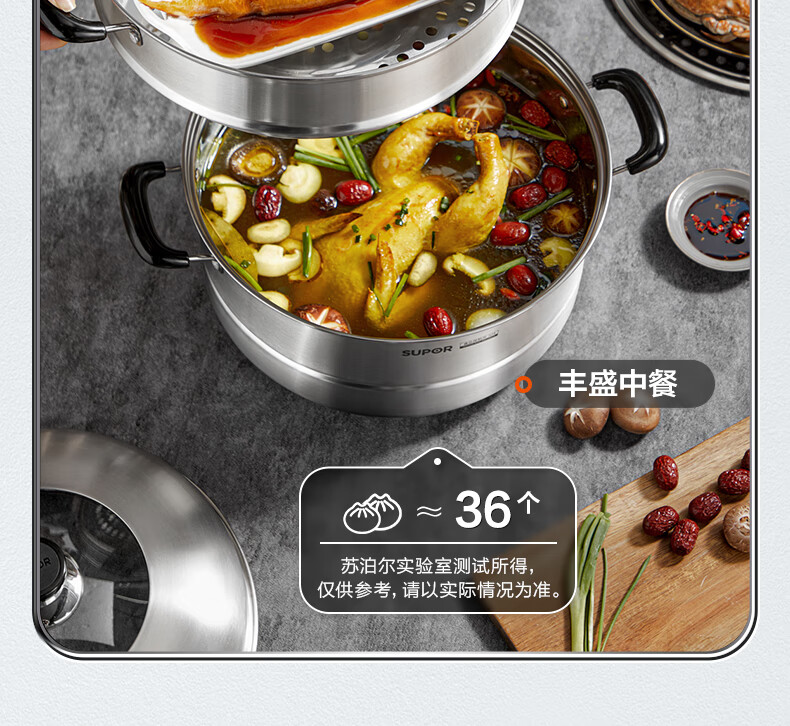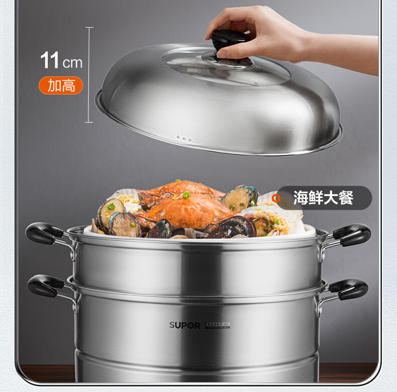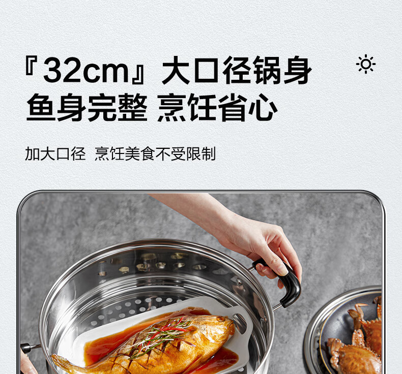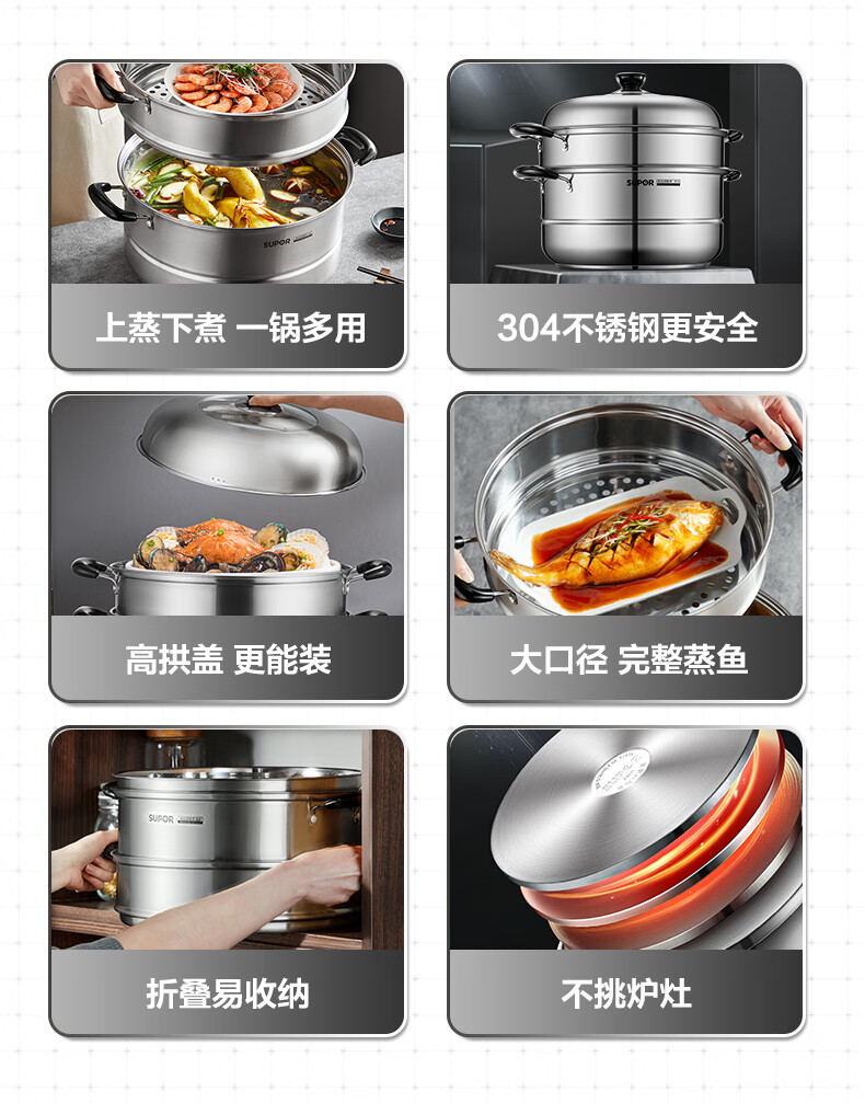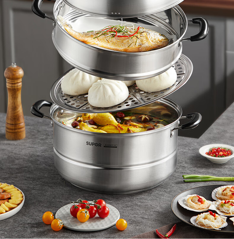 SUPOR large fish steamer double-layered large steamer thickened 304 stainless steel steamed buns universal gas stove induction cooker SZ32B5 diameter 32cm