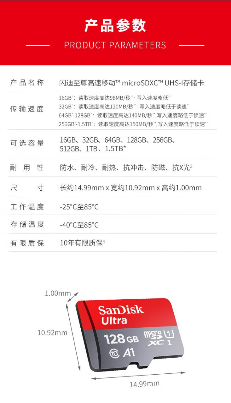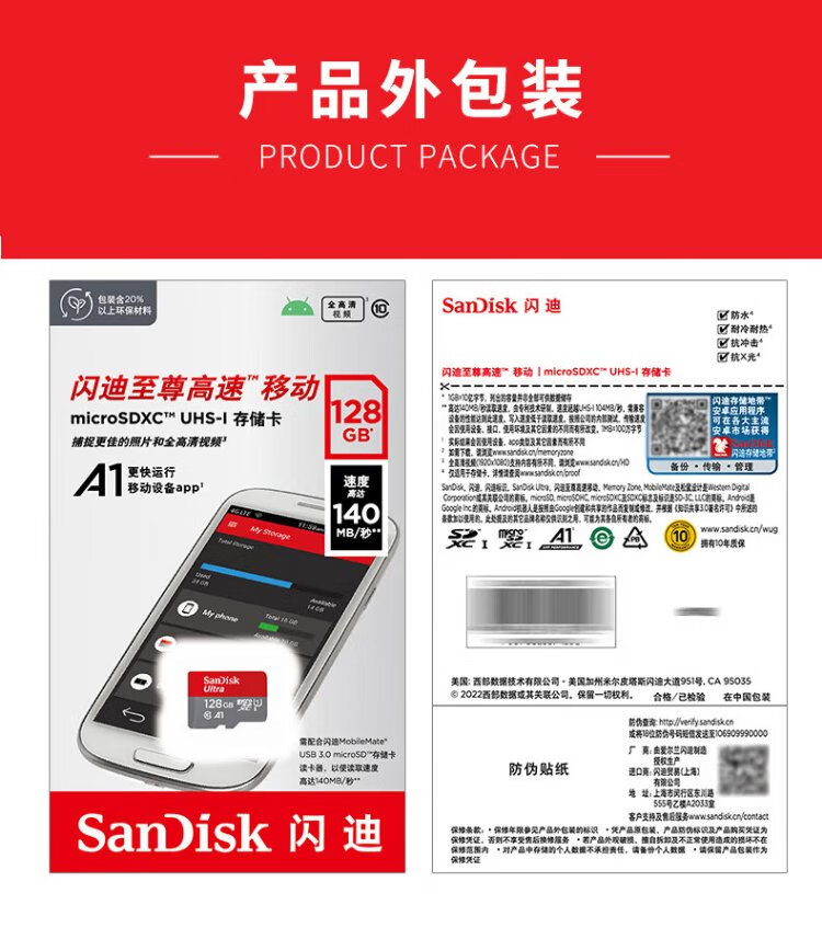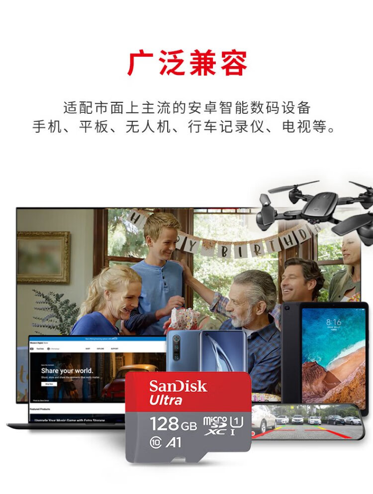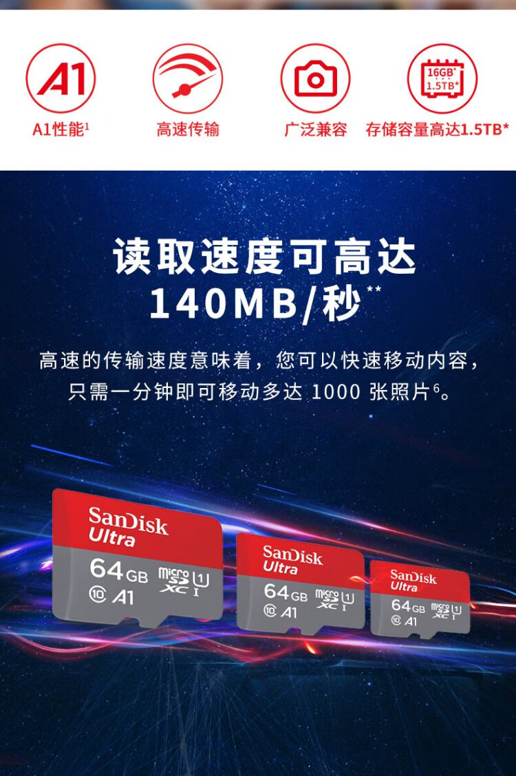 闪迪(SanDisk)128GB TF(MicroSD)内存卡 A1 U1 C10 至尊高速移动版存储卡 读速140MB/s 手机平板游戏机内存卡