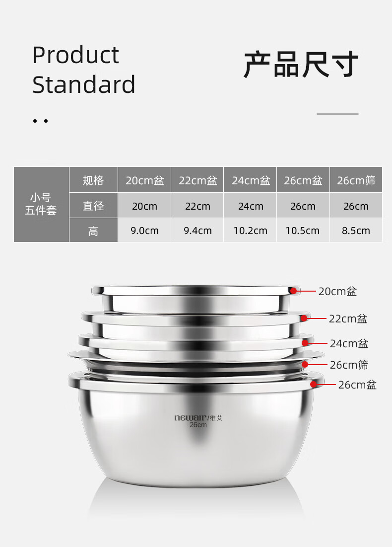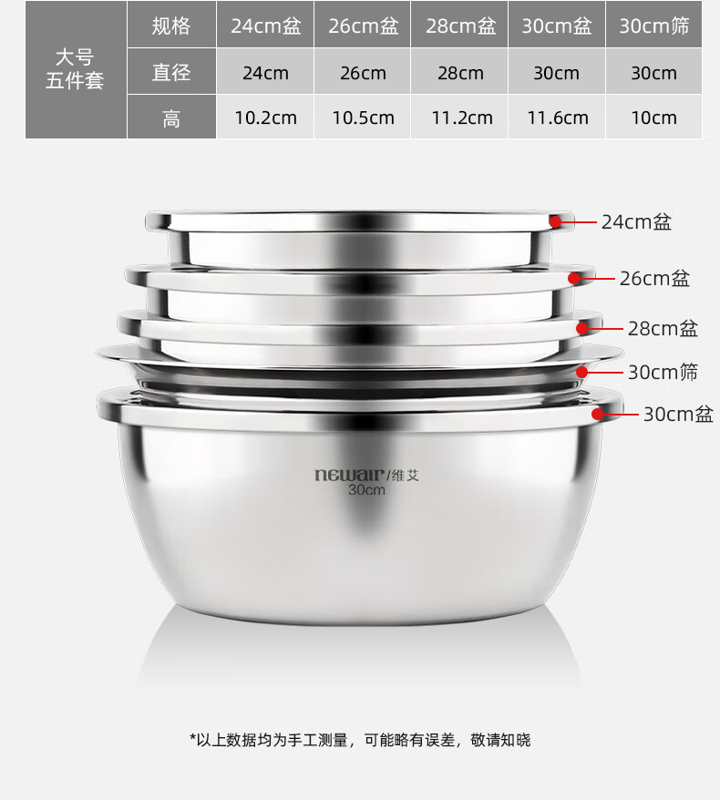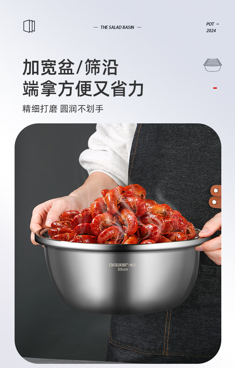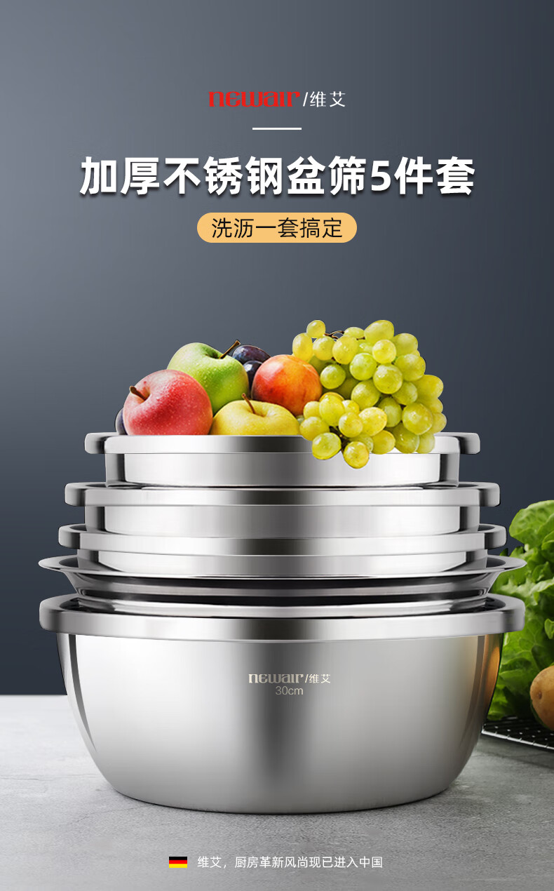 Newair stainless steel basin five-piece set, seasoning basin, rice washing basin and basin drain basket, salad basin, rice sieve and flavor bucket set