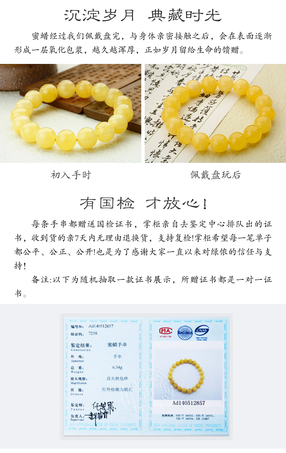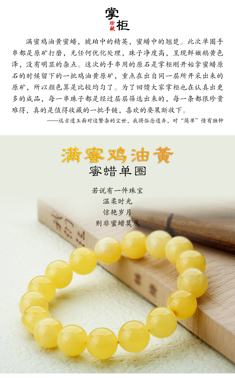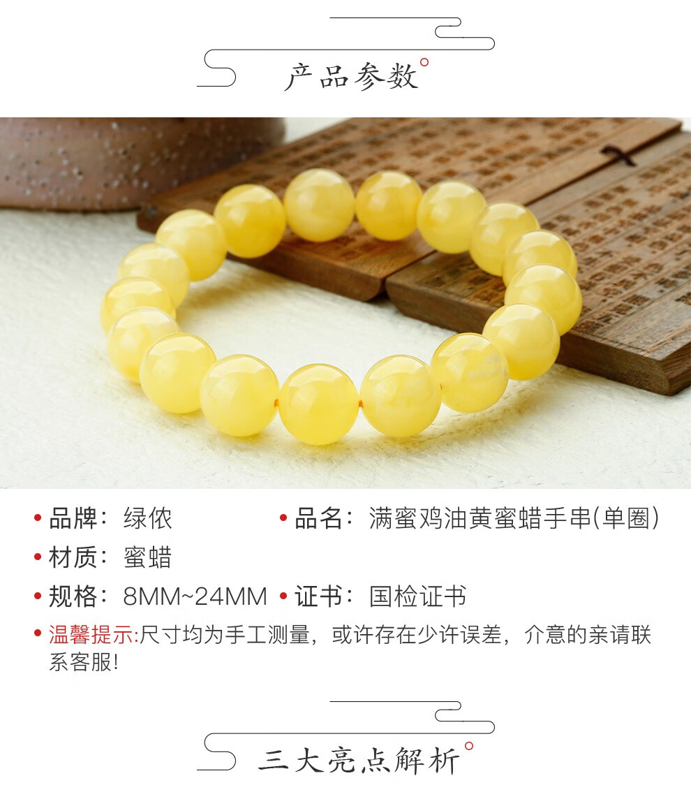 Lv Nong Jewelry New Honey Chicken Fat Yellow Beeswax Bracelet Worry-free No-Bake Color Bracelet Birthday Gift for Men and Women Diameter Approximately 8-8.5mm Single Circle/Certificate + Gift Box