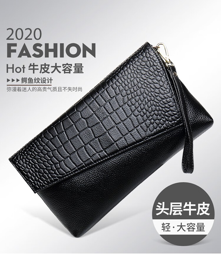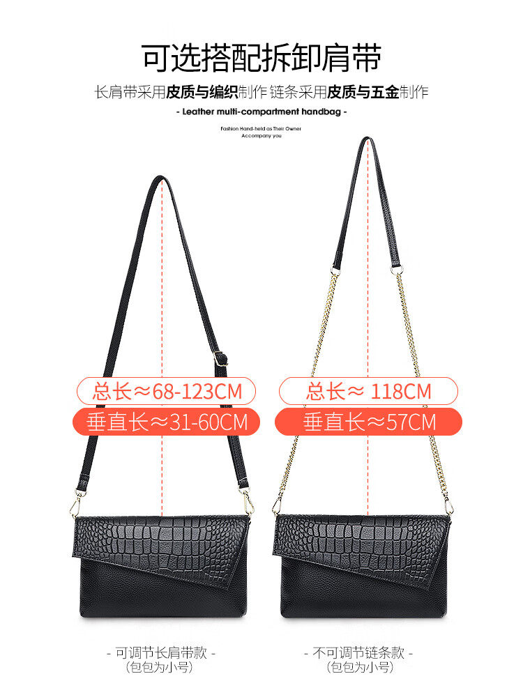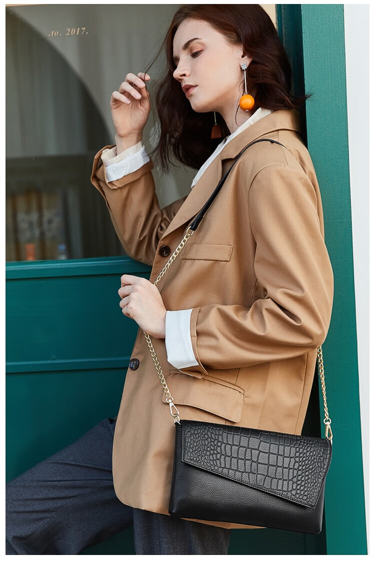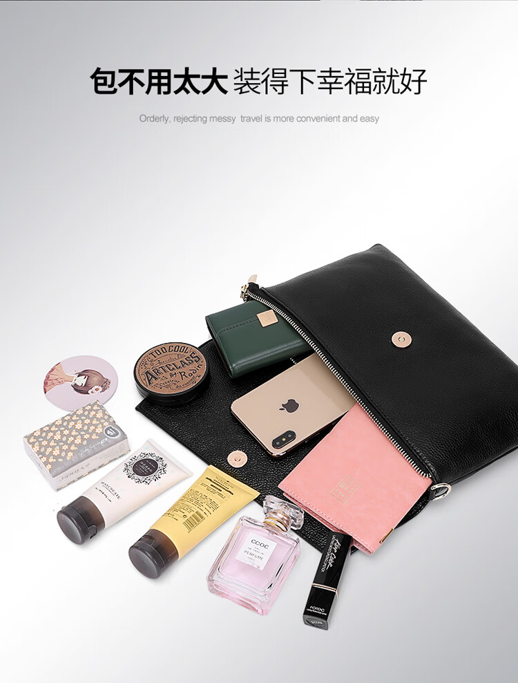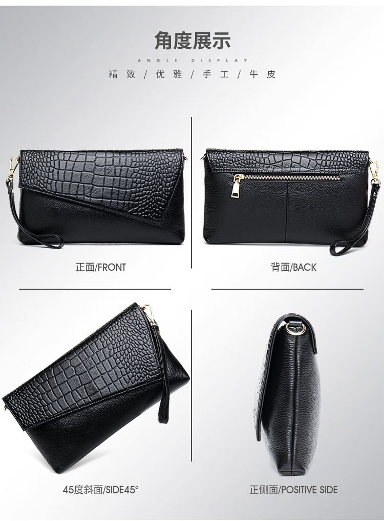 Qidell Clutch Women's Genuine Cowhide Elegant Women's Handbag Cowhide Multifunctional Clutch Bag New Trendy Single Crossbody Bag Women's Black Large Leather + Chain Shoulder Strap