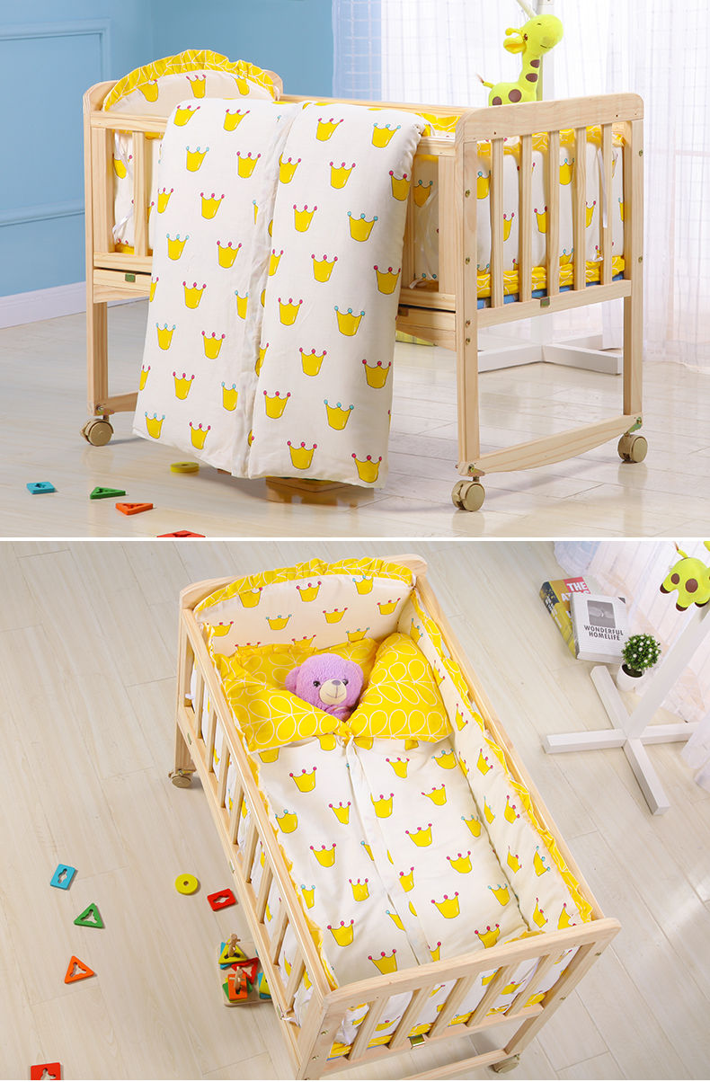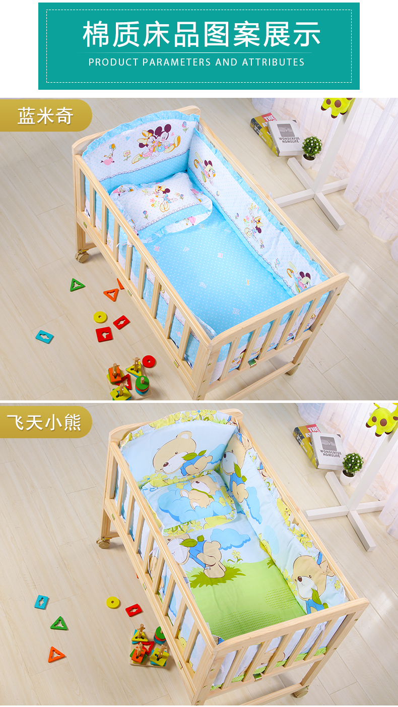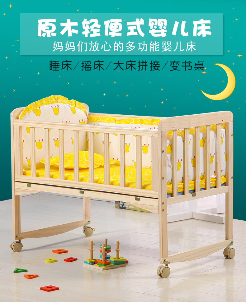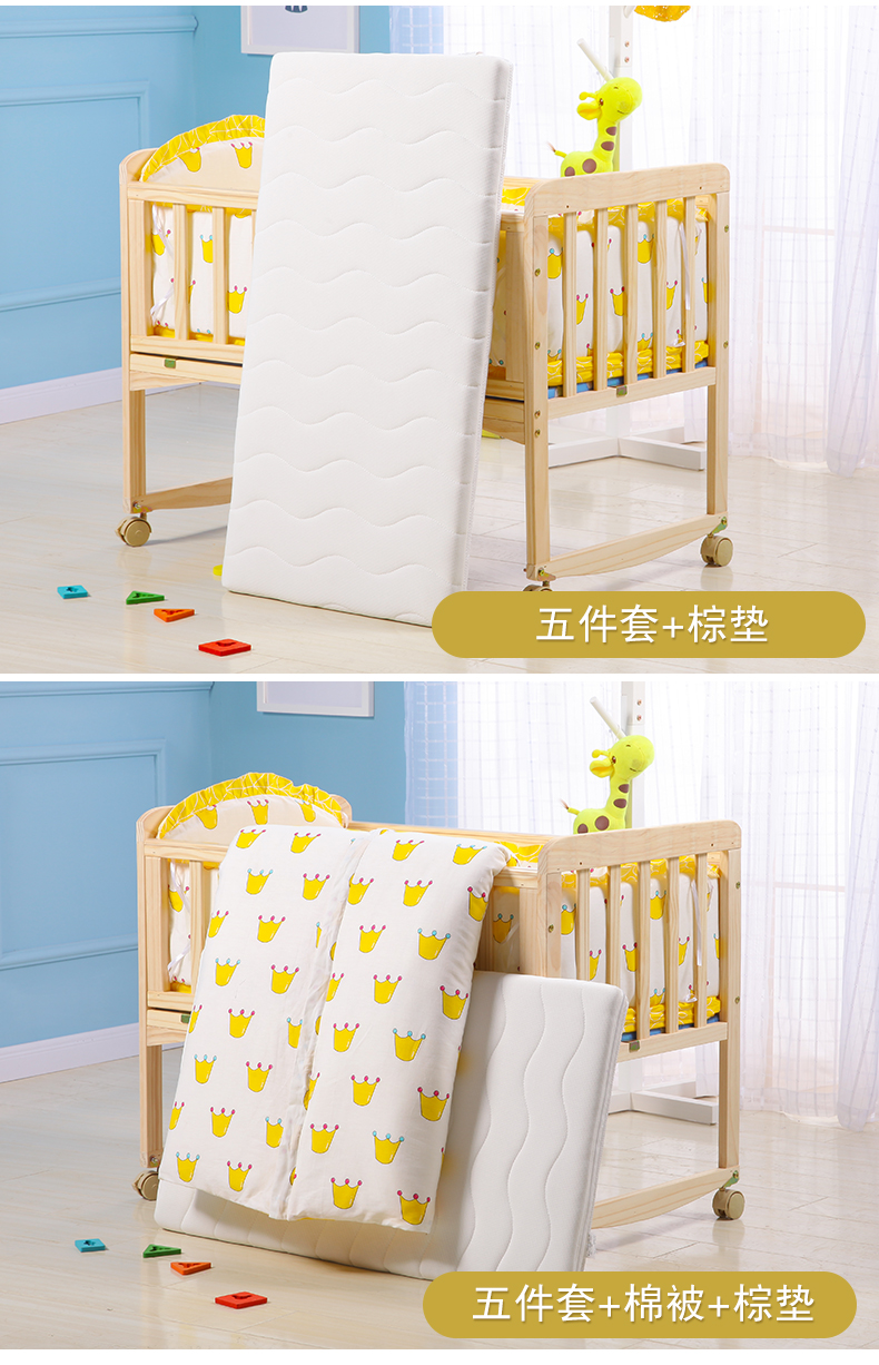 Laughing Beile solid wood crib baby cradle bed no paint variable desk can be turned sideways to merge with the adult bed small bed + mosquito net + pink Mickey five-piece set