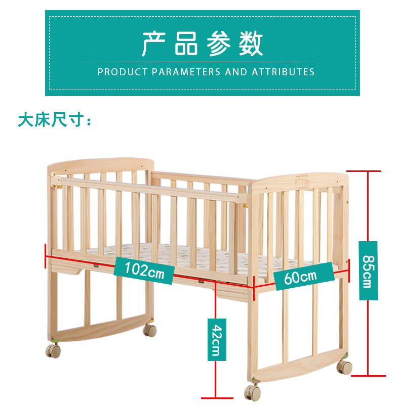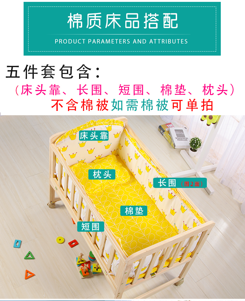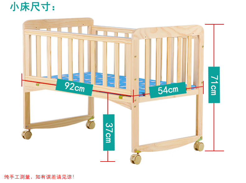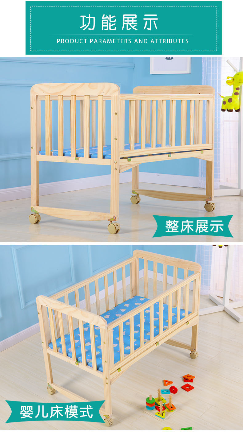 Laughing Beile solid wood crib baby cradle bed no paint variable desk can be turned sideways to merge with the adult bed small bed + mosquito net + pink Mickey five-piece set