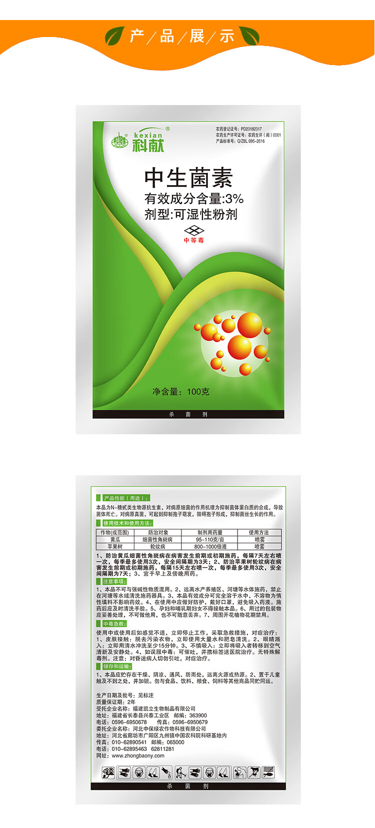 Zhongbao Zhongshengmycin Apple tree ring spot disease cucumber bacterial angular spot disease biopesticide fungicide 20g*1 bag