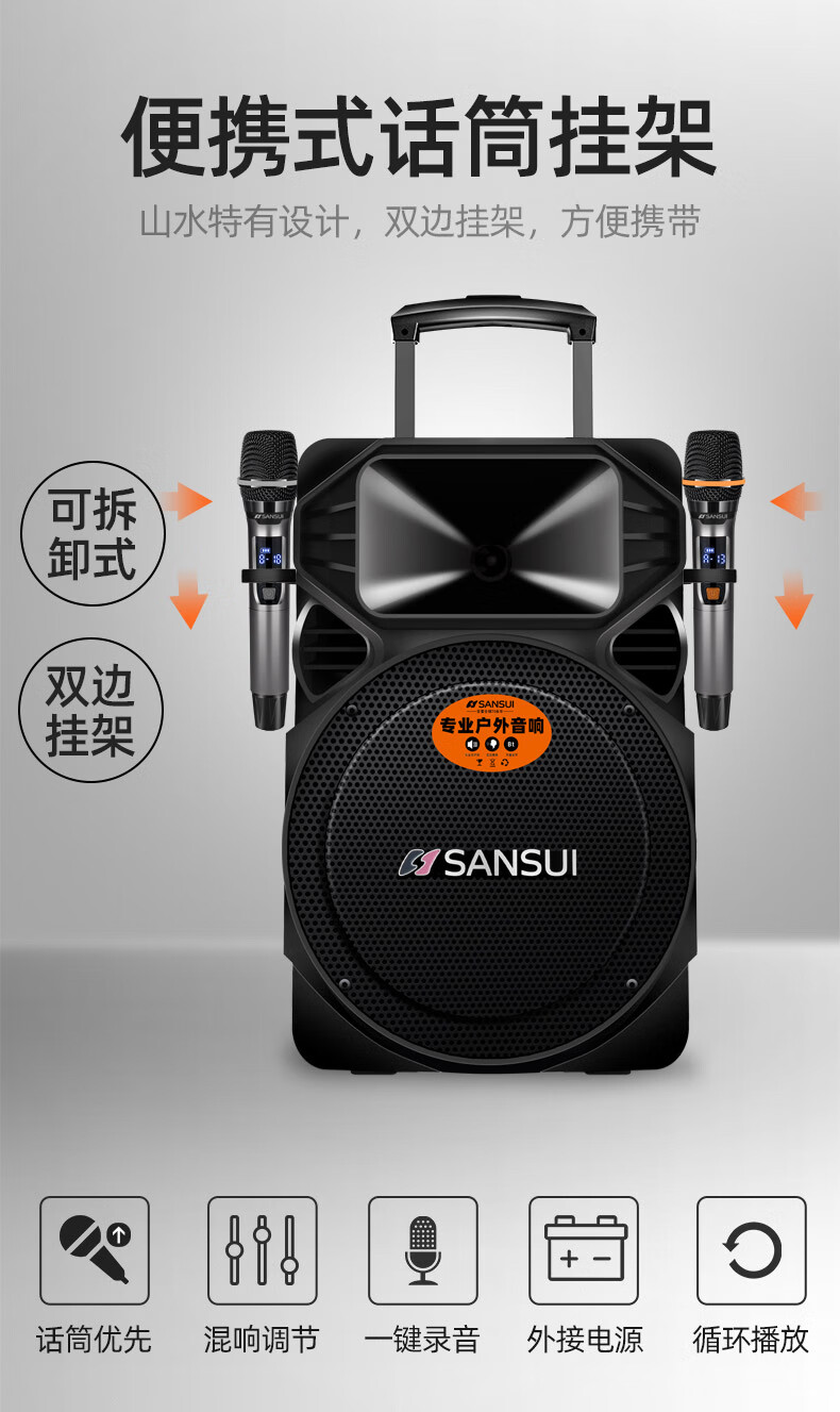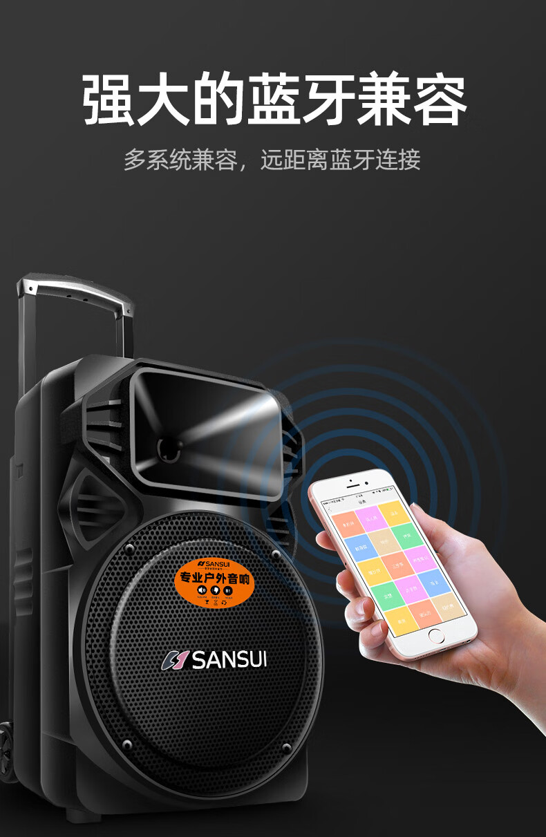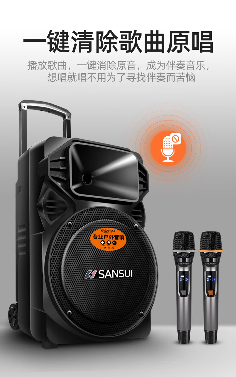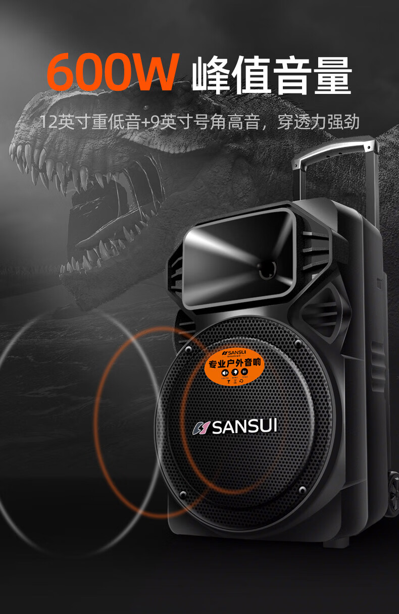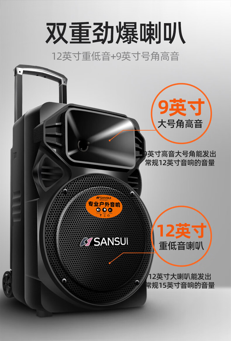 SANSUI square dance trolley audio speaker Bluetooth outdoor karaoke portable mobile stage performance 12-inch audio high-power high-fidelity waterproof home 12-inch subwoofer 30 hours + dual microphones