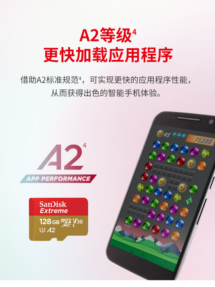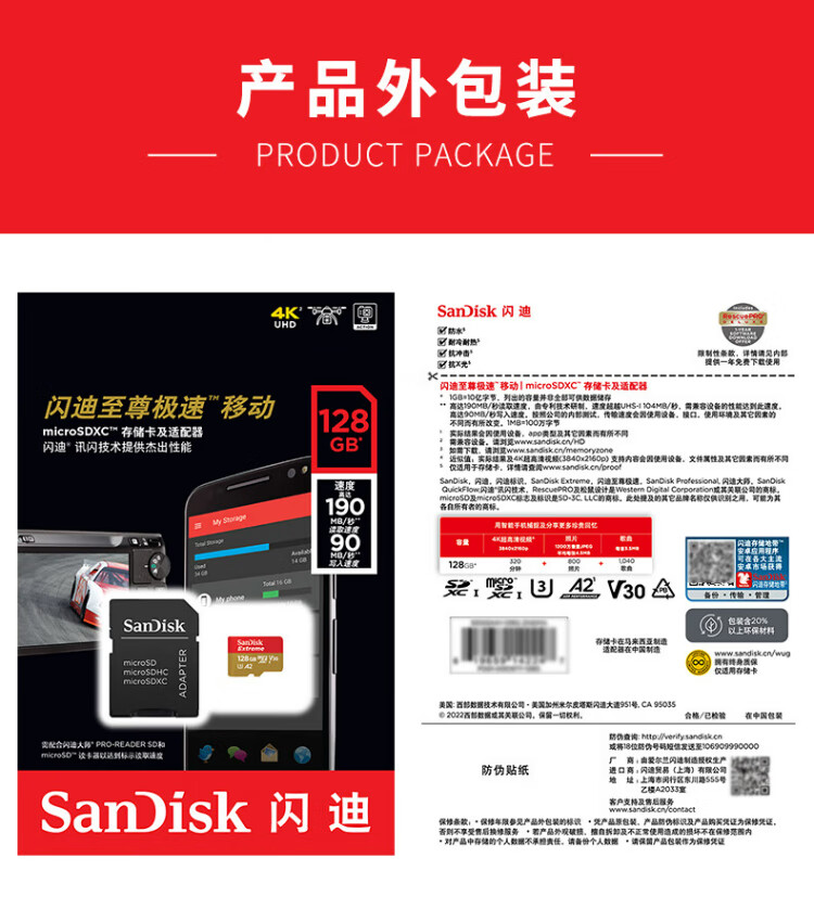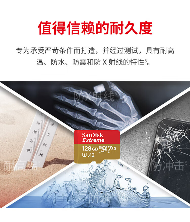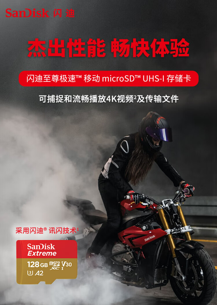 闪迪(SanDisk)128GB TF(MicroSD)内存卡 4K极速金卡A2 V30 U3行车记录仪 运动相机无人机 监控存储卡 读190MB/s