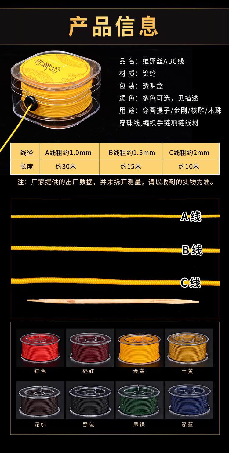 Veena silk braided thread, Wenwan thread, wear-resistant and non-elastic Buddha bead thread, bracelet rope, jade thread, Vajra star and moon bodhi beaded rope, golden yellow, double box of Veena silk A thread 1.0
